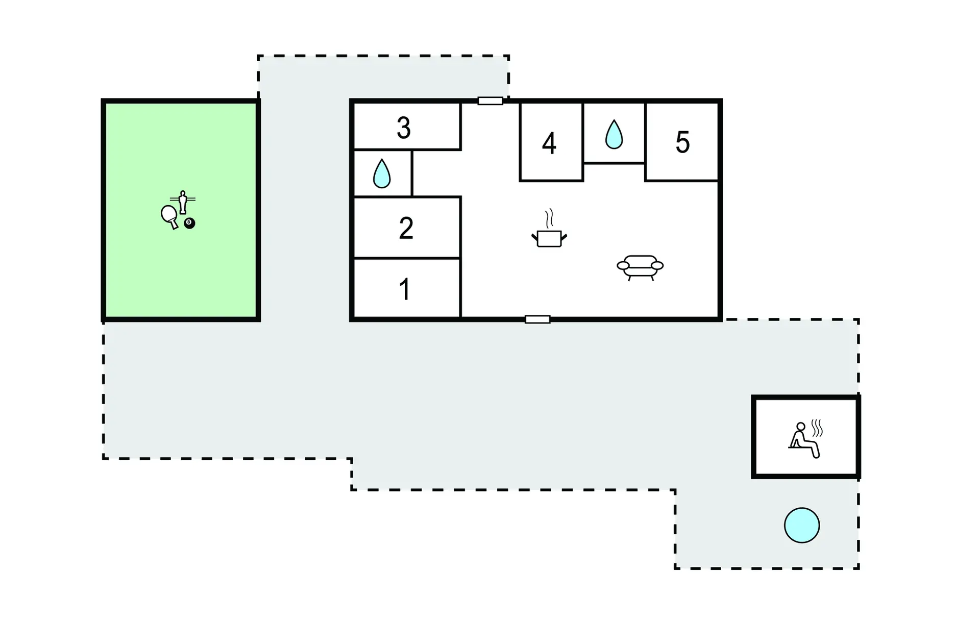 Nehmen Sie Platz auf dem bequemen Sofa im Wohnraum und lassen Sie den Blick durch die großen Fenster über die umliegende Landschaft schweifen. Oder entspannen Sie in den komfortablen Sesseln und machen Sie es sich mit einem Buch gemütlich. Nutzen Sie den offenen Küchen- und Essbereich für gemeinsame Kochabende. Bereiten Sie Ihre Mahlzeiten in der hochwertig ausgestatteten Küche mit Kochinsel zu. Verbringen Sie gesellige Stunden am großen Esstisch oder fordern Sie sich gegenseitig im Aktivitätsraum mit Billard, Airhockey und Darts heraus.