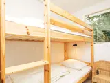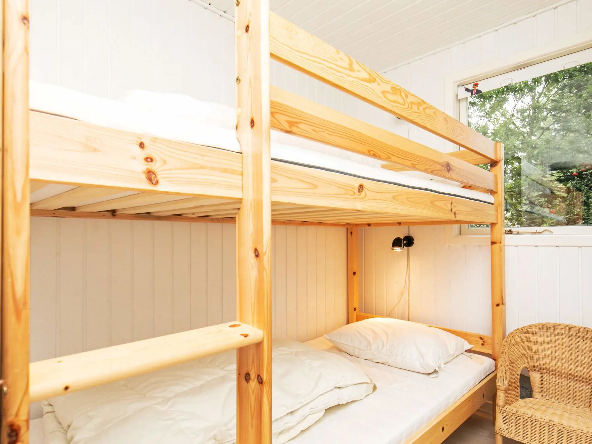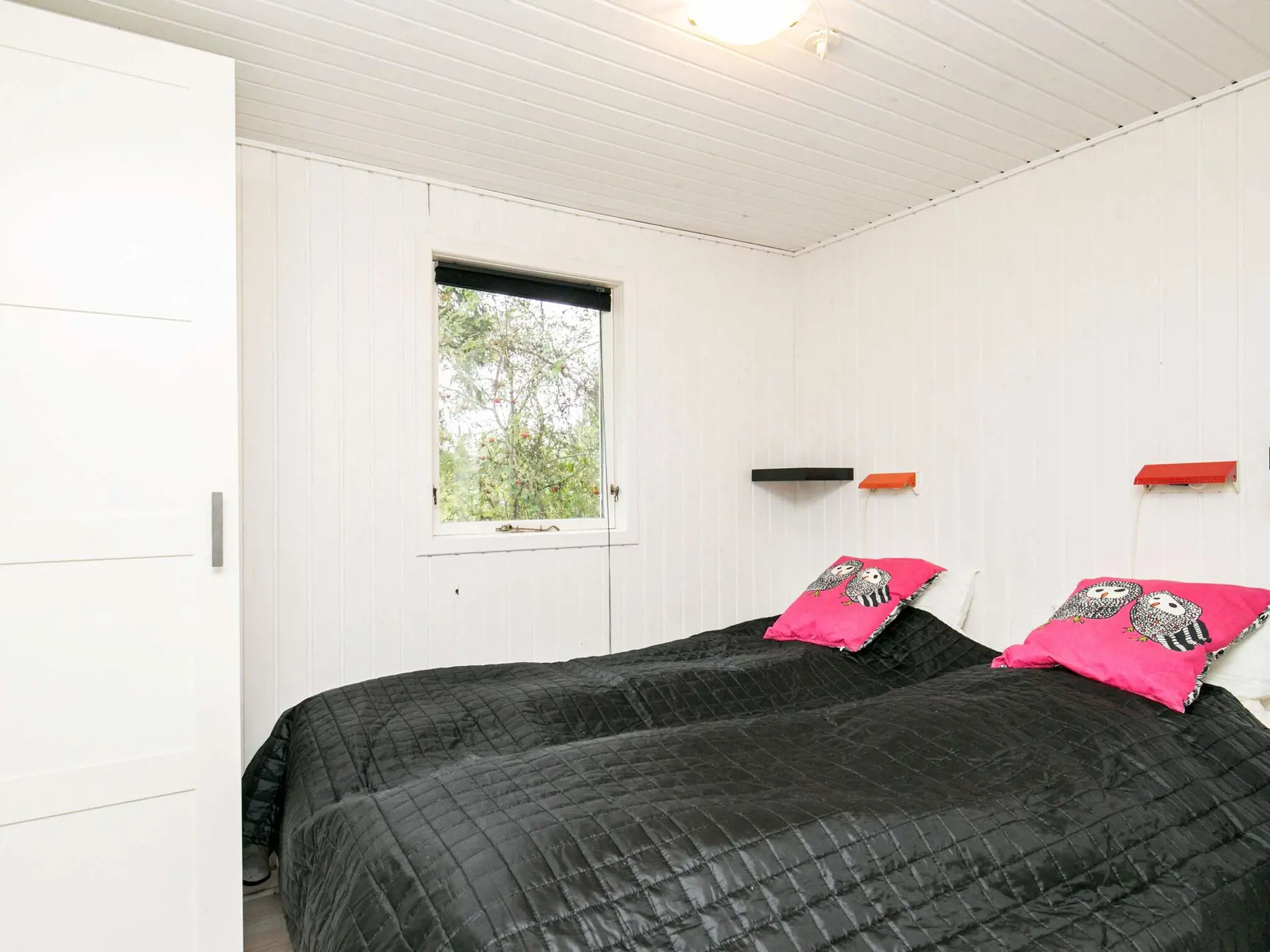 Das gepflegte Holzhaus wirkt hell und einladend. Es bietet ein Schlafzimmer mit Doppelbett und Schränken, ein Kinderzimmer mit zwei Kojen und einem Zustellbett, ein kleineres Badezimmer mit Dusche und einen hellen, offenen Küchen-/Wohnbereich für das Familienleben. Nebenan auf dem Grundstück steht zudem ein kleiner Annex mit zwei weiteren Schlafplätzen als Ausweichmöglichkeit. Das Ferienhaus liegt auf einem schönen Naturgrundstück mit Rasenfläche und Bäumen. Vom Grundstück führt ein kleiner Pfad hinunter ans Wasser.