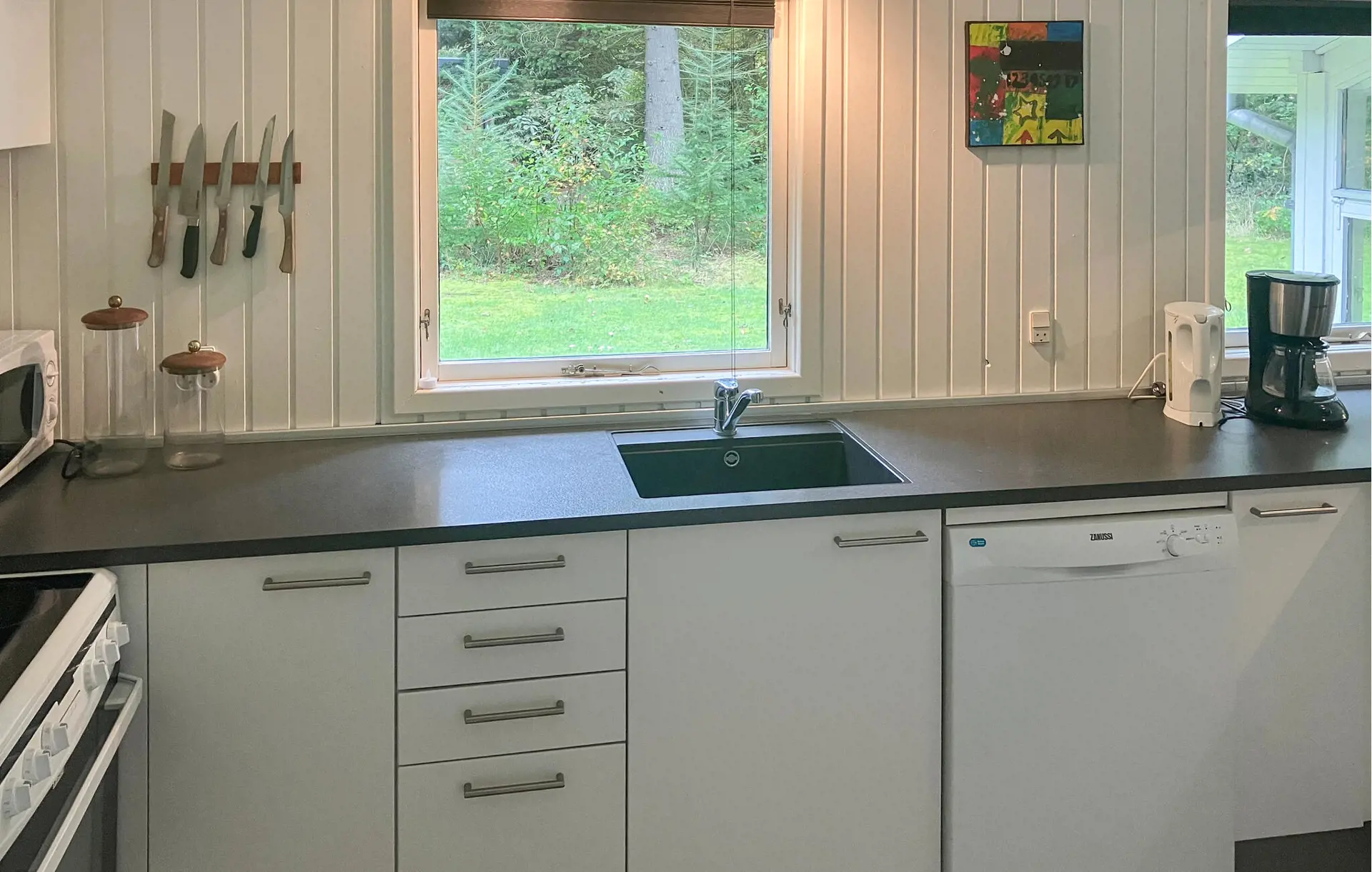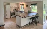 Verbringen Sie eine ruhige Auszeit in diesem hellen und gepflegten Ferienhaus, das auf einem herrlich bewachsenen Naturgrundstück liegt. Genießen Sie die freundliche Atmosphäre im offenen Wohnraum mit großen Fenstern, die viel Licht hereinlassen. Essbereich, Küche und Wohnzimmer sind harmonisch miteinander verbunden. Machen Sie es sich auf dem Ecksofa gemütlich, lesen Sie ein Buch oder schauen Sie fern. In der modernen Küche mit Barhockern finden Sie alles, was Sie für das gemeinsame Kochen benötigen. Der Essbereich mit Blick ins Grüne lädt zum Verweilen und zu langen Mahlzeiten ein.