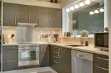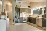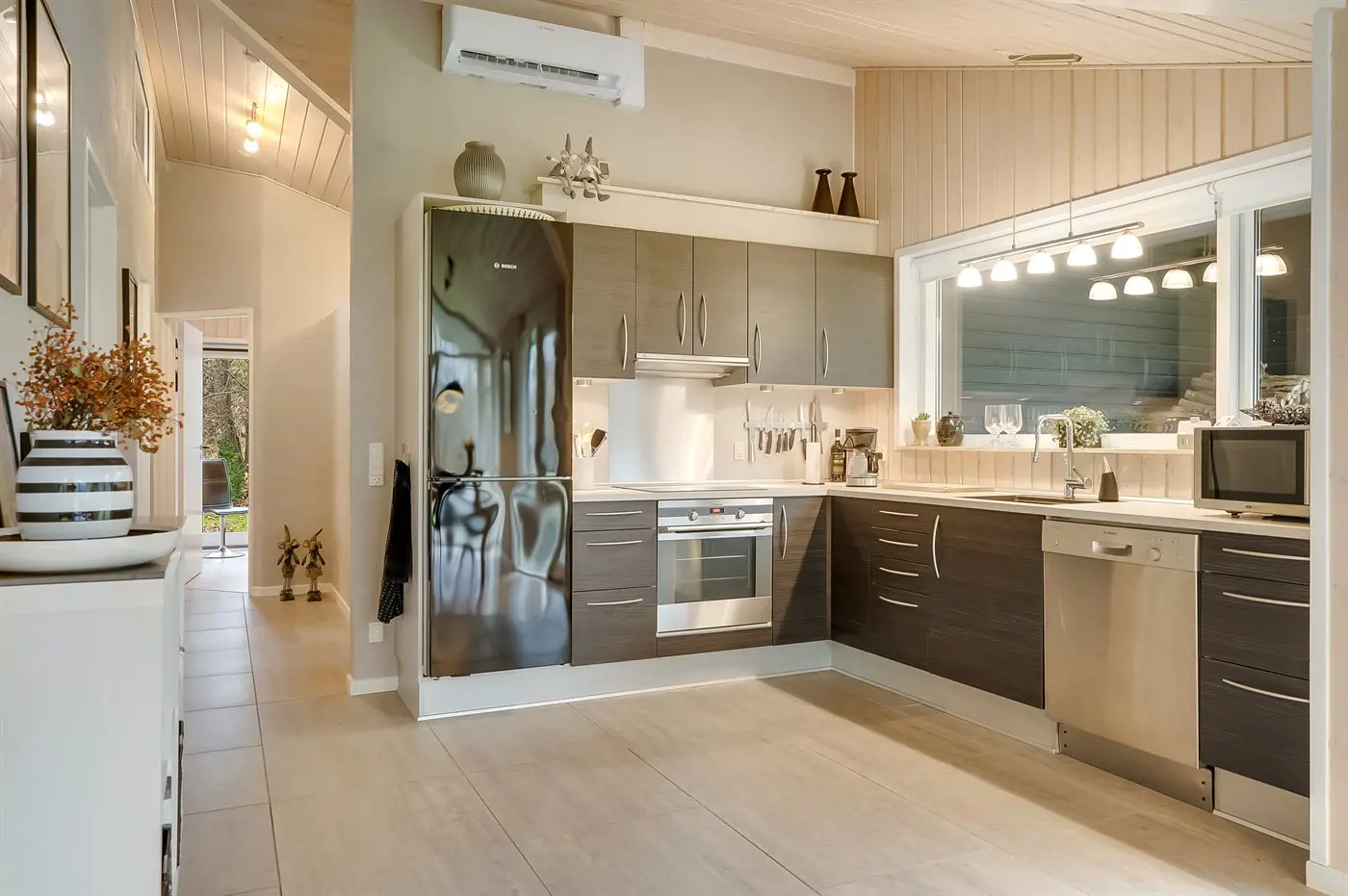 Die Küche ist mit Kühlschrank ausgestattet. Außerdem gibt es 4 elektrische Kochplatten, Umluftofen, Mikrowelle sowie Geschirrspüler. Fußbodenheizung in der Küche.