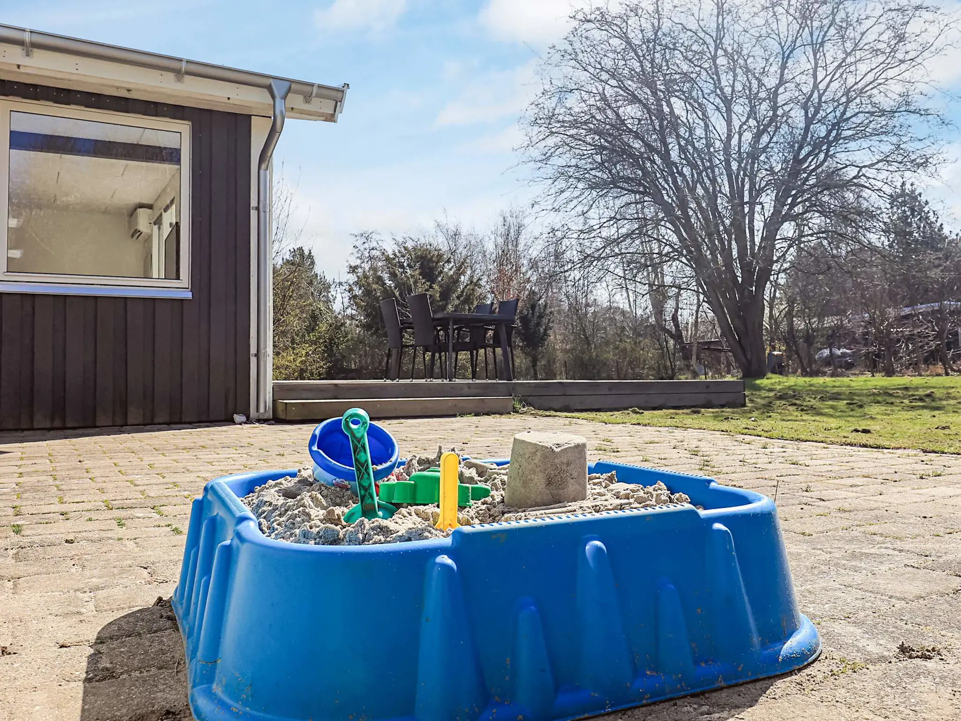 Vom Wohnzimmer aus hat man Zugang zur überdachten Terrasse und der großen Holzterrasse. Das Grundstück ist 800 m2 groß, sodass genügend Platz für ein kleines Ballspiel sowie eine Schaukel und ein Sandkasten für die kleinen Gäste vorhanden sind. Oder verbringen Sie die Zeit in einer der vier Sonnenliegen oder der Hängematte.