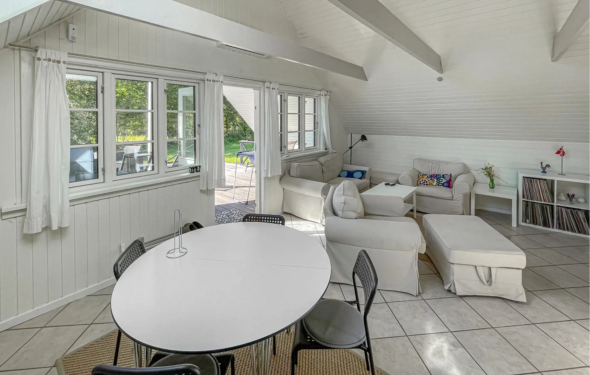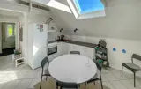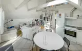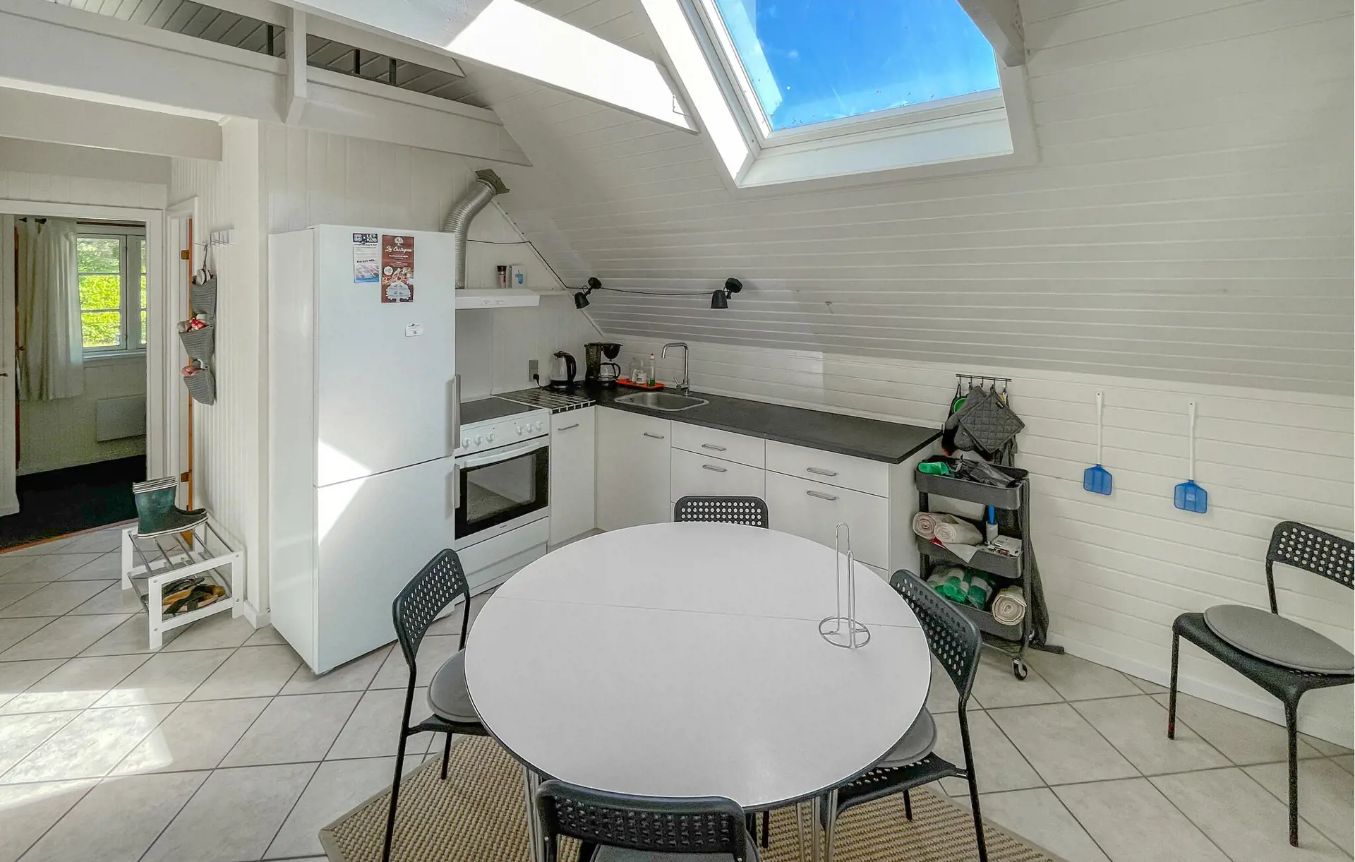 Machen Sie es sich in dem hellen Wohnbereich gemütlich. Entspannen Sie auf den bequemen Sofas und nutzen Sie die offene Gestaltung, die Wohnzimmer, Küche und Essbereich miteinander verbindet. Bereiten Sie Ihre Mahlzeiten in der praktischen Küche zu und genießen Sie sie unter einem großen Dachfenster, das viel Tageslicht hereinlässt. Entdecken Sie auch den kleinen Schlafboden, der über eine Leiter erreichbar ist, und nutzen Sie den Raum als Rückzugsort.