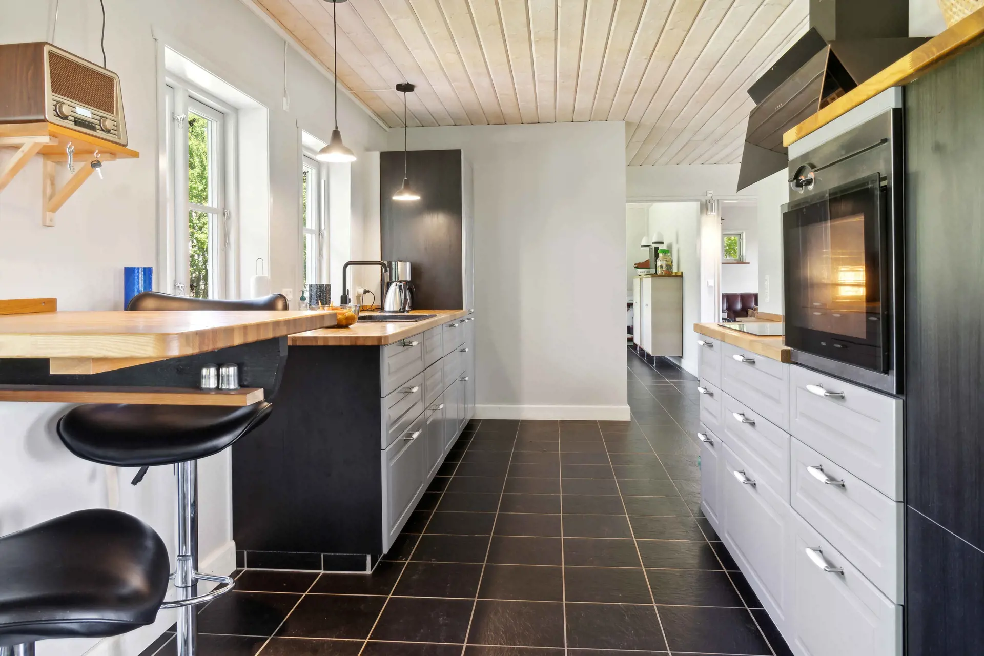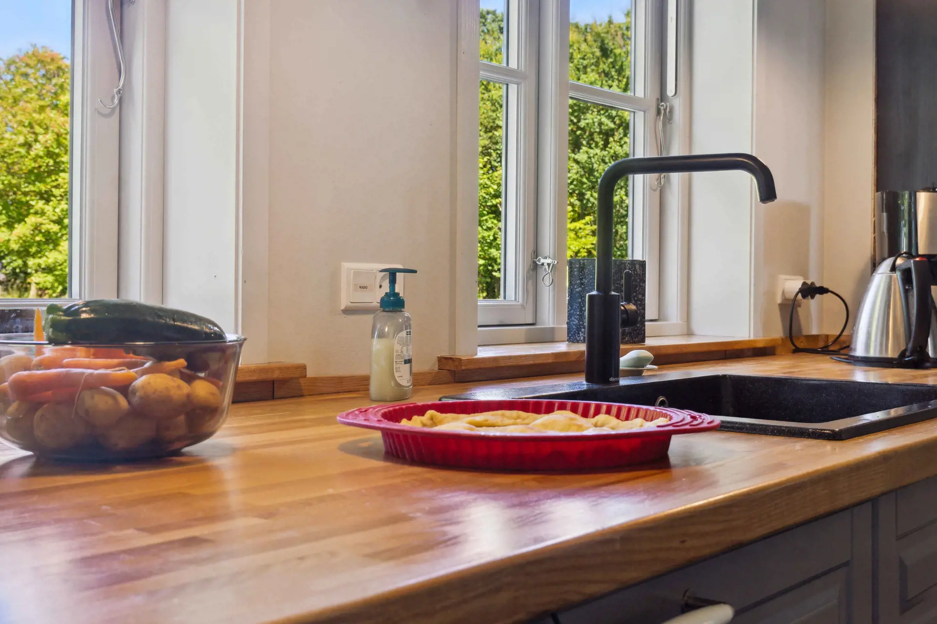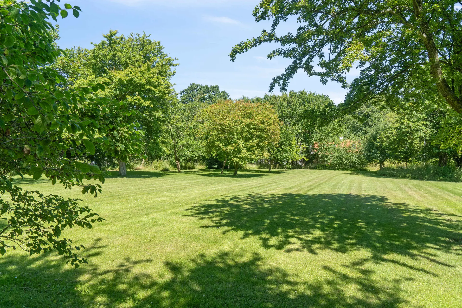 Die Küche ist mit integriertem Kühl-/Gefrierschrank und Geschirrspüler ausgestattet. Draußen gibt es große Terrassen zur Straße und zum Garten mit Grill und guten Gartenmöbeln. Auf dem Grundstück stehen ein Shelter, Bänke und eine Feuerstelle – ideal für lange Tage im Freien.