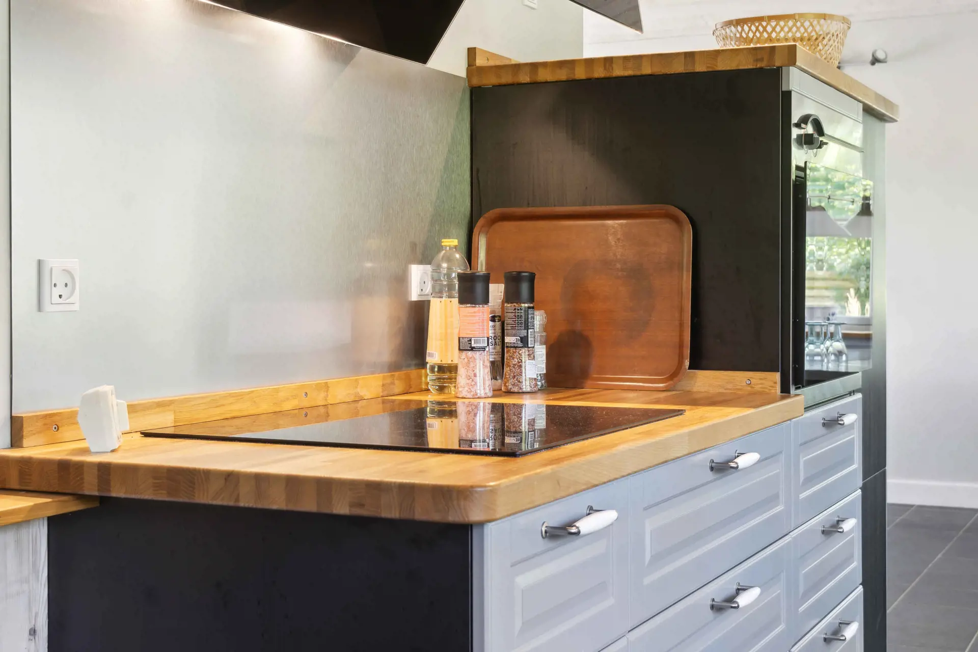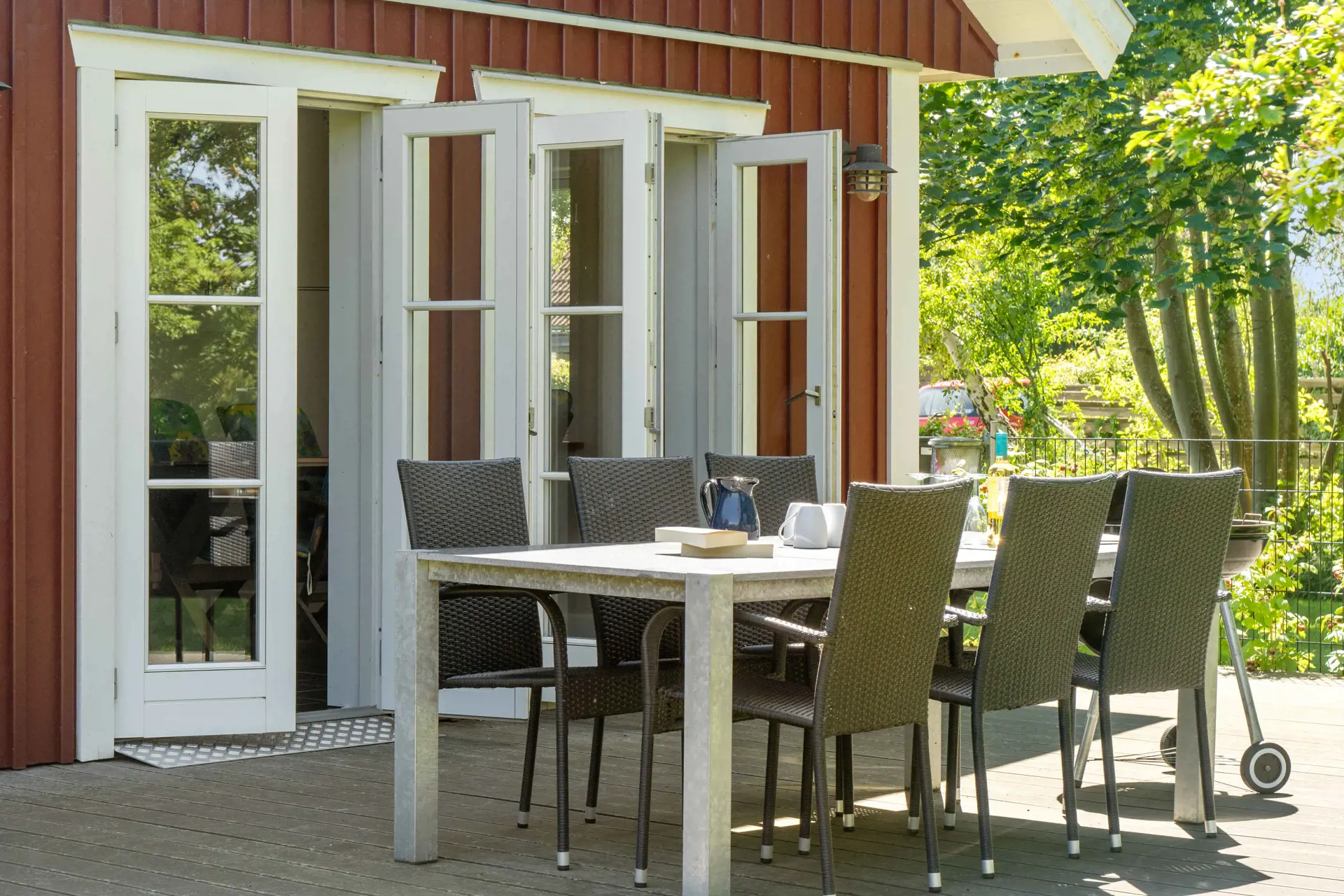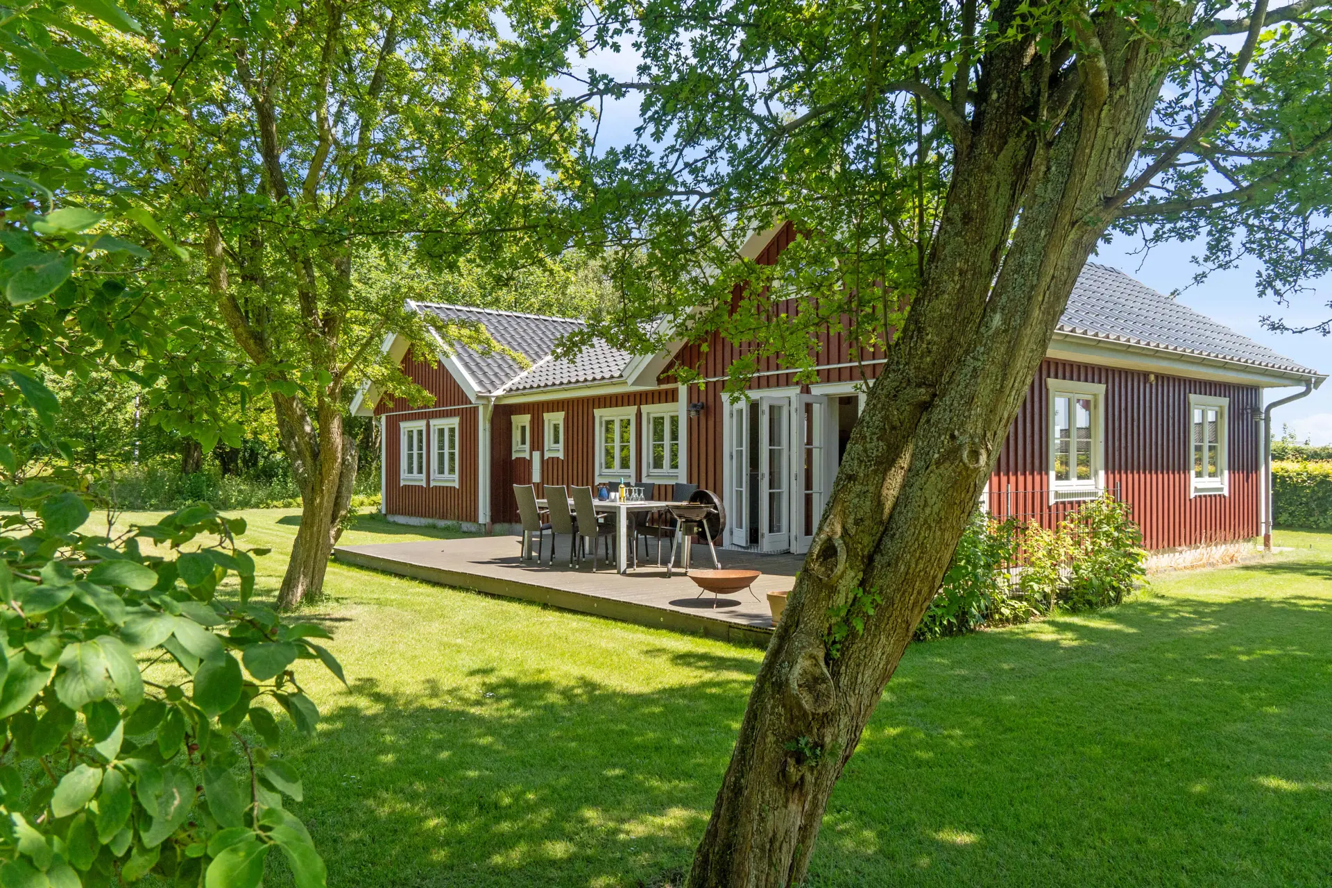 Die Küche ist mit integriertem Kühl-/Gefrierschrank und Geschirrspüler ausgestattet. Draußen gibt es große Terrassen zur Straße und zum Garten mit Grill und guten Gartenmöbeln. Auf dem Grundstück stehen ein Shelter, Bänke und eine Feuerstelle – ideal für lange Tage im Freien.