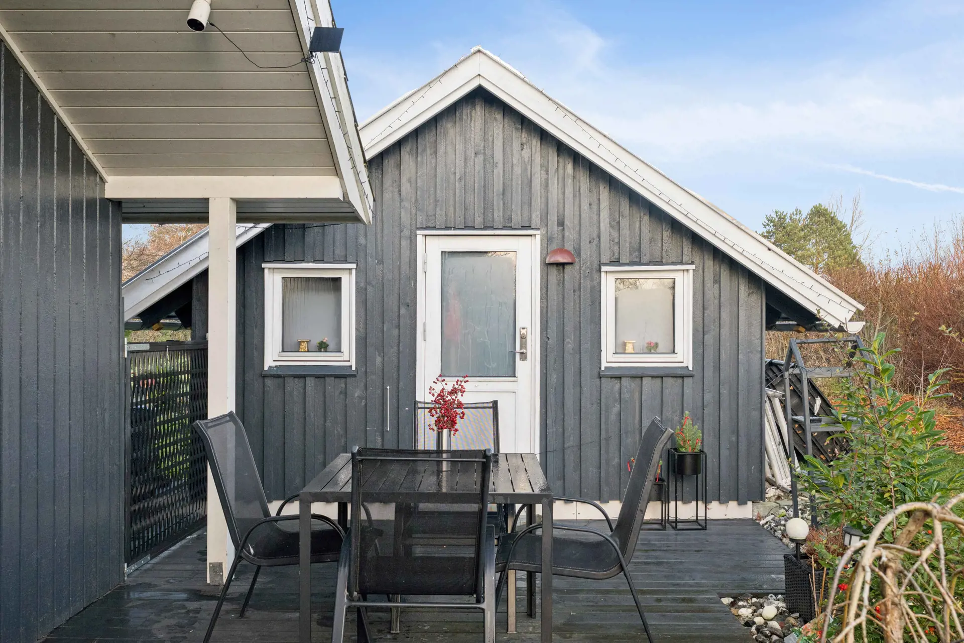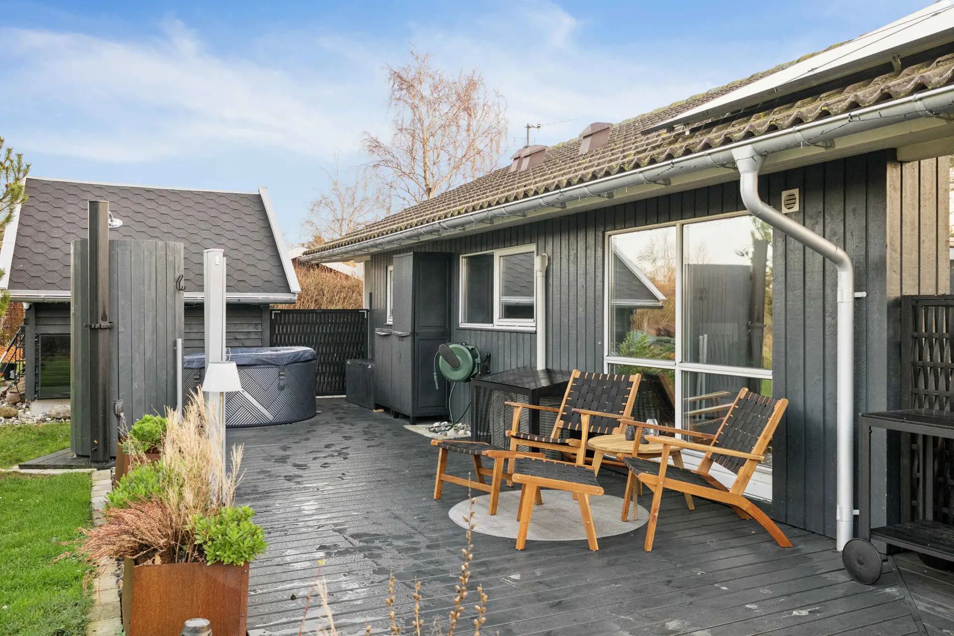 Vor der Haustür gibt es ebenfalls einen schönen Terrassenbereich mit Morgensonne. Vom westlichen Teil der Terrasse aus kann man eine Außendusche und einen Außen-Whirlpool für 6 Personen genießen.