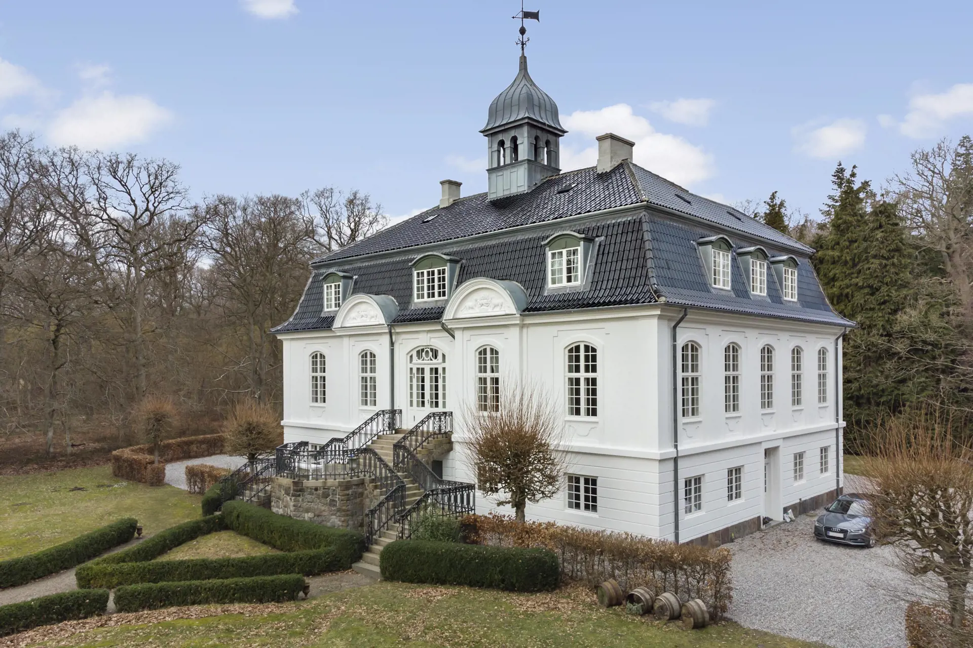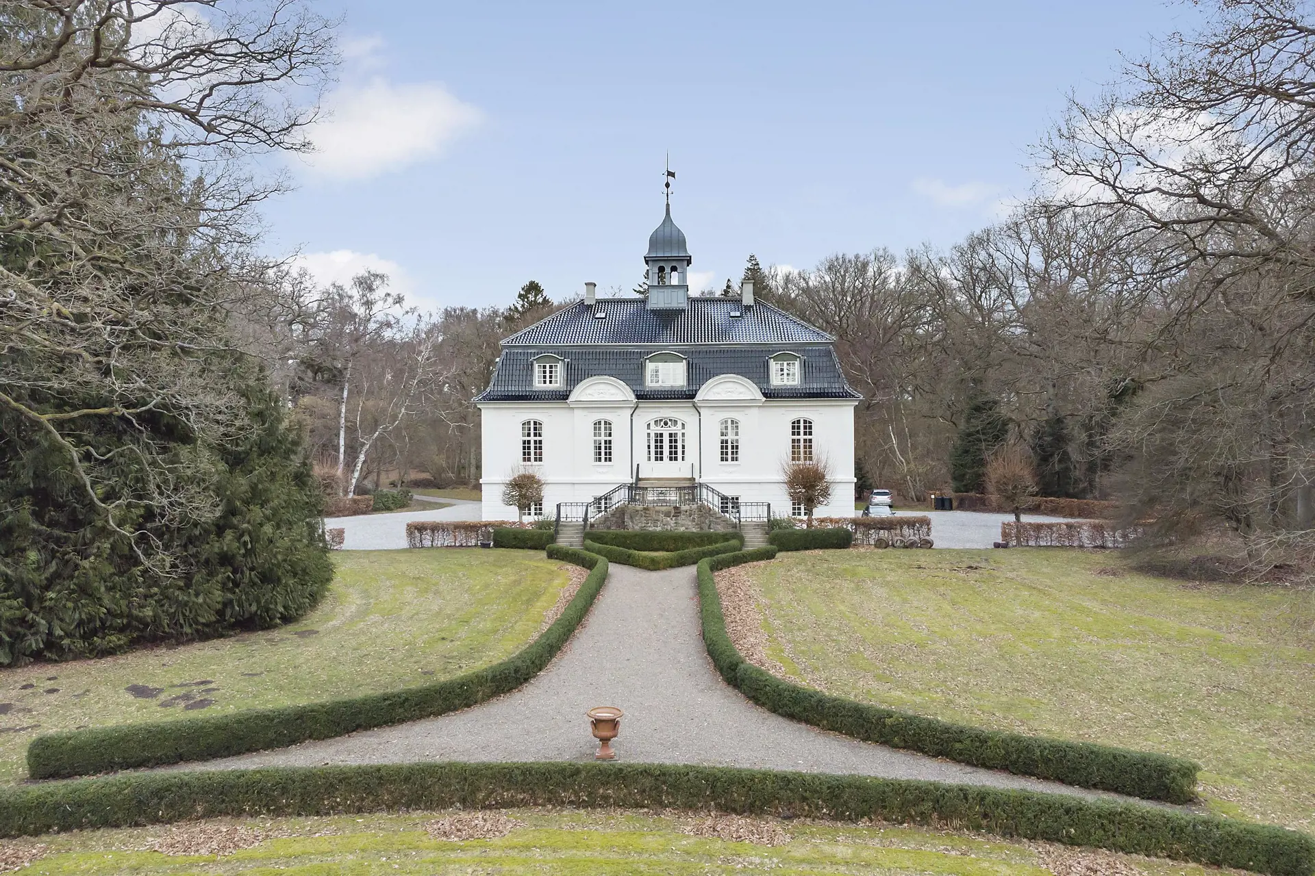 Das attraktive Weiße Palais mit seinem schwarzen Ziegeldach wurde im Jahr 1920 im kleinblättrigen Lindeskov erbaut - mitten im hügeligen Terrain Lollands. Nur 600 Meter hinter dem Anwesen erstreckt sich bereits die Ostsee. Dänemarks faszinierende Hauptstadt Kopenhagen liegt 175 Kilometer von Schloss Vindeholme entfernt.