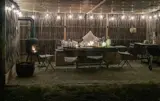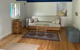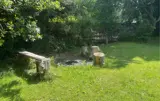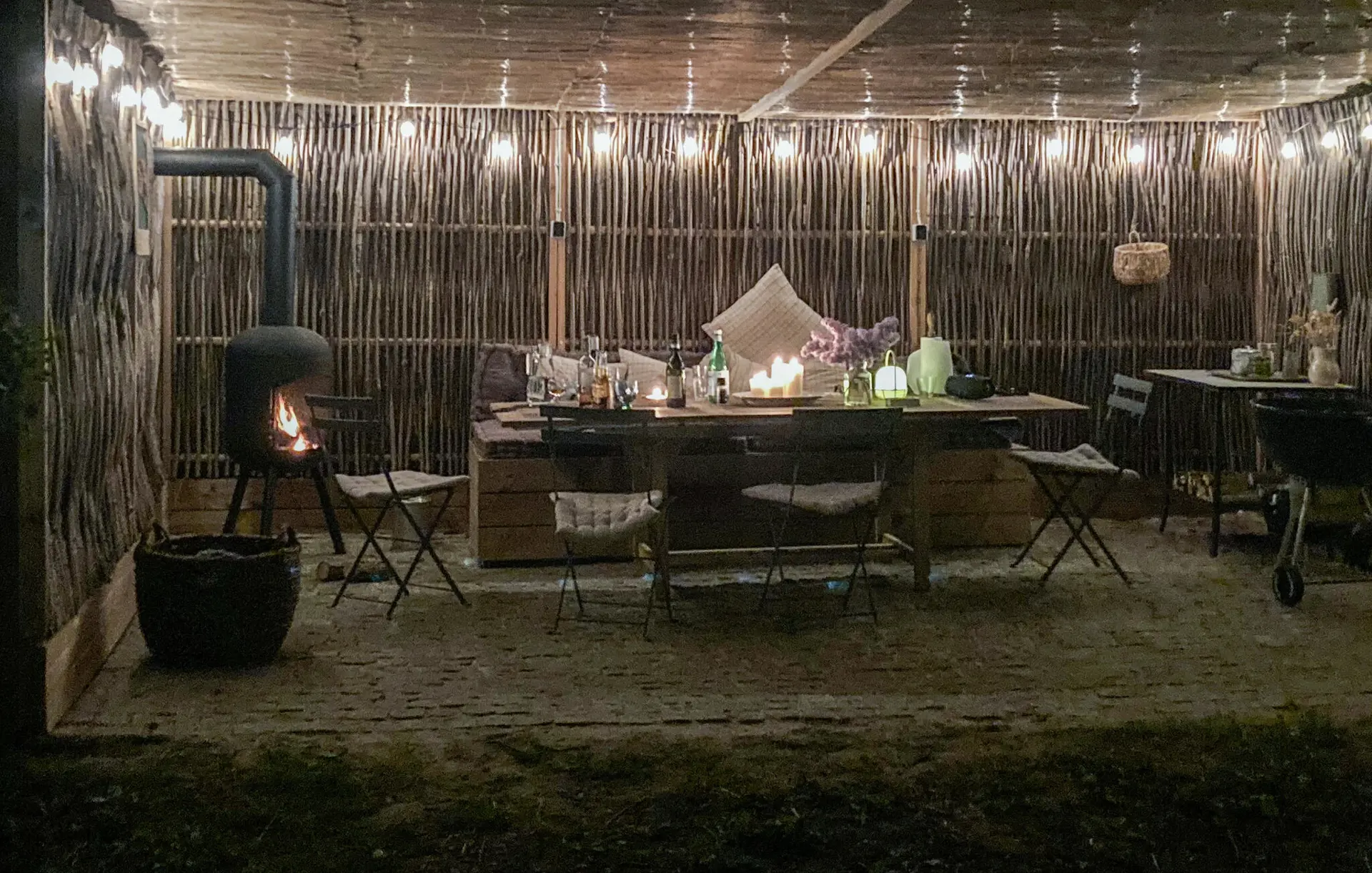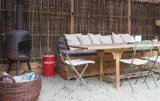 Verbringen Sie viele Stunden im geschützten Außenbereich. Unter der überdachten Terrasse mit Holzdach und seitlichem Sichtschutz aus Naturmaterial sitzen Sie windgeschützt auf der gepolsterten Bank. Heizen Sie an kühleren Abenden den Ofen an. Der weitläufige Garten mit Rasenfläche bietet Platz zum Spielen oder Ausruhen. Nutzen Sie die Feuerstelle mit einfachen Sitzgelegenheiten aus Holzstämmen für einen ruhigen Tagesausklang.