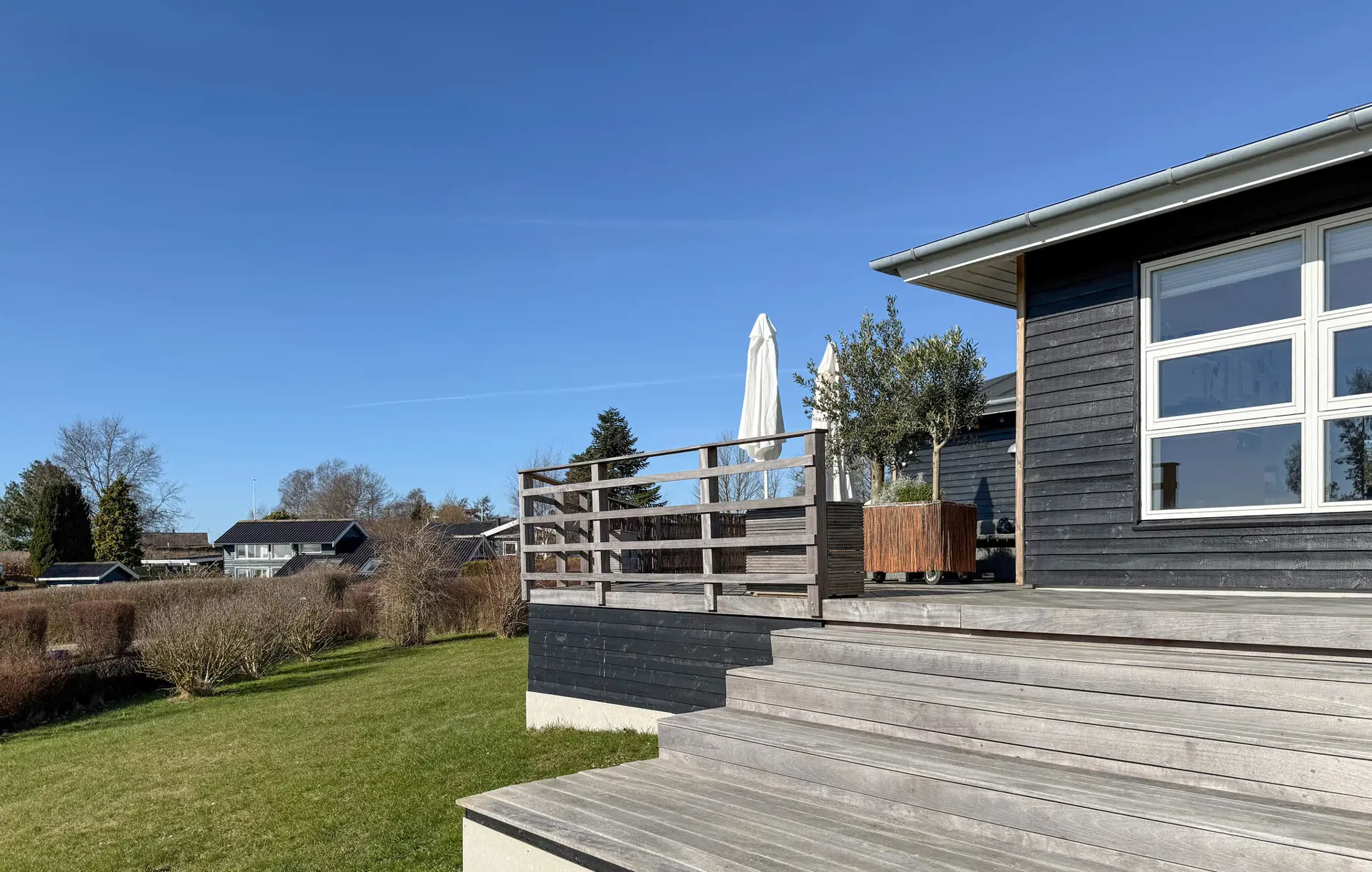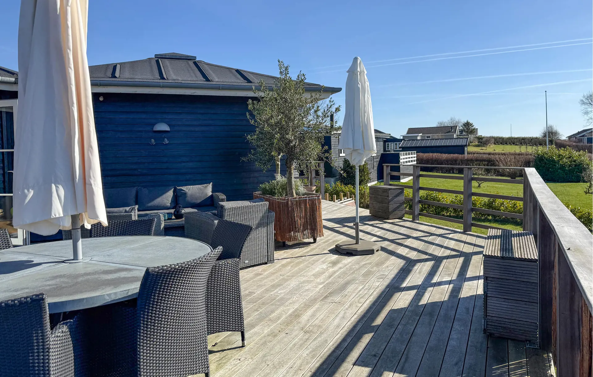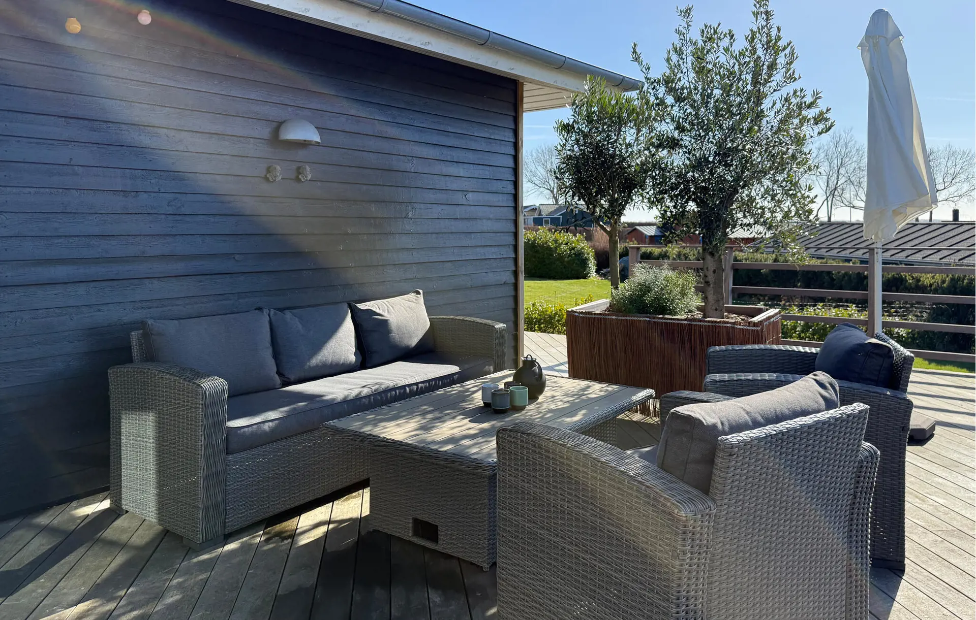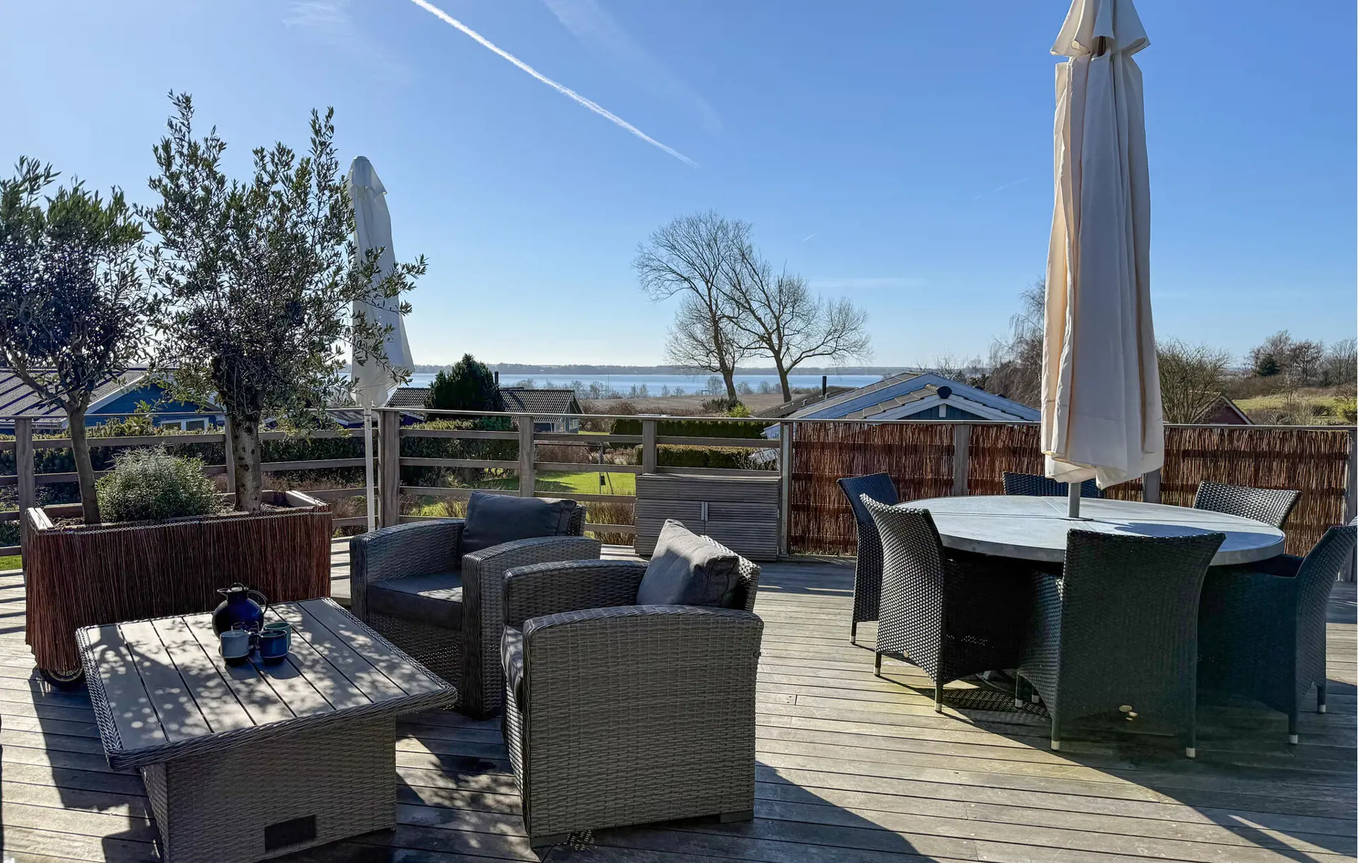 Genießen Sie auf der großzügigen Terrasse entspannte Stunden im Sonnenschein und lassen Sie den Blick über das Wasser schweifen. Machen Sie es sich in den Loungemöbeln bequem und spüren Sie die frische Brise. Verbringen Sie gesellige Abende beim Grillen oder entspannen Sie sich in der schönen Sauna und runden Sie Ihren Tag mit wohltuender Wärme ab.