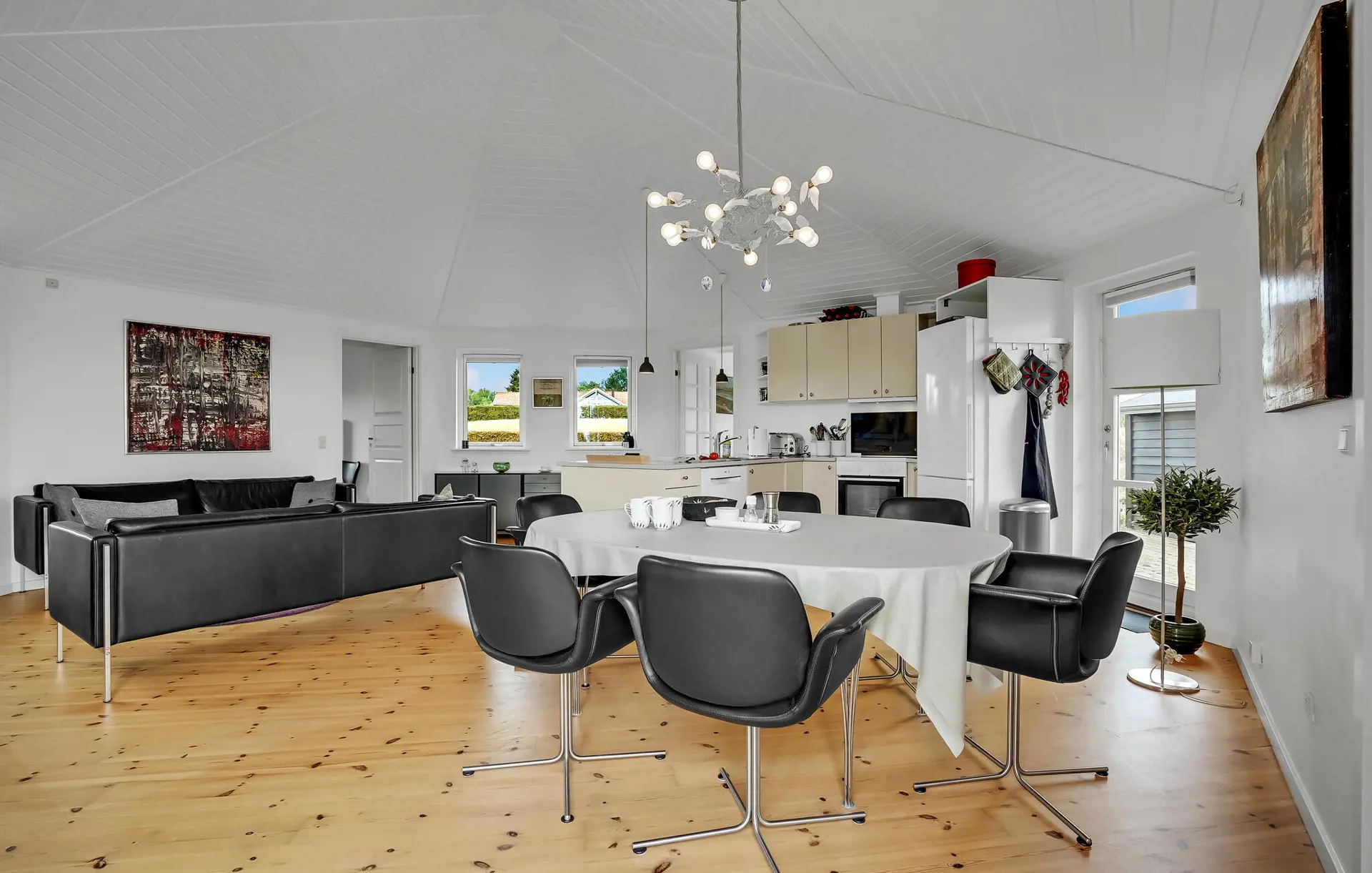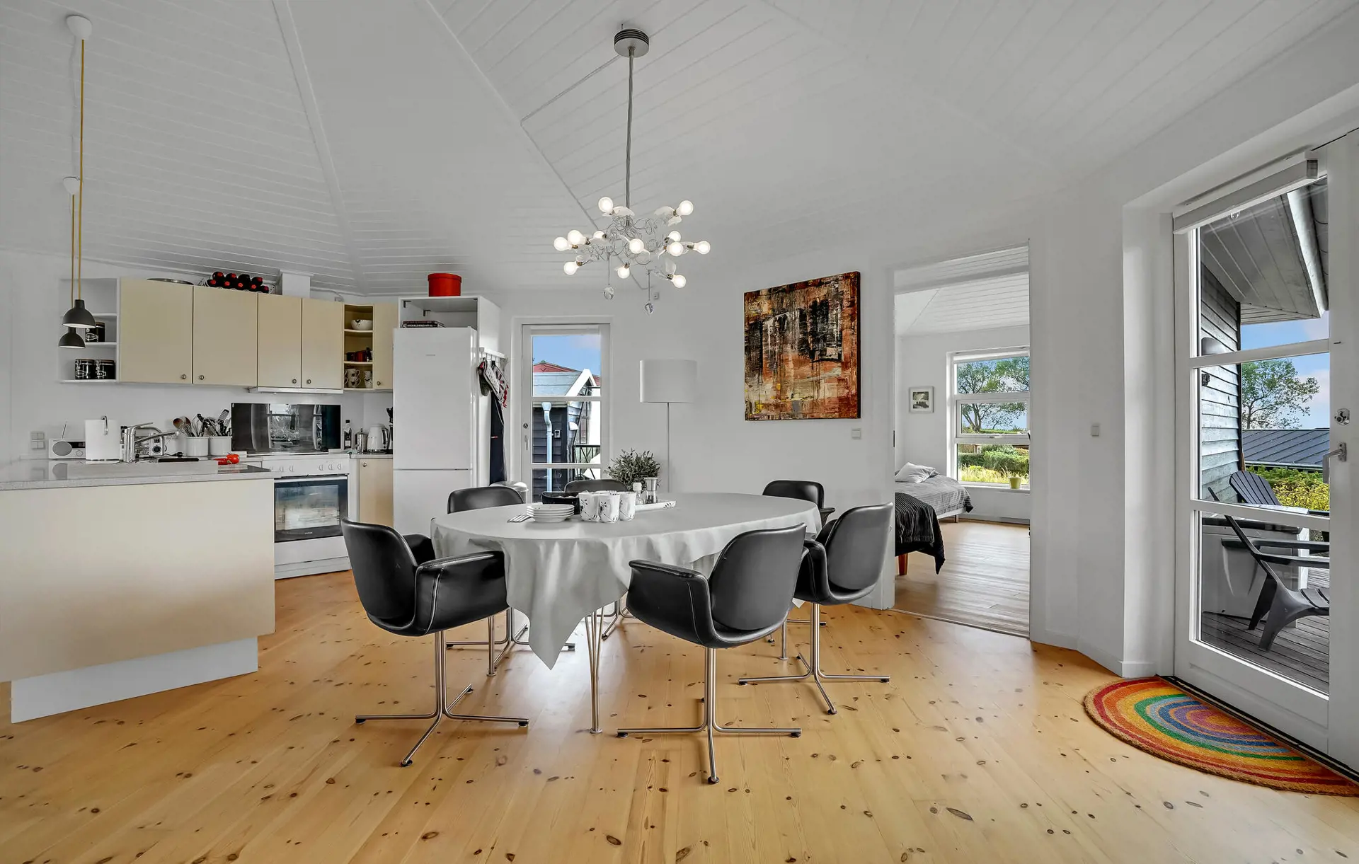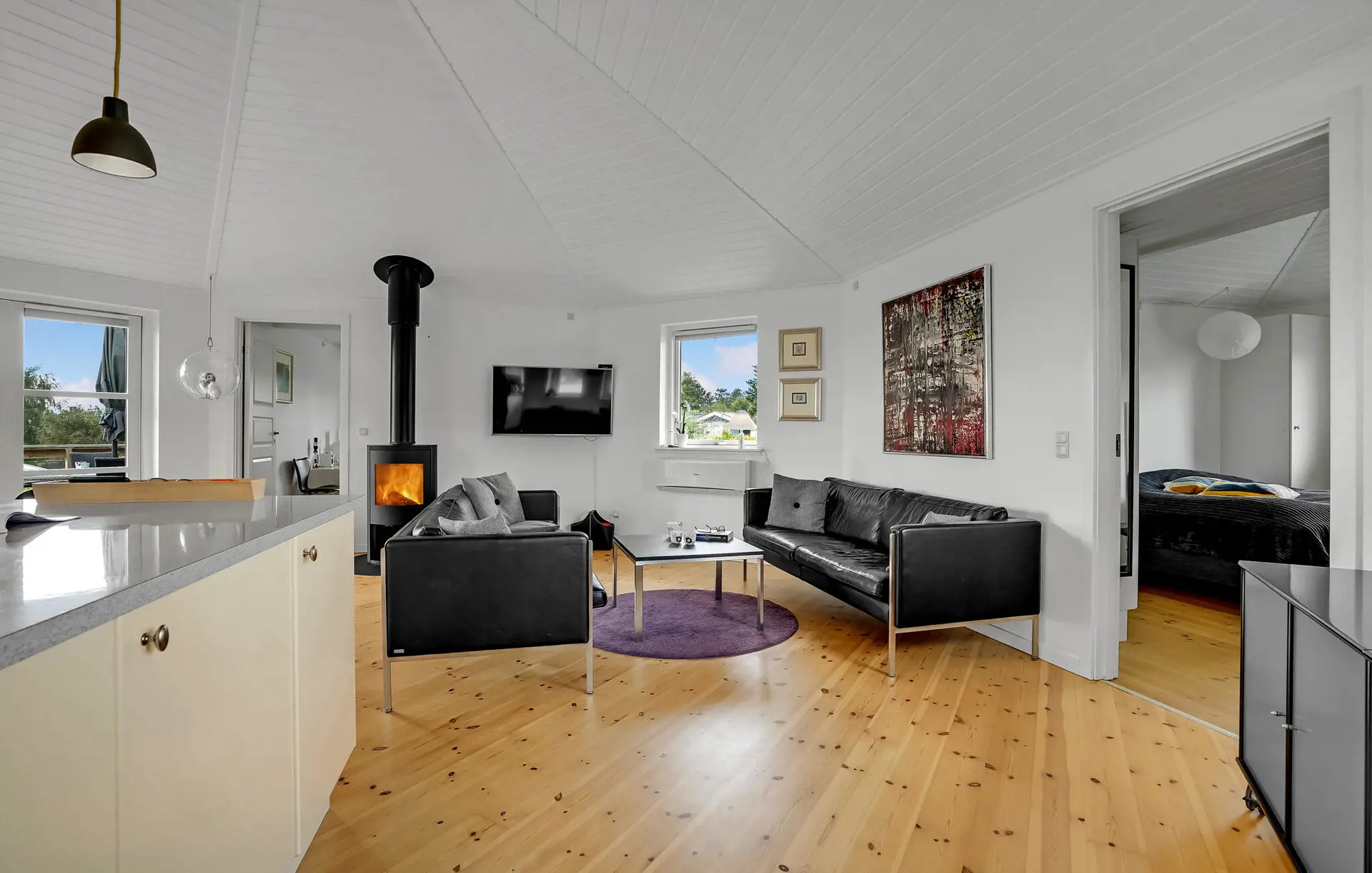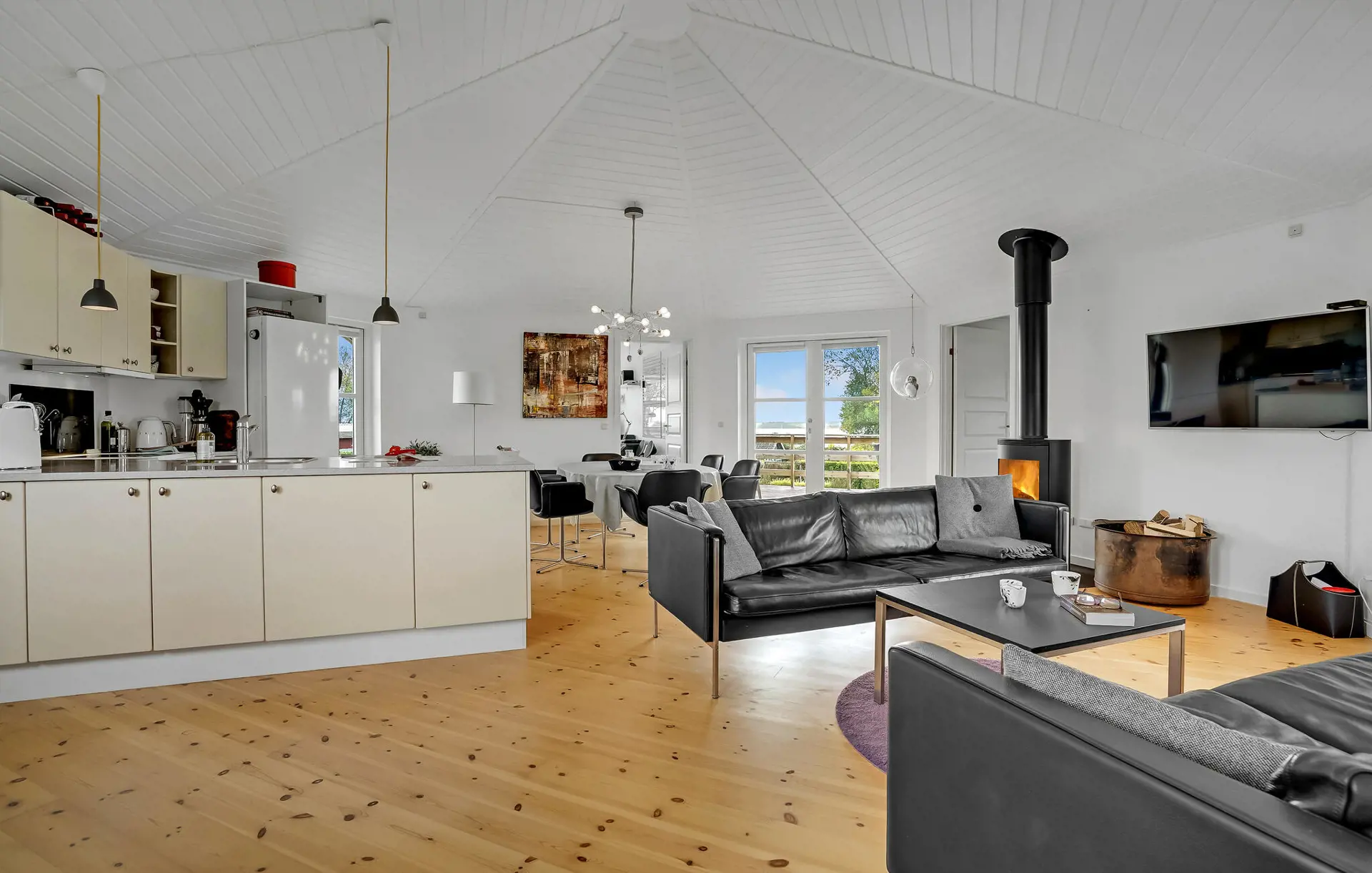 Genießen Sie die helle, offene Wohnatmosphäre mit viel Holz und großen Fenstern, die den Raum mit Licht durchfluten und den Blick ins Grüne freigeben. Entspannen Sie sich am knisternden Kaminofen und lehnen Sie sich auf dem Sofa zurück und streamen Sie gemütlich Ihre Lieblingsserien. Verbringen Sie einen gemeinsamen Kochabend in der gut ausgestatteten Küche, nehmen Sie anschließend am großen Esstisch Platz und lassen Sie den Tag in geselliger Runde ausklingen.