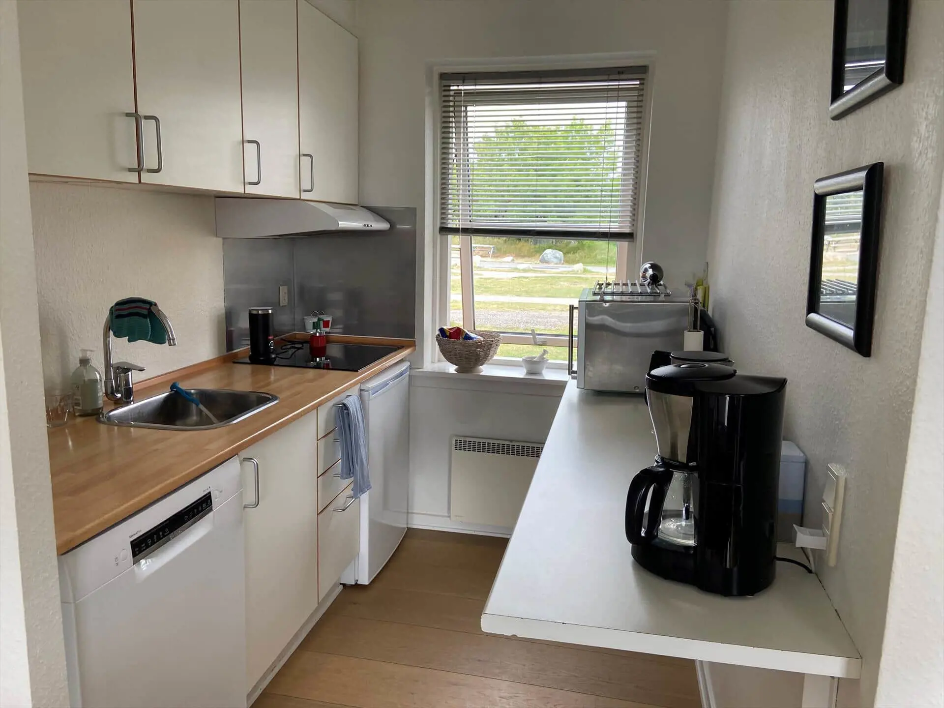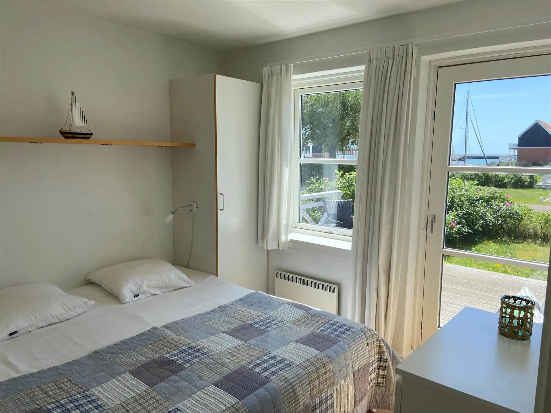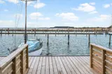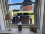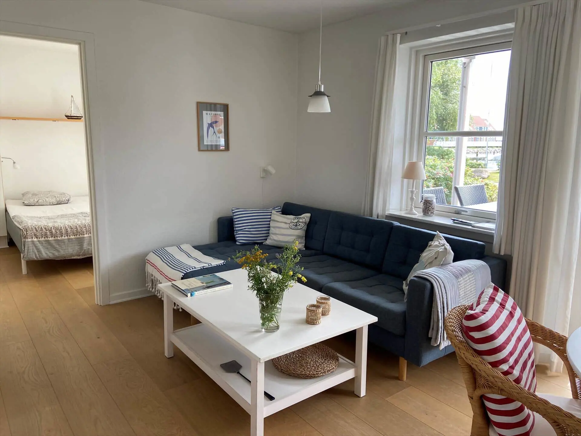 Auf der Südterrasse mit Gartenmöbeln können Sie die Aussicht und die warmen Tage und Abende genießen. Von der Wohnung aus haben Sie einen wunderschönen Blick auf den Yachthafen und sind in Strandnähe. Dank der günstigen Lage können Sie auf der einen Seite der Wohnung frischen Fisch kaufen und auf der anderen Seite Ihren Fisch selbst auf der Terrasse genießen. Hinter der Wohnung befindet sich ein Spielplatz, auf dem sich Kinder austoben können.