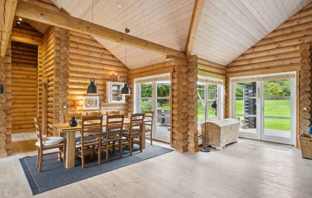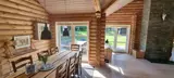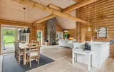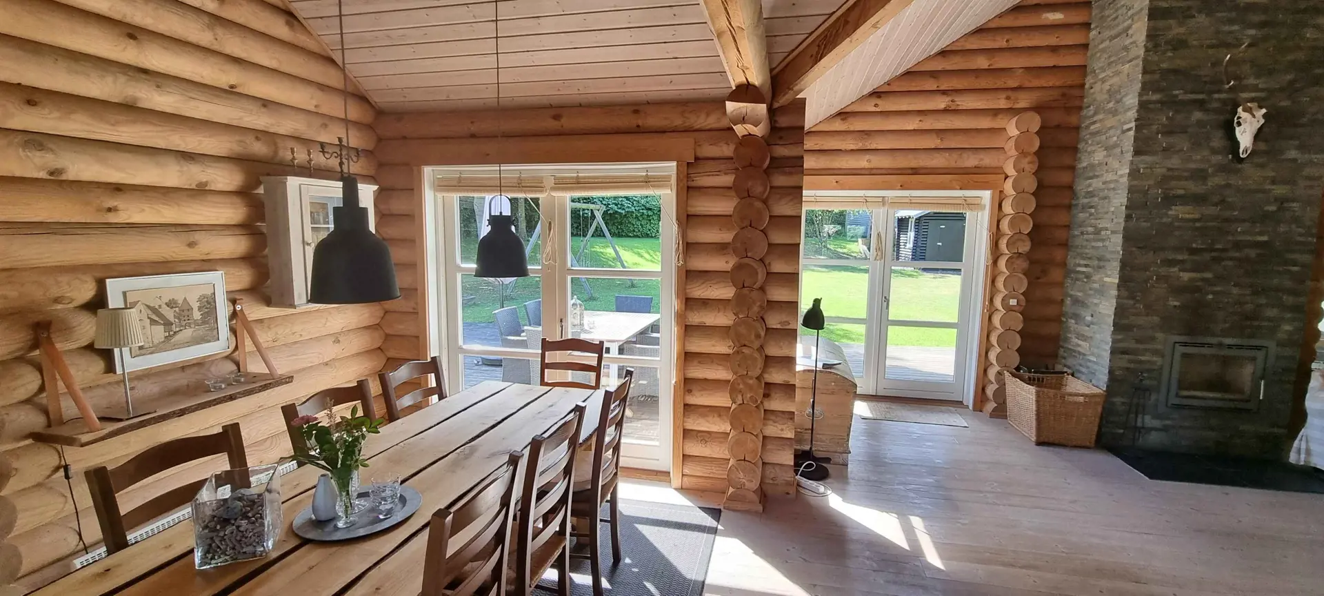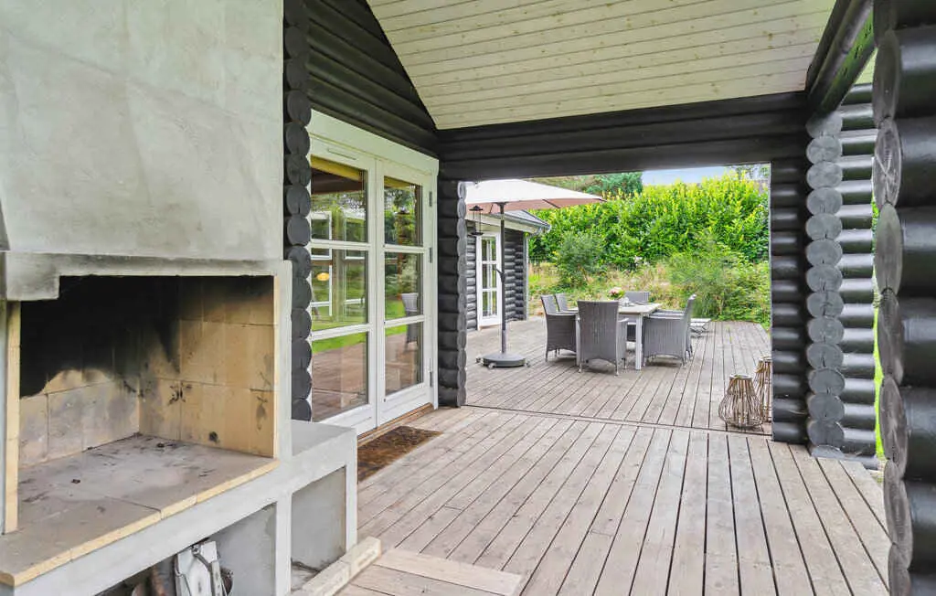 Das Haus bietet ein großes, gemütliches Wohnzimmer mit direktem Zugang zu einer teilweise überdachten Terrasse mit Außenkamin – ideal für entspannte Sommerabende unter freiem Himmel. Das Wohnzimmer ist geschmackvoll mit modernen Möbeln eingerichtet, die eine behagliche Atmosphäre schaffen. In den kälteren Monaten sorgt der Holzofen für wohlige Wärme und Gemütlichkeit. Mit offenem Dachstuhl und sichtbaren Balken herrscht das ganze Jahr über eine besonders einladende Stimmung.