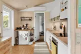 Die Wohnküche ist ausgestattet mit einem Geschirrspüler, Ceranfeld (4 Kochplatten), Backofen und Dunstabzugshaube sowie einem Kühlschrank mit Gefrierfach. Außerdem stehen dort ein Wasserkocher, eine Kaffeemaschine und ein dänischer Toaster bereit.