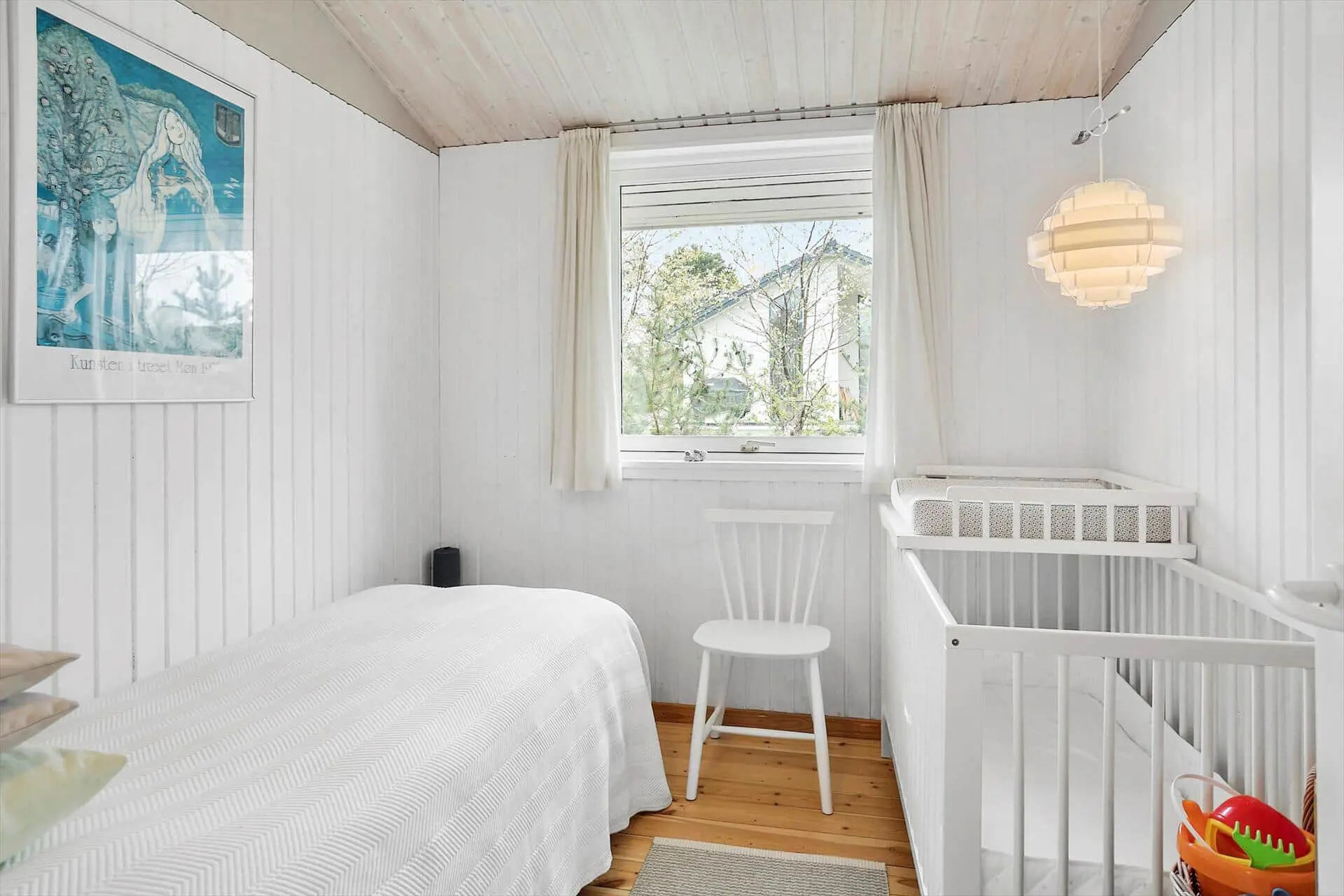 Noch ein Stück weiter (links) befindet sich ein weiteres Schlafzimmer mit einem Einzelbett, Kinderbett und Wickeltisch.