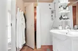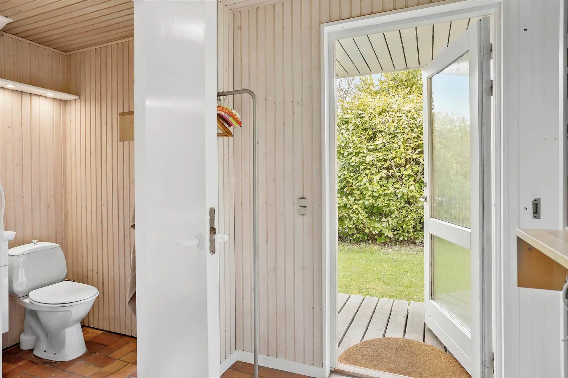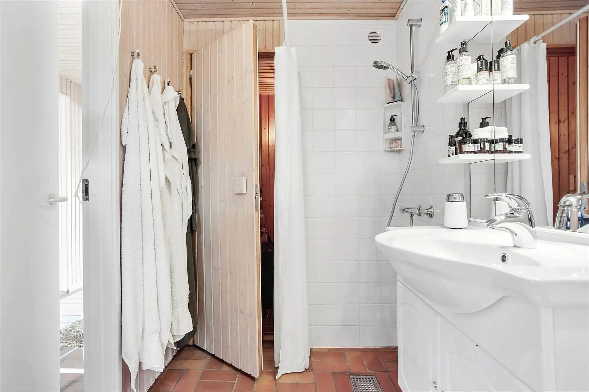Rechts vom Eingang finden Sie ein Badezimmer mit Duschnische, Toilette und Handwaschbecken sowie eine Sauna.