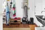 Über der Tür zum Hauswirtschaftsraum hängt eine Wärmepumpe, darüber hinaus finden sich im Hauswirtschaftraum weitere nützliche Dinge, wie beispielsweise etwa eine Waschmaschine (Toplader). Von dort aus gelangen Sie in den Garten.