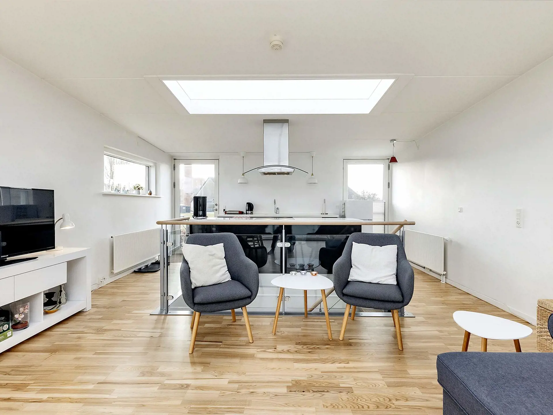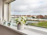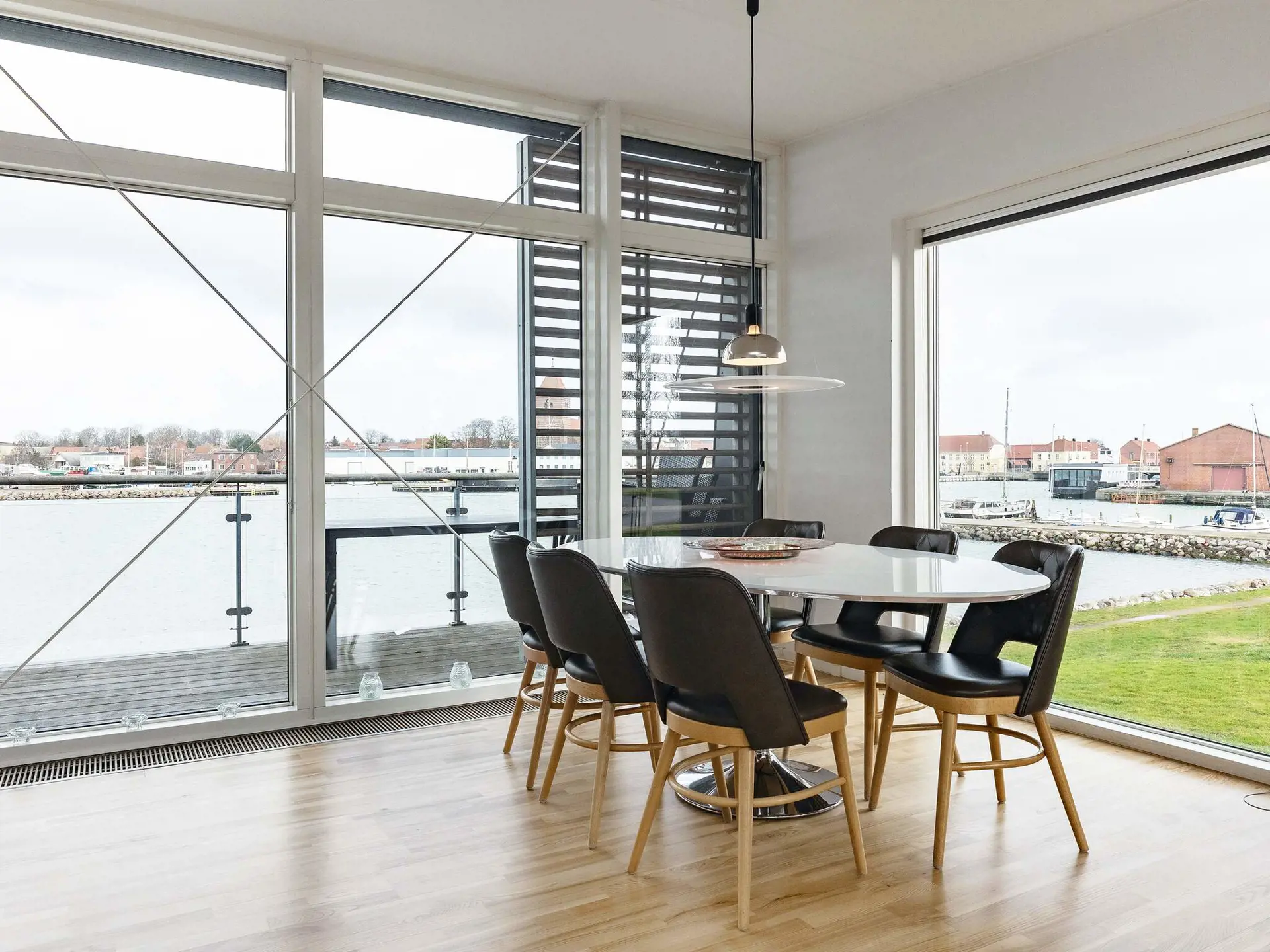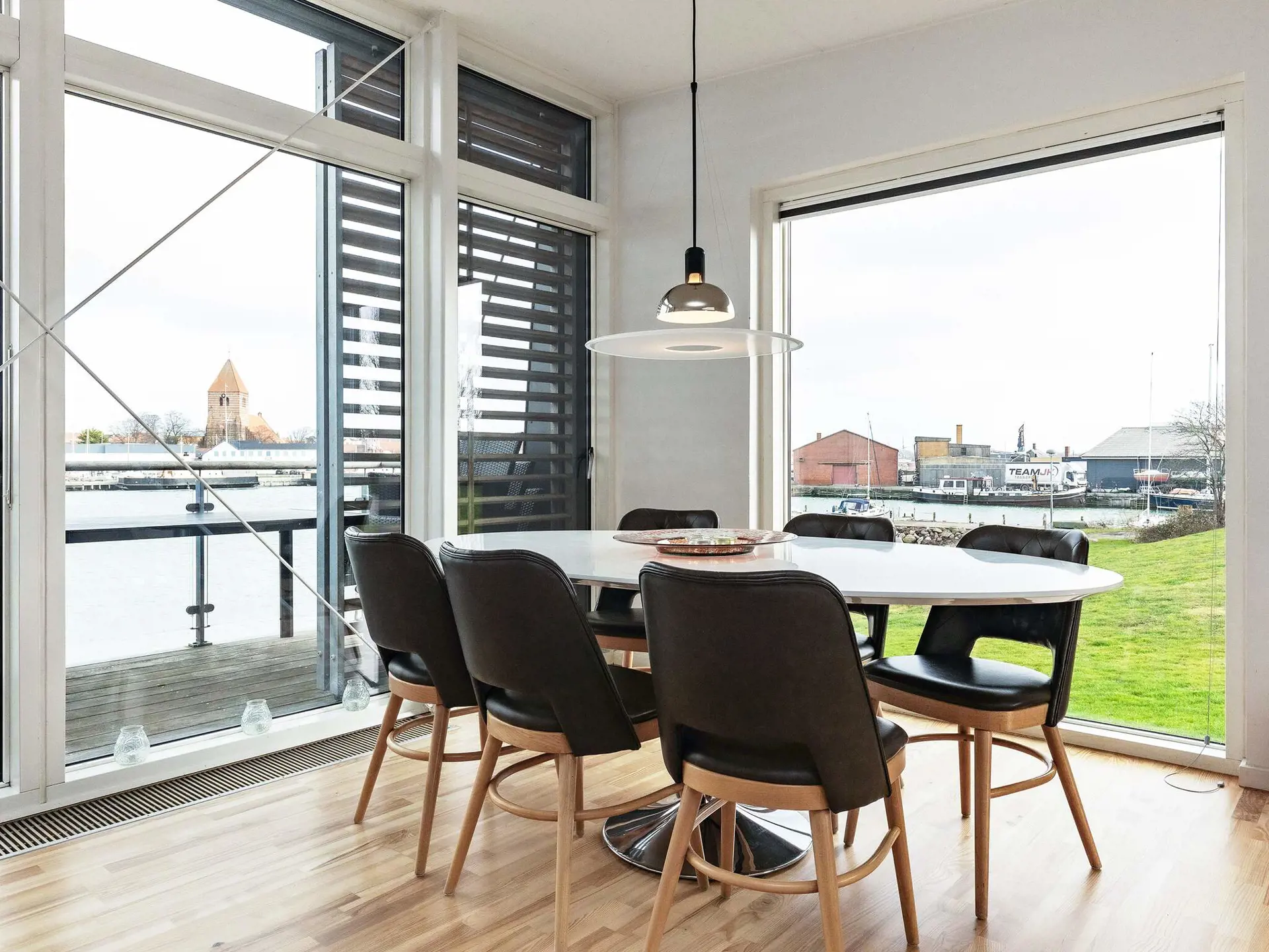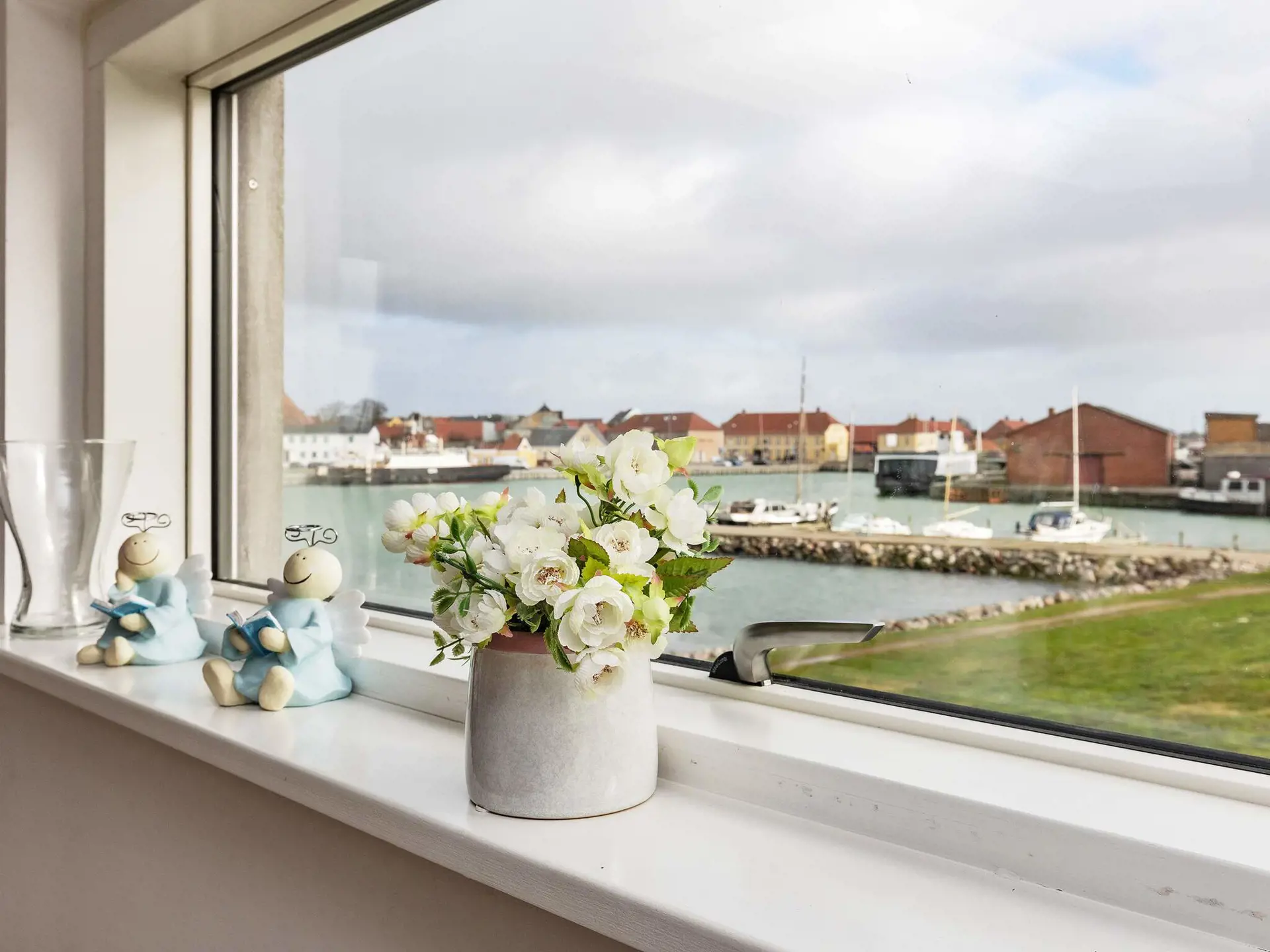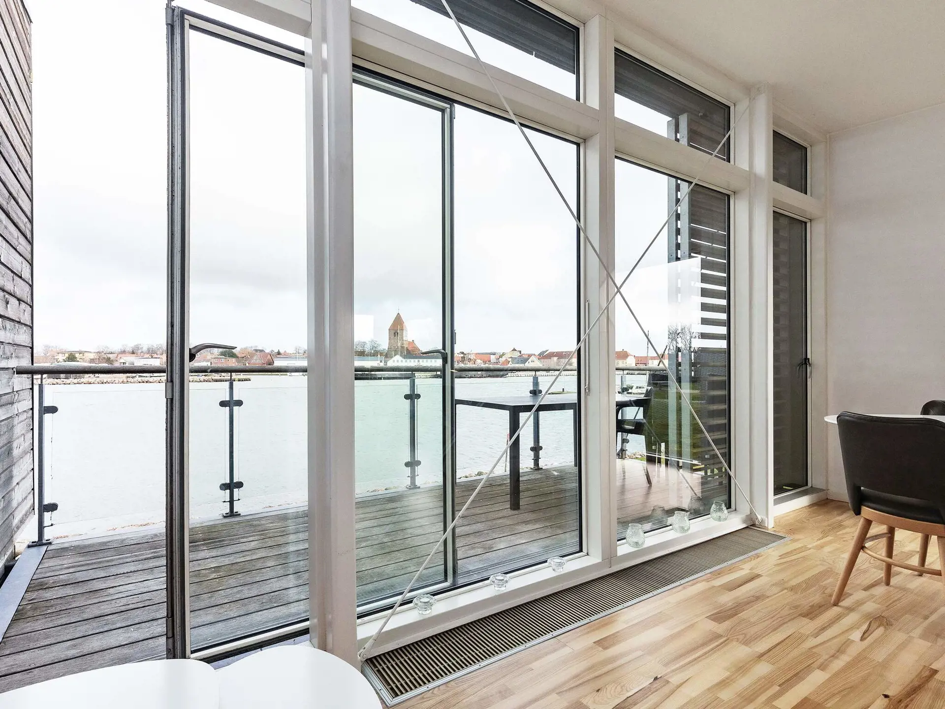 den Hafen von Stege! Innen hell und ansprechend. Die Doppelbetten in den Schlafzimmern sind nur 120 cm breit. Auf der Terrasse können Sie den Blick auf den Hafen genießen und gemütliche Grillabende verbringen.