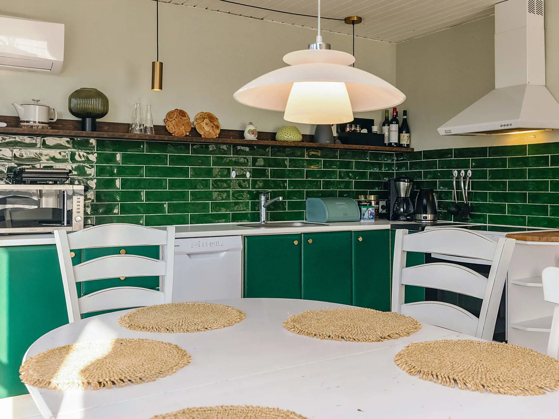 Im Haus erwartet Sie eine voll ausgestattete Küche mit modernen Geräten. Das gemütliche Wohnzimmer mit bequemen Sofas, Fernseher und einem umweltfreundlichen Holzofen bietet die perfekte Atmosphäre zum Entspannen. Zur weiteren Ausstattung gehören WLAN und ein Fernseher mit Chromecast.