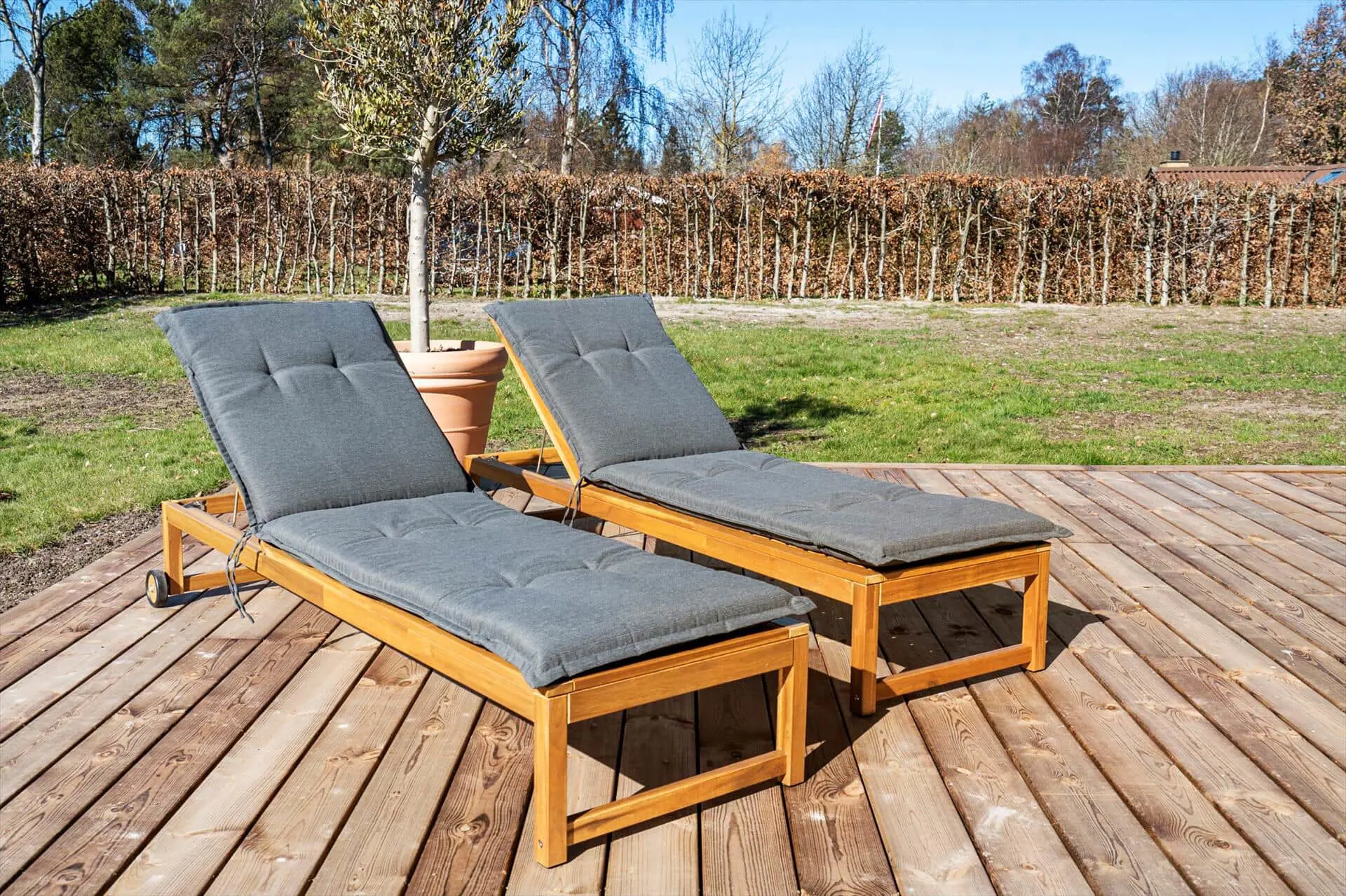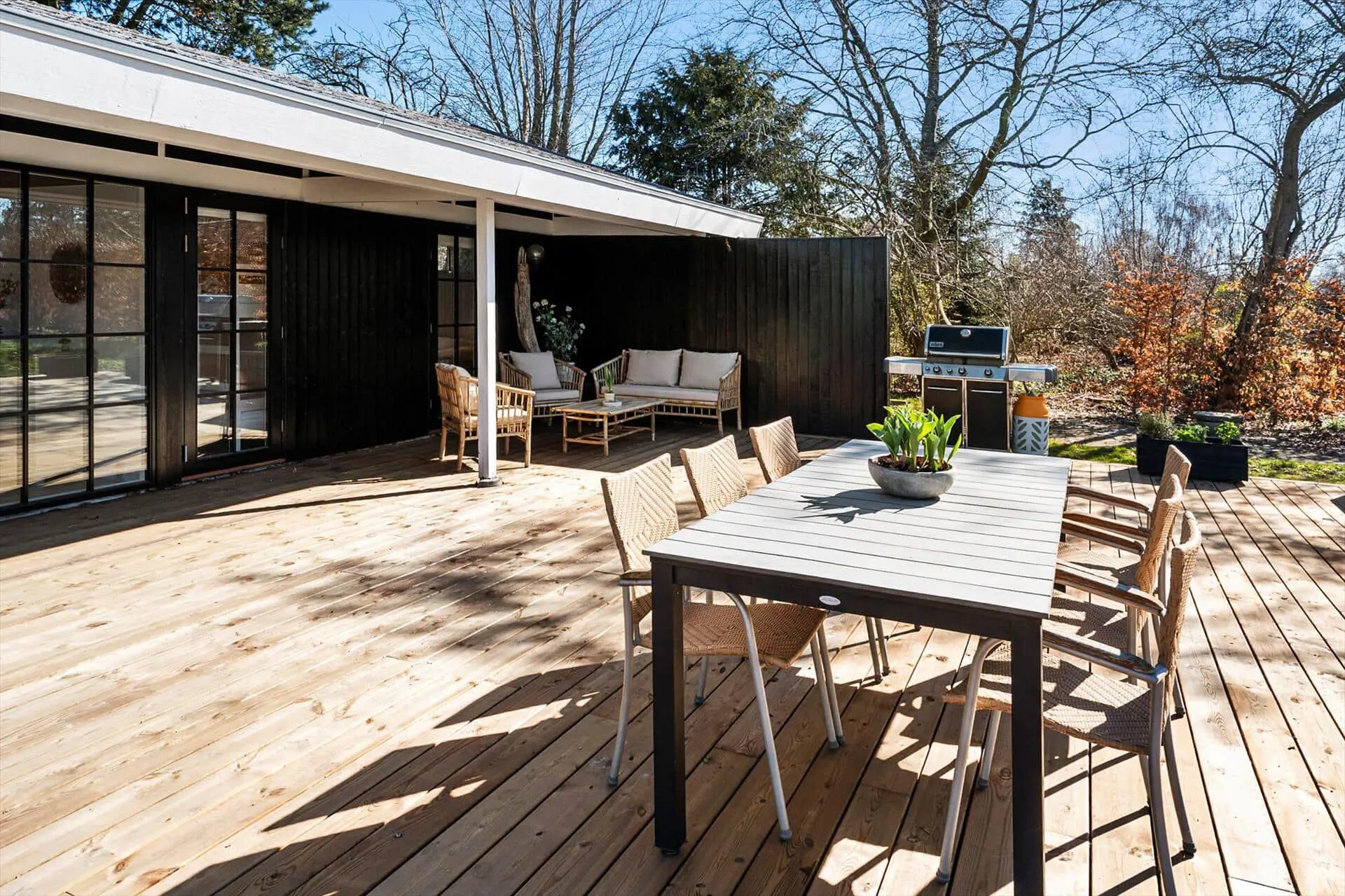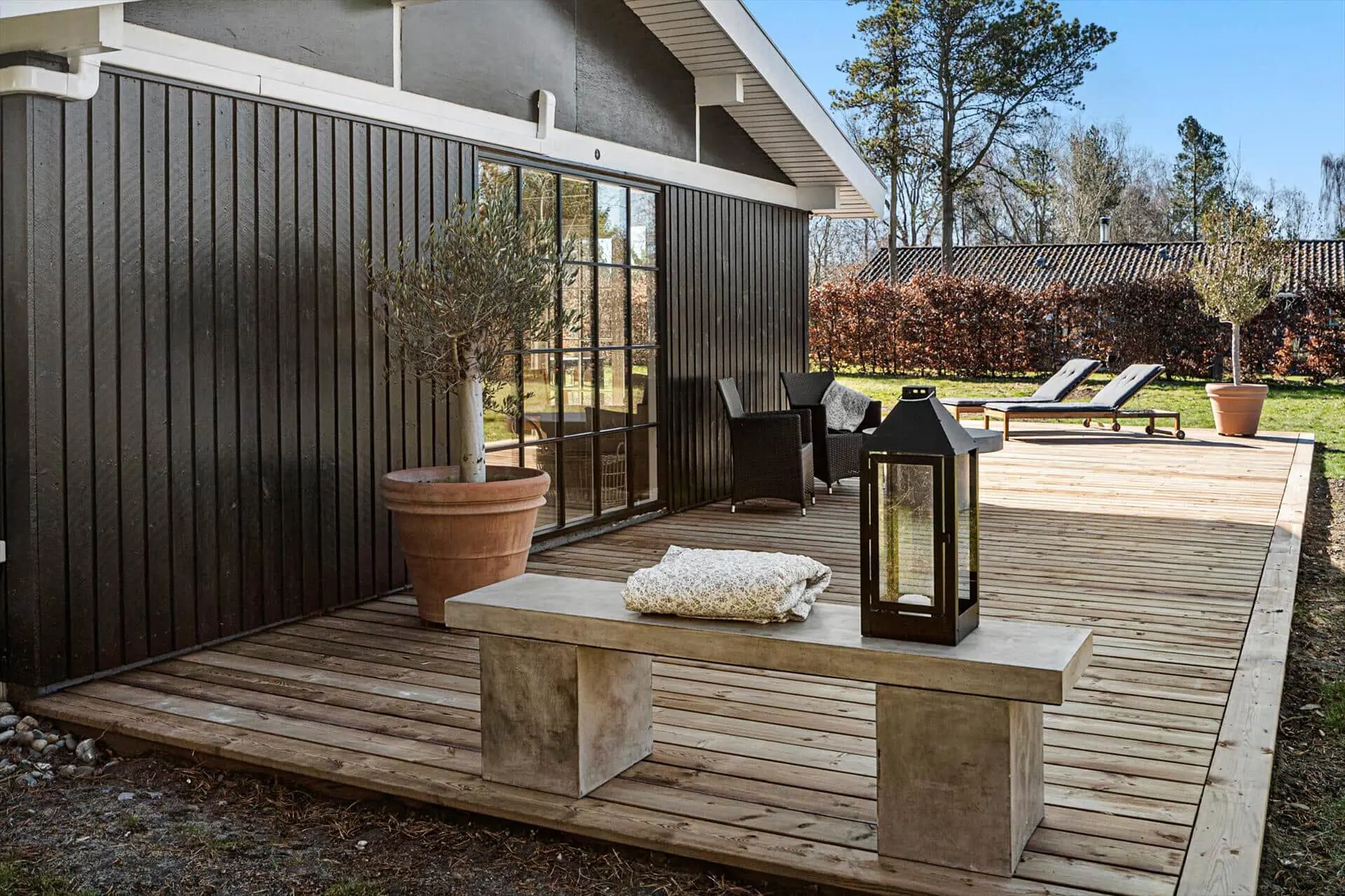 Der Garten ist von einer hohen Buchenhecke umgeben, und die große Holzterrasse wird schnell zu Ihrem Lieblingsplatz. Hier finden Sie viel Platz für den Morgenkaffee, gemütliche Abendessen und lange Sommerabende. Wenn die Terrassentüren vom Wohnzimmer und den Schlafzimmern geöffnet sind, verschmelzen Innen- und Außenbereich harmonisch. Das Grundstück ist ca. 1.200 m² groß und bietet viel frische Luft. Hier können die Kinder unbeschwert spielen, während Sie die Ruhe genießen. Der Strand ist ganz in der Nähe, sodass Sie sich jederzeit erfrischen können.