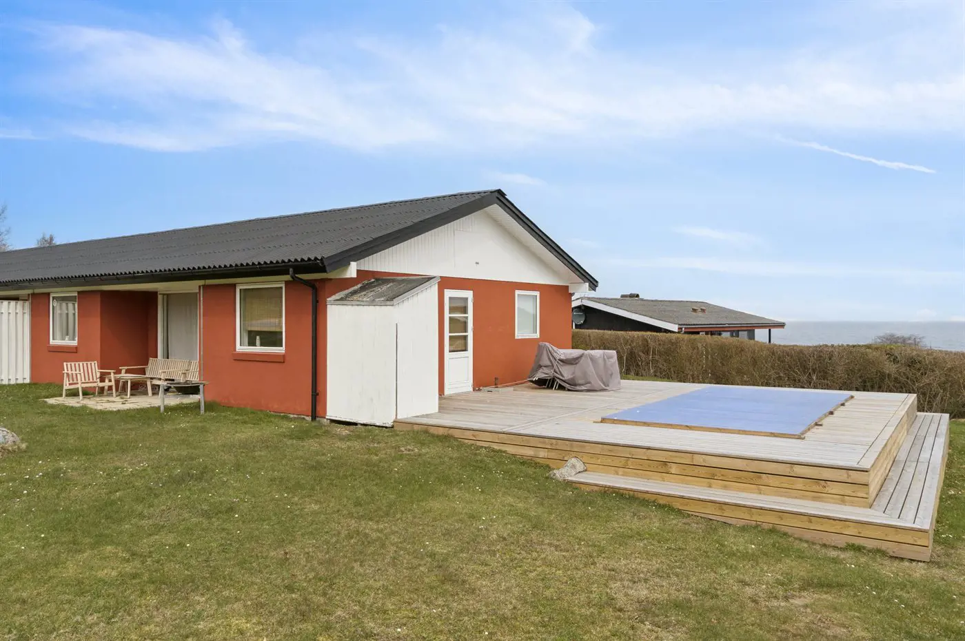 Die Ferienunterkunft liegt auf einem 150 m² großen Naturgrundstück. Die Entfernung zum Meer beträgt 300 m. Die nächste Einkaufsmöglichkeit liegt 1500 m entfernt. Es steht ein offenes Terrassenareal zur Verfügung. Außerdem gibt es überdachte Terrasse. Es steht ein Grill zur Verfügung. Es ist ein Ladestecker für Elektroautos installiert. Parkplatz auf dem Grundstück.