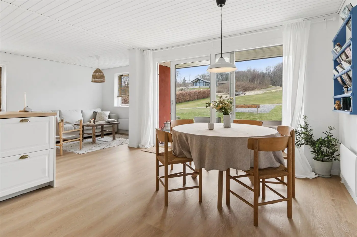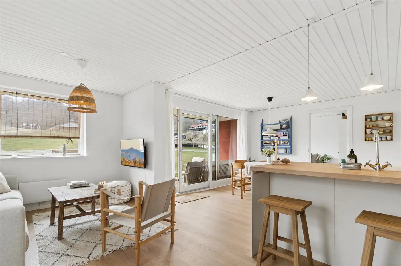Die hügelige Landschaft von Sandkås sorgt dafür, dass die Wohnung hoch gelegen ist und einen wunderbaren Blick auf die Ostsee bietet, gleichzeitig aber leicht zugänglich bleibt. Die Umgebung ist ruhig, man befindet sich dennoch in der Nähe der Stadt Allinge, wo das Volkstreffen stattfindet. Ein kurzer Spaziergang entlang des Küstenwegs oder eine kleine Radtour führt direkt ins bunte Treiben von Allinge, besonders in der Woche 24, wenn die Stadt voller Leben ist.