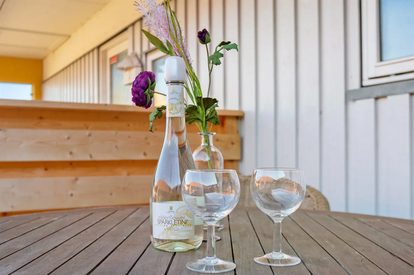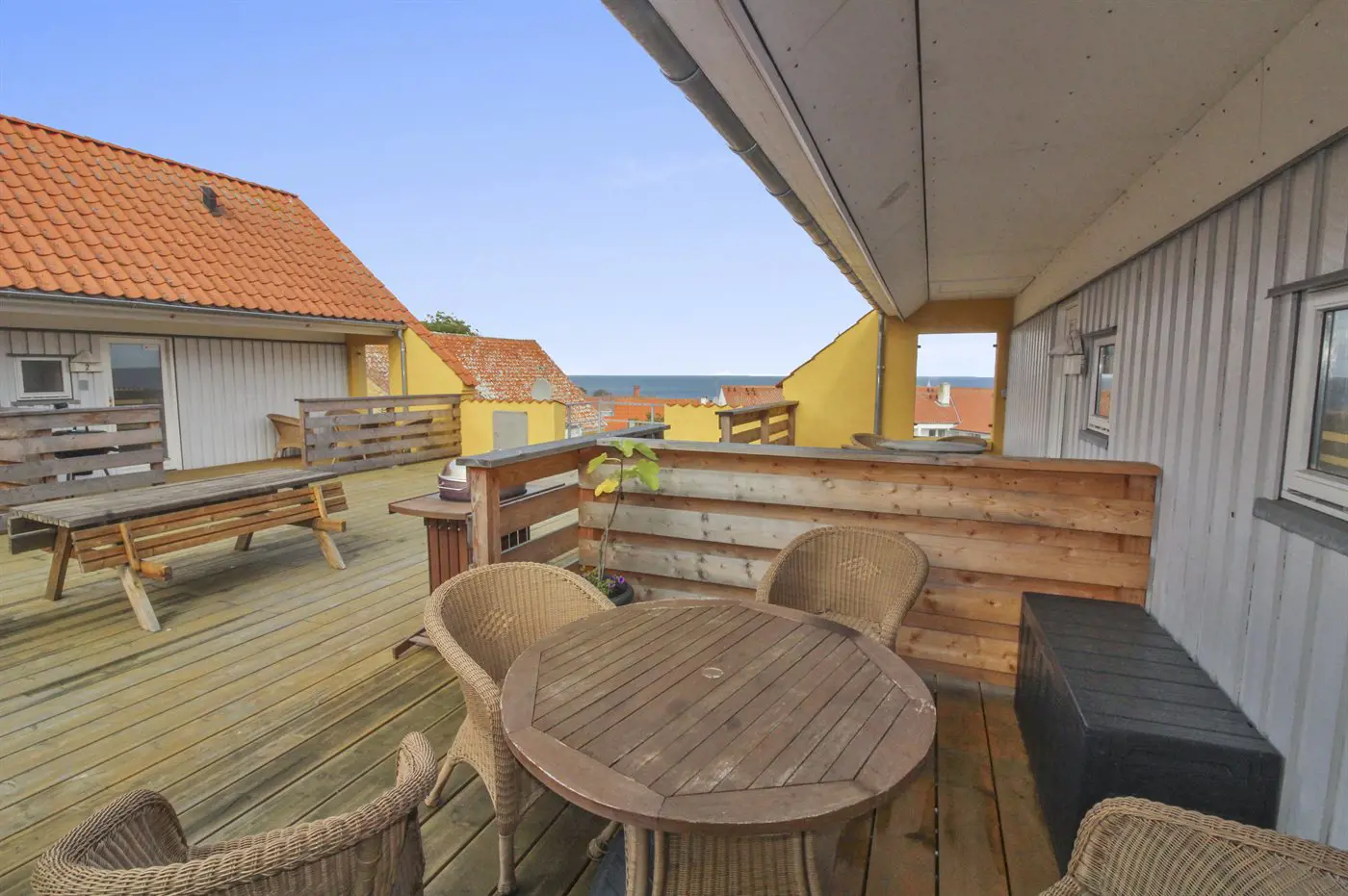 Die Gudhjem Købmandsgård besteht aus mehreren Ferienwohnungen im ersten Stock, die eine schöne Holzterrasse mit kleinen privaten Bereichen für jede Wohnung umgeben. Der Zugang erfolgt über eine gemeinsame Treppe, die zum Terrassenbereich führt.