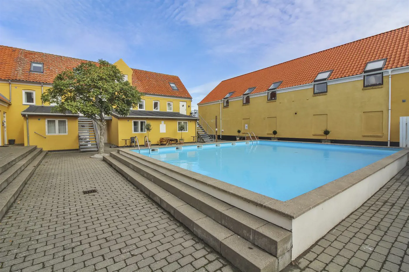Im zentralen Teil der Købmandsgård befindet sich ein großer, gepflasterter und geschützter Innenhof mit Zugang zu einem gemeinschaftlichen Swimmingpool, der vom 1. Juni bis zum 30. September genutzt werden kann. Der Pool ist nicht beheizt, aber ideal für ein erfrischendes Morgenbad oder zum Planschen der Kinder in der Hochsaison.