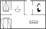 Die Schlafplätze verteilen sich auf 2 Schlafräume. 2 Schlafplätze in einem Doppelbett. 2 Schlafplätze in Einzelbetten.