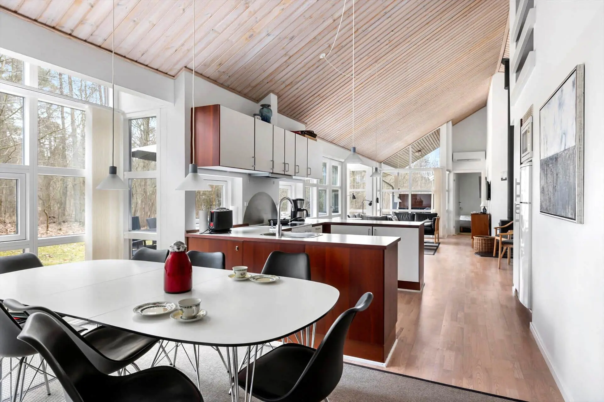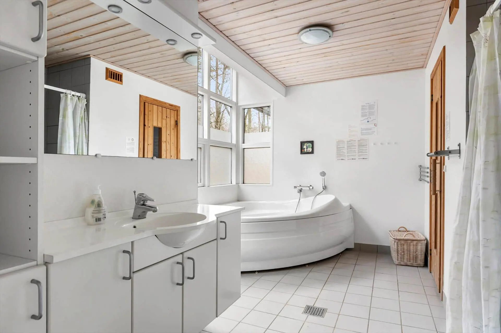 Freu dich auf erholsame Urlaubstage in diesem schönen Ferienhaus im Rubinvej in Hasle Lystskov, wo viel Platz für die ganze Familie oder mehrere Generationen ist, die gemeinsam Urlaub machen möchten. Hier wirst du von einem hellen und gemütlichen Wohnbereich empfangen, in dem der Kamin an kühleren Abenden schnell zum Mittelpunkt wird. Stell dir vor, wie sich das Flammenspiel im Raum widerspiegelt, während ihr es euch auf dem Sofa mit Gesellschaftsspielen, einem guten Film oder einfach mit entspanntem Beisammensein nach einem erlebnisreichen Tag auf Bornholm gemütlich macht. Der Wohnbereich ist offen mit der funktionalen Küche verbunden, sodass du das Abendessen zubereiten und trotzdem Teil der Gespräche am Esstisch sein kannst. Große Fenster lassen viel Licht herein und holen die Natur direkt ins Haus – so entsteht eine entspannte und einladende Urlaubsatmosphäre. Das Ferienhaus verfügt über vier gute Schlafzimmer sowie einen offenen Schlafboden, der bei Kindern garantiert für Begeisterung sorgt. Hier gibt es Raum für Gemeinschaft und zugleich Rückzugsmöglichkeiten, damit jeder zur Ruhe kommen kann. Die zwei Badezimmer machen den Alltag angenehm – auch wenn ihr mehrere Personen seid. Beide sind mit Fußbodenheizung ausgestattet, und eines verwöhnt dich zusätzlich mit Whirlpool und Sauna. Nach einem langen Tag am Strand oder einer Fahrradtour durch den Wald kannst du dich hier von wohltuender Wärme umhüllen lassen und einfach abschalten – echter Urlaub auf der Sonneninsel.
