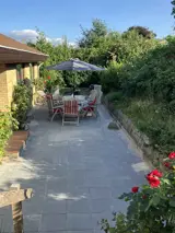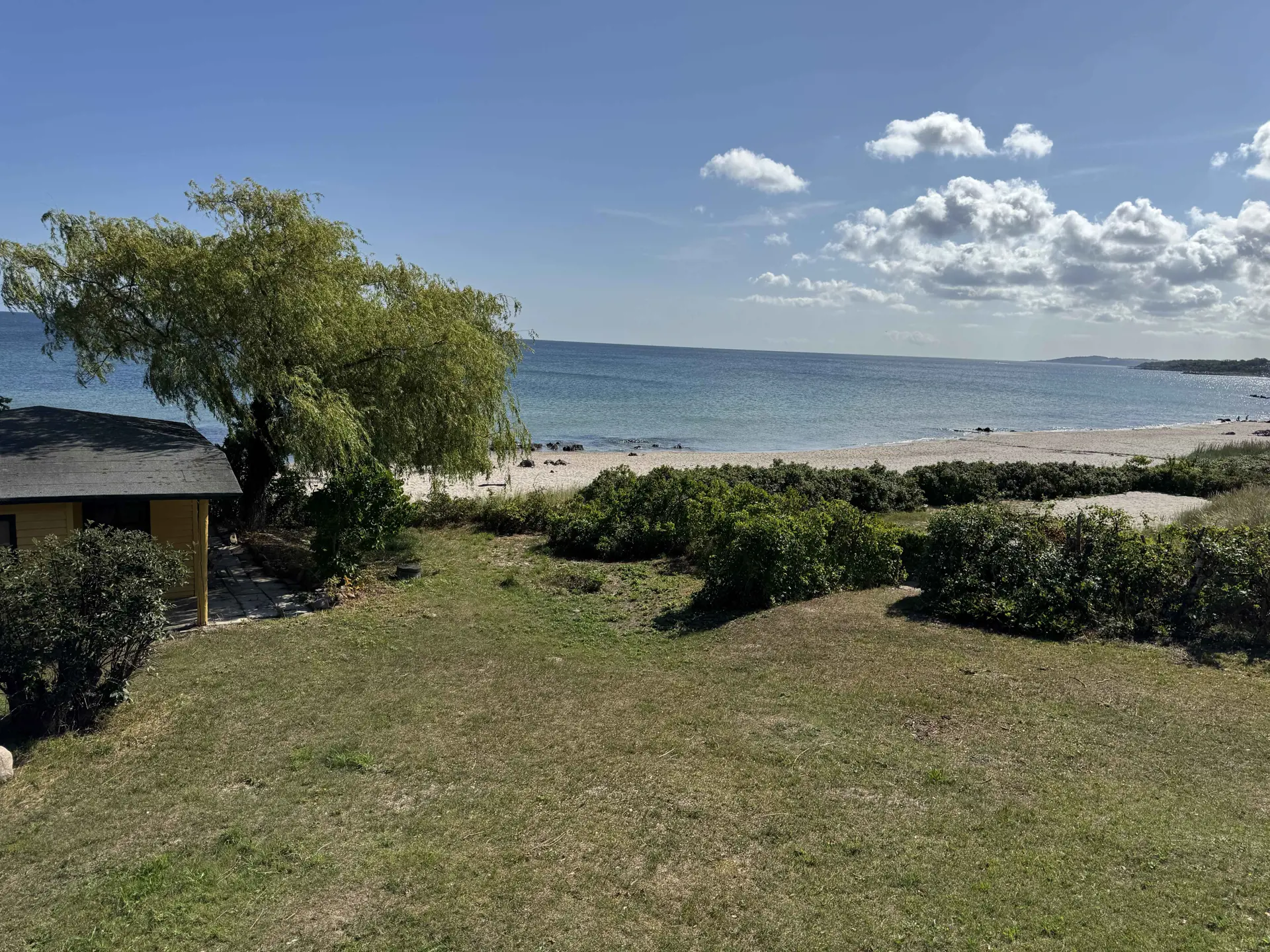Außen liegt das Ferienhaus auf einem hügeligen Naturgrundstück mit direktem Zugang zum Strand. Der Garten ist natürlich gehalten, mit Fokus auf Lage und Aussicht. Zudem gibt es eine Terrasse zur Straßenseite mit Essplatz.