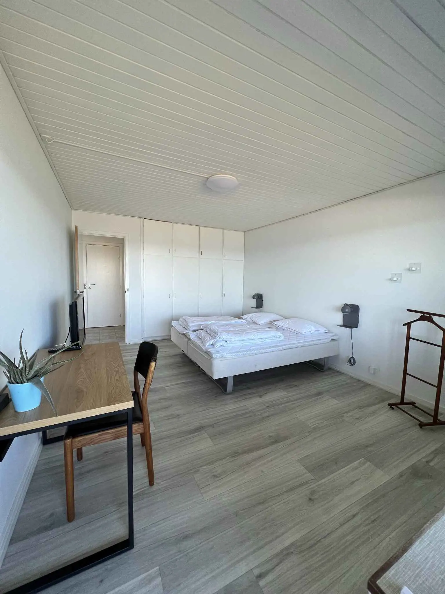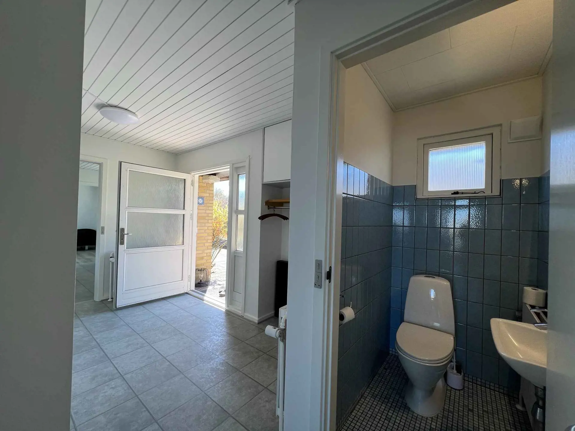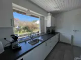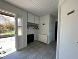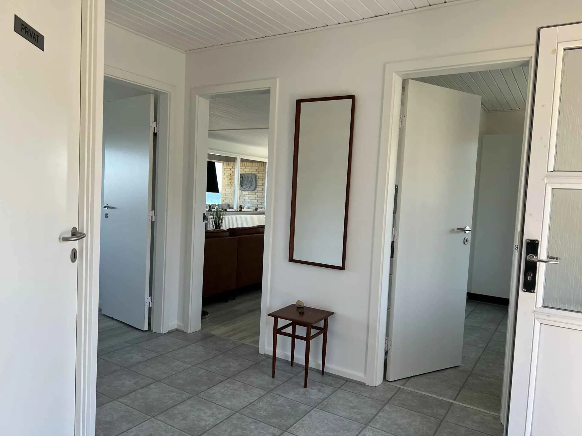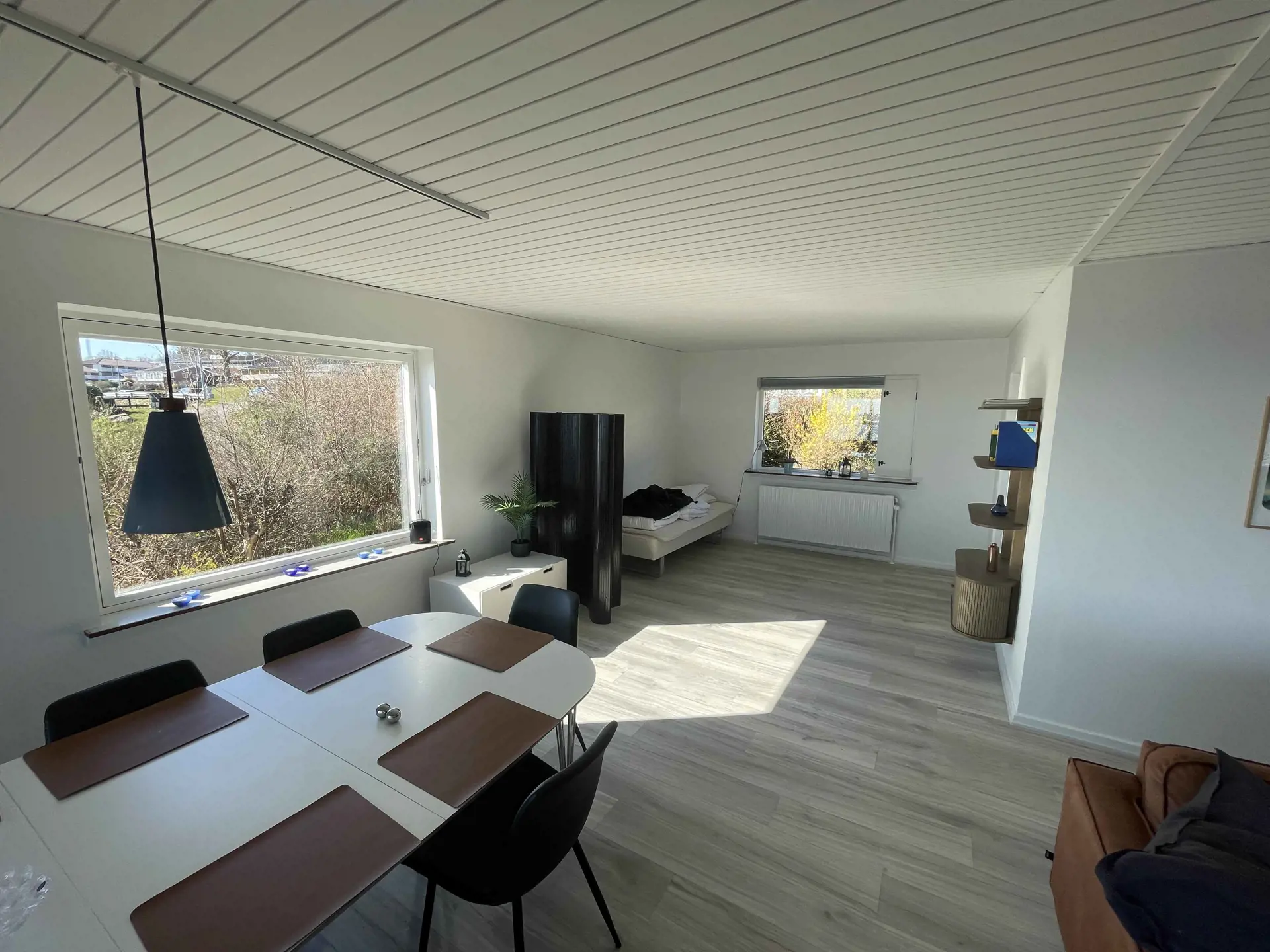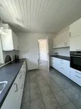Das Haus wird im Erdgeschoss vermietet und umfasst ca. 128 m². Innen präsentiert sich die Unterkunft hell und schlicht mit weißen Wänden und Decken sowie hellen Böden für eine ruhige Atmosphäre.