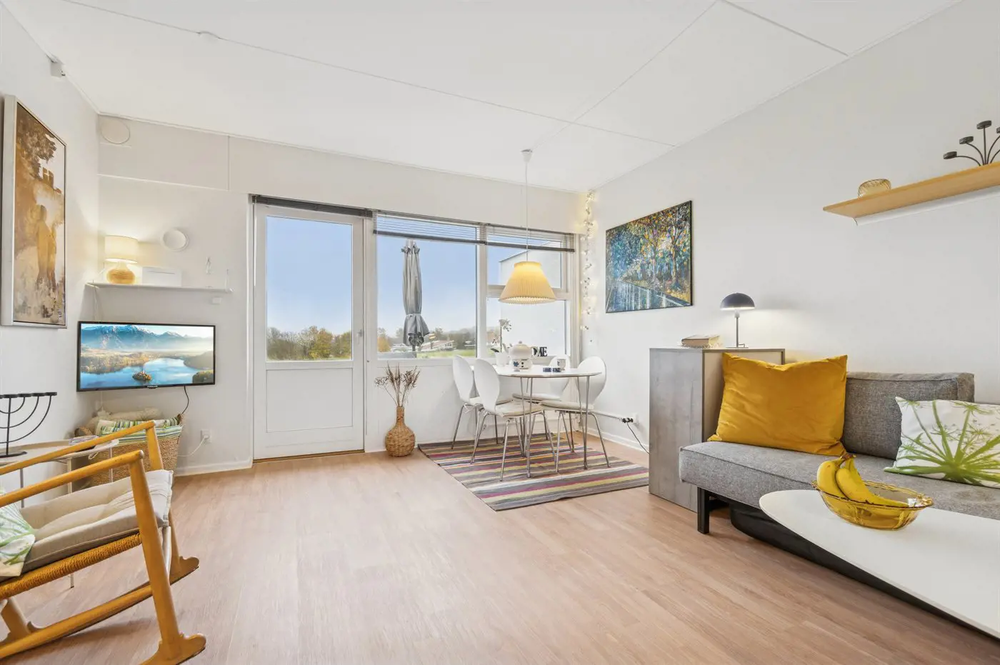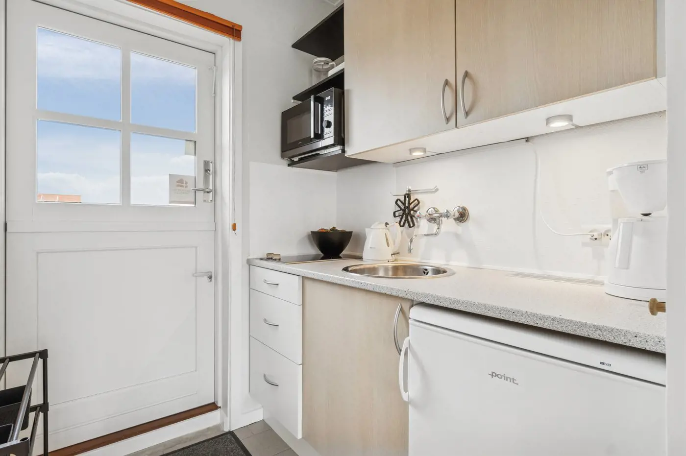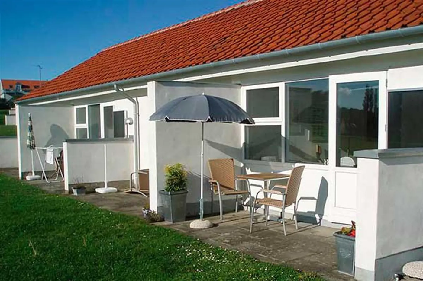 Von der kleinen, abgeschirmten Terrasse aus kannst du den Lauf der Natur und den Weg der Sonne über den Himmel verfolgen. Im großen gemeinsamen Außenpool kannst du dich an warmen Sommertagen mit einem erfrischenden Bad abkühlen – oder du gehst hinunter zum Sandstrand in Sandkås und genießt die Wellen der Ostsee.