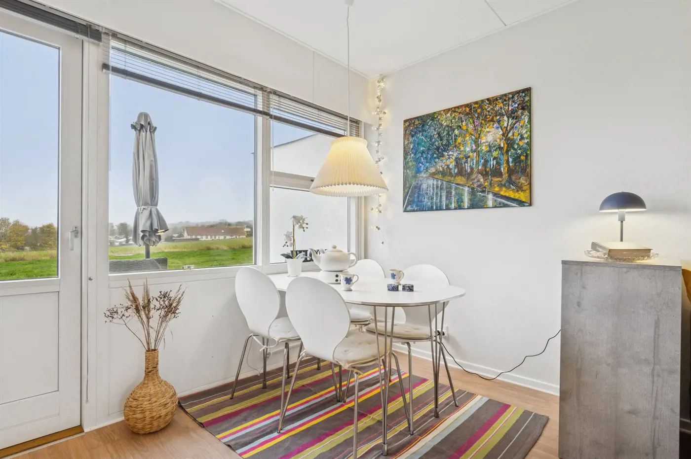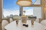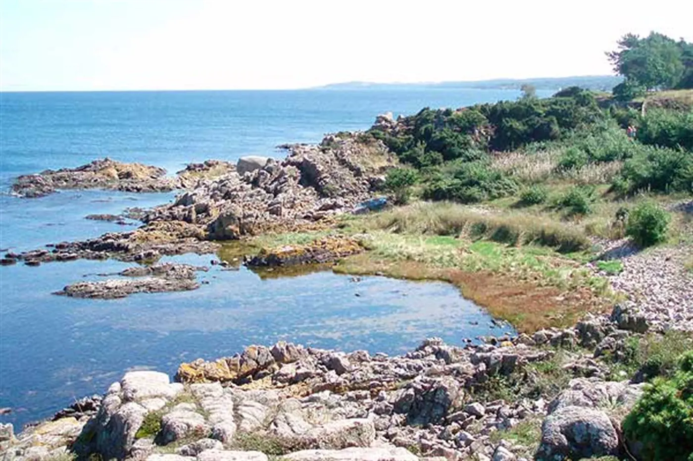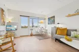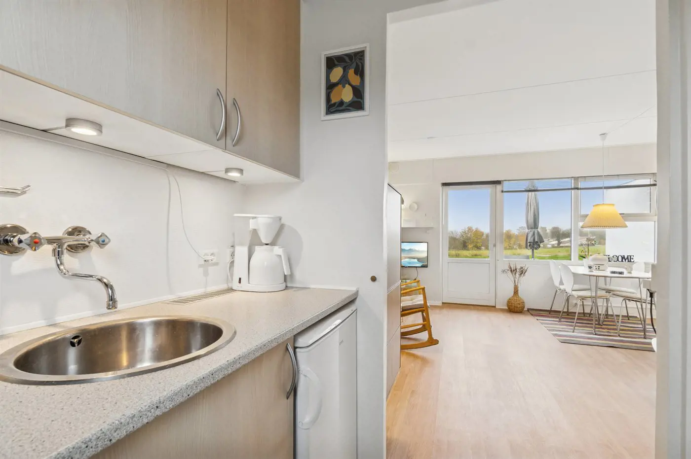 Helle Ferienwohnung mit 27 Quadratmetern, gelegen mit einem schönen Blick über die Felder im sanft abfallenden Gelände und über die Ostsee mit Christiansø in der Ferne.