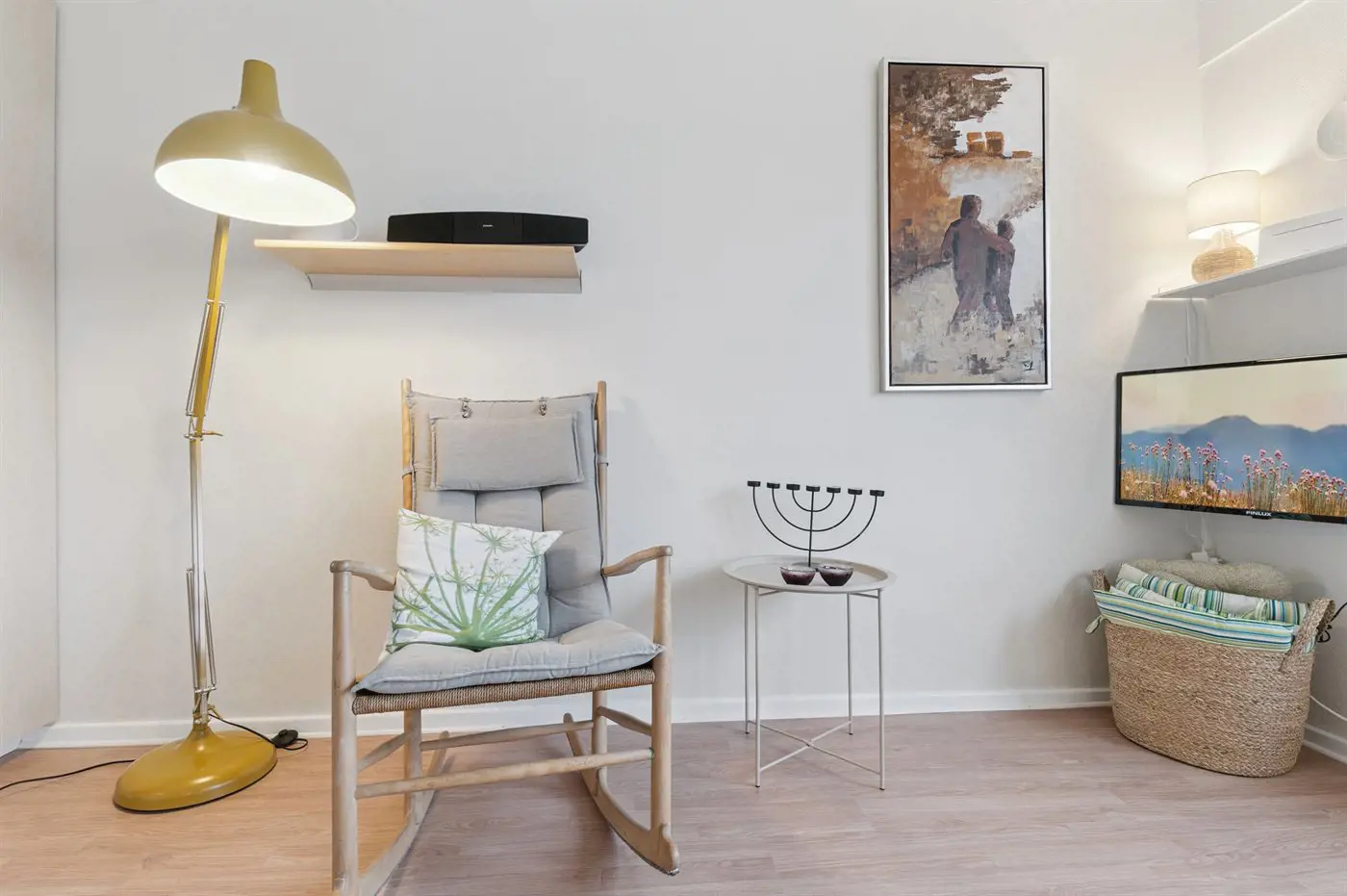 Die Ferienwohnung ist mit einem Wohnraum, einer kleinen Küche, einem einladenden Badezimmer und einem Doppelschlafsofa im Wohnzimmer ausgestattet.