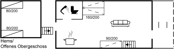Die Ferienwohnung hat eine Wohnfläche von 34 m² die sich auf das Erdgeschoss und das offene Obergeschoss verteilt. Im offenen Obergeschoss befinden sich zwei Einzelbetten, und im Wohnzimmer gibt es 2 Schlafplätze auf einer Doppelschlafcouch (200x160 cm). Für die Kleinen gibt es einen Hochstuhl und ein Reisebett. Die Unterkunft wird an maximal 2 Erwachsene und 2 Kinder vermietet.