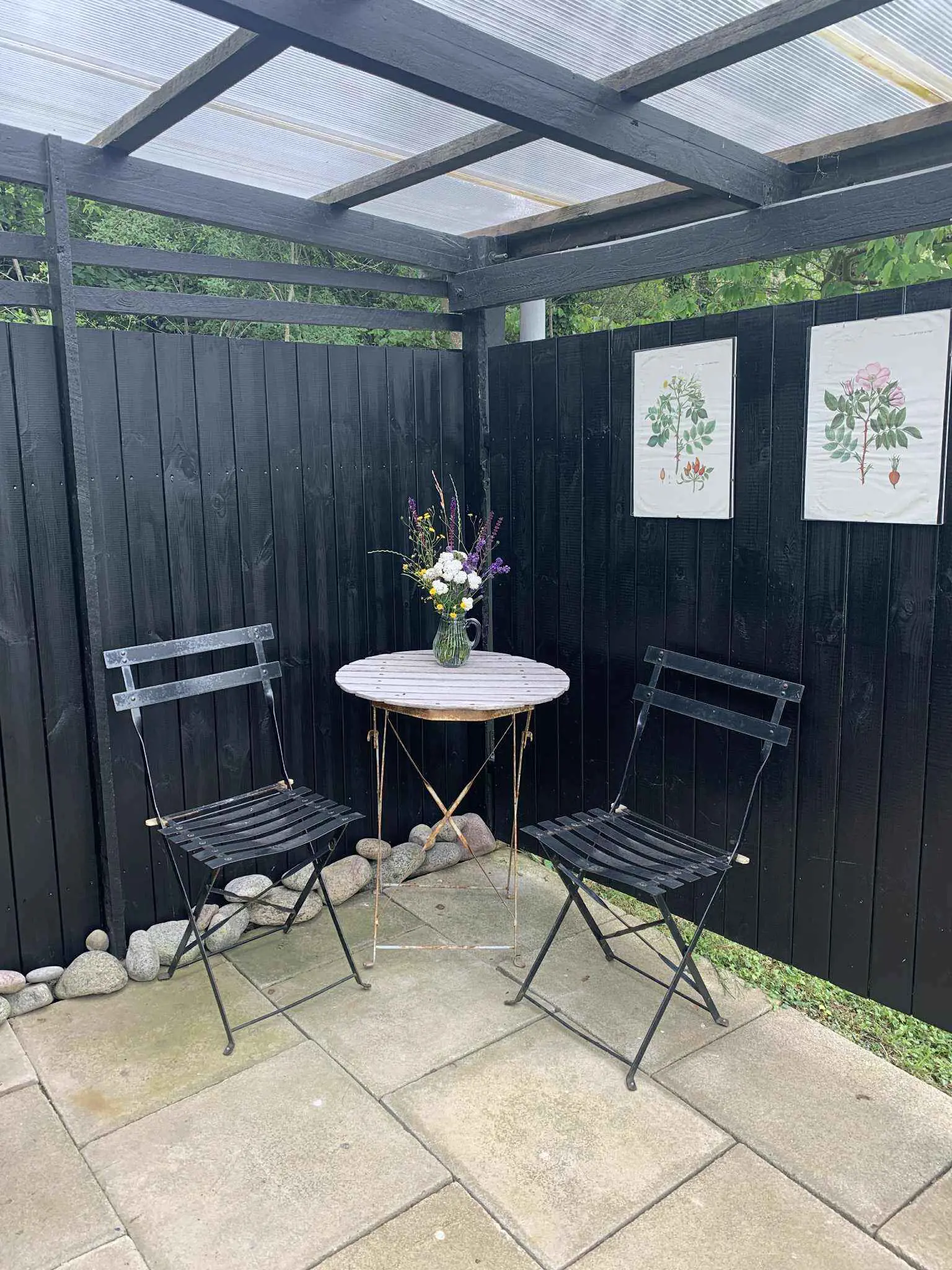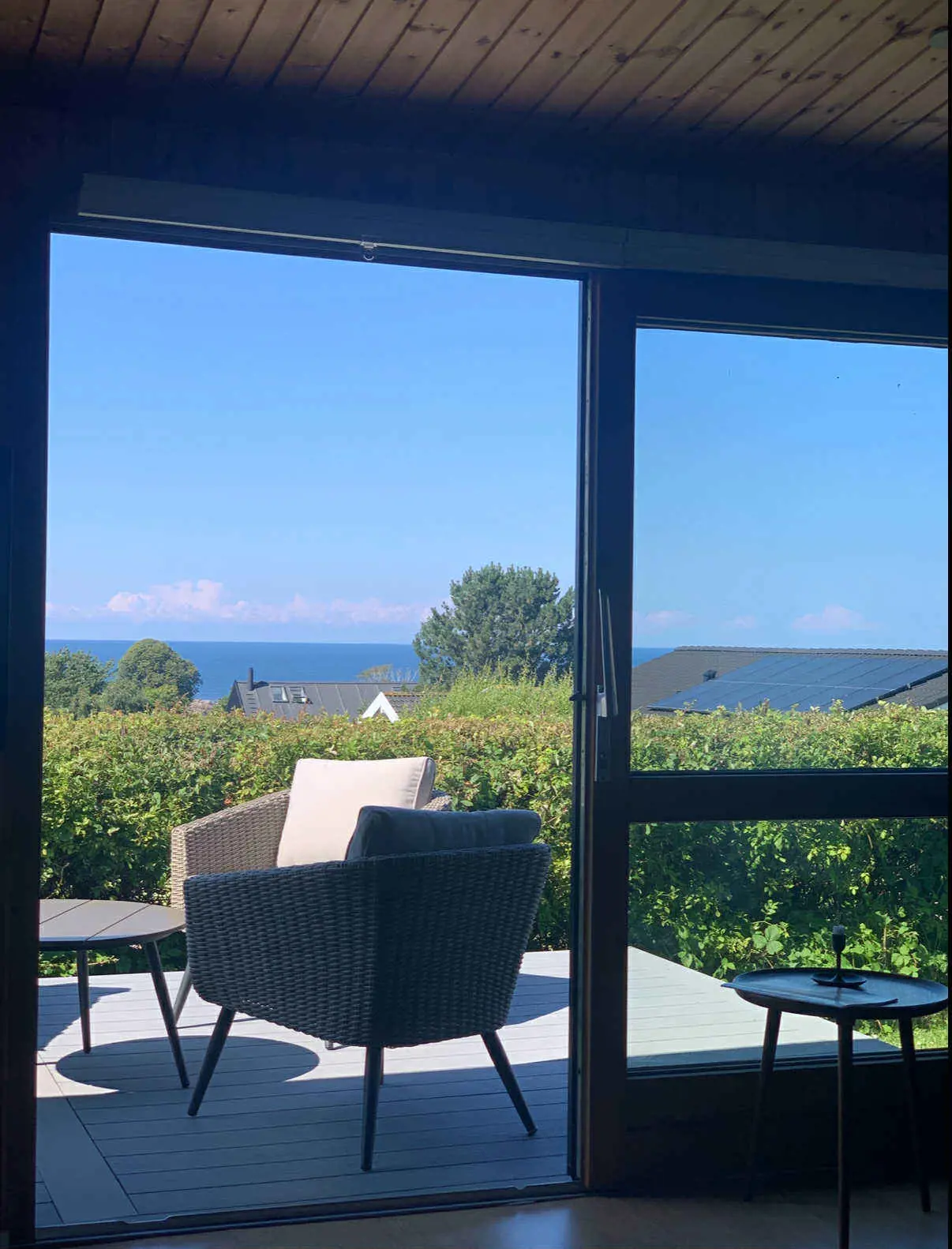 Von der Terrasse genießen Sie den Blick auf die Ostsee und die markante Felsenlandschaft Nordbornholms bei Hammerknuden – ideal für ruhige Morgenstunden und entspannte Abende.