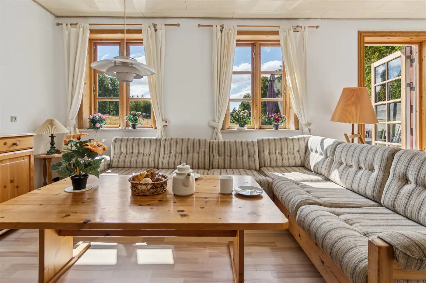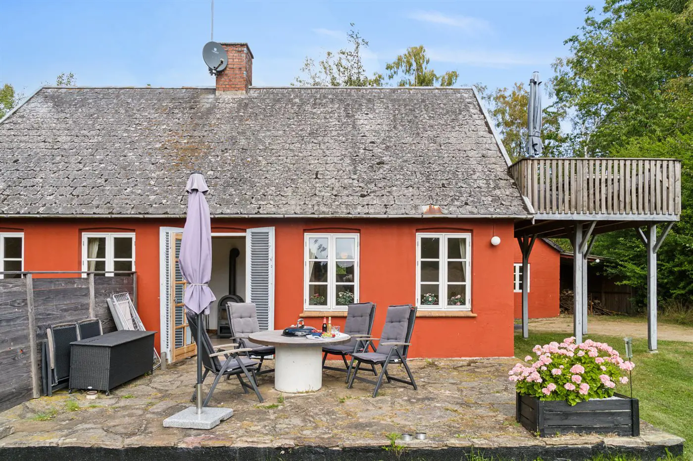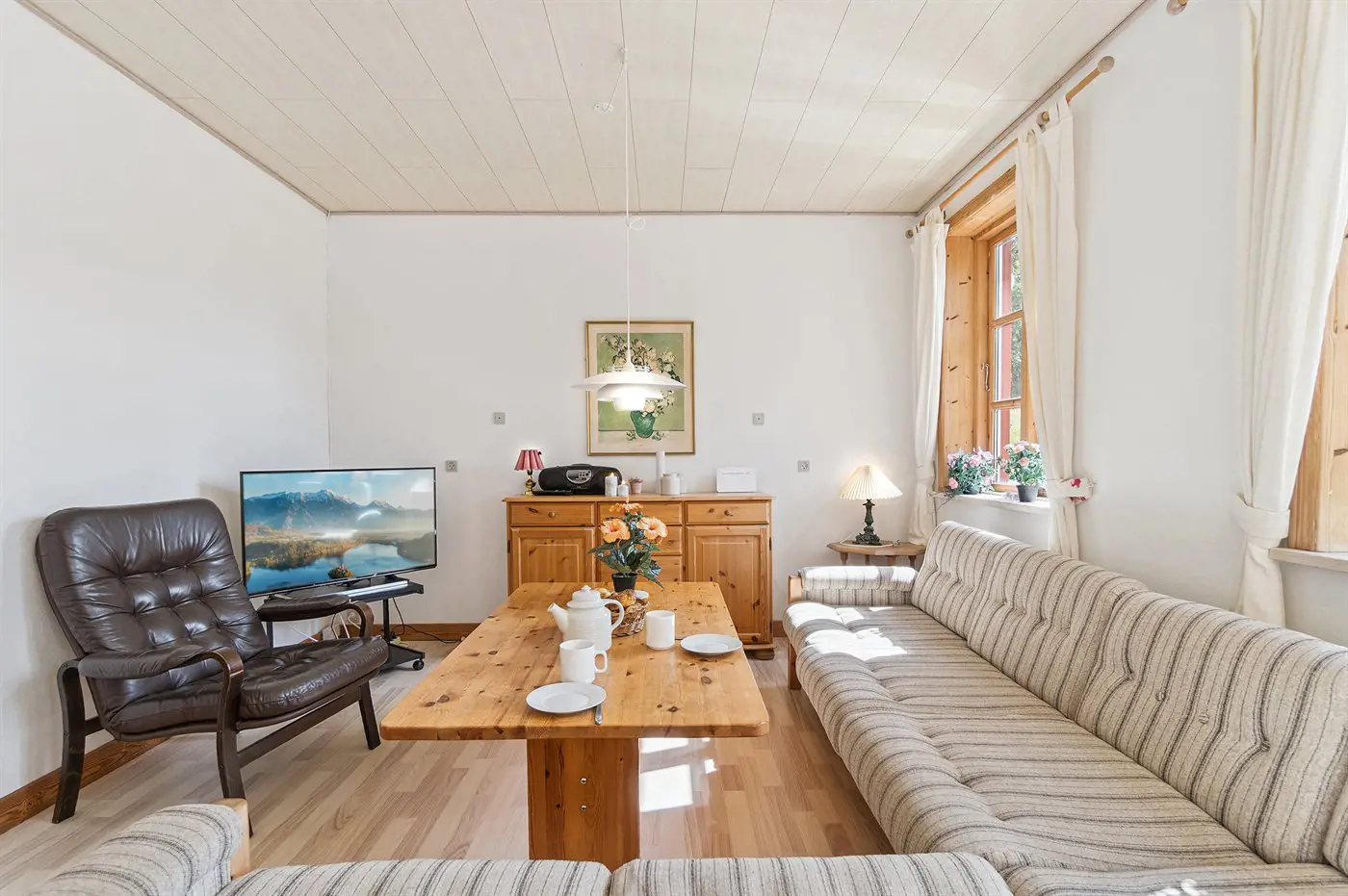 Das Haus erstreckt sich über zwei Etagen, und im Gästehaus auf der anderen Seite des Hofes befindet sich ein neuer Schlafbereich. Wenn ihr Ruhe und Erholung sucht, dann ist dieses Haus genau das Richtige – abgeschieden, und dennoch nicht weit von Årsdale oder Svaneke entfernt.