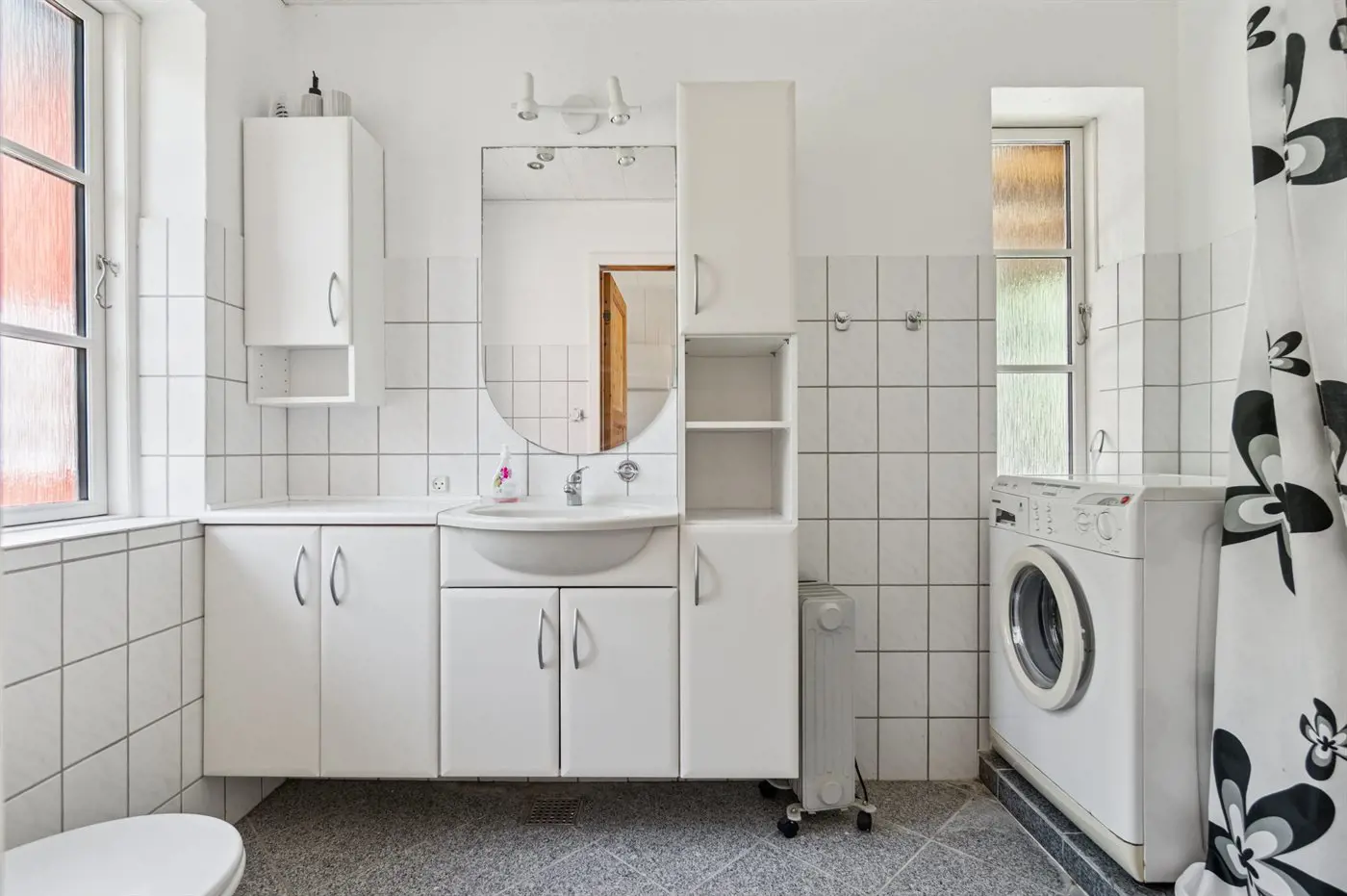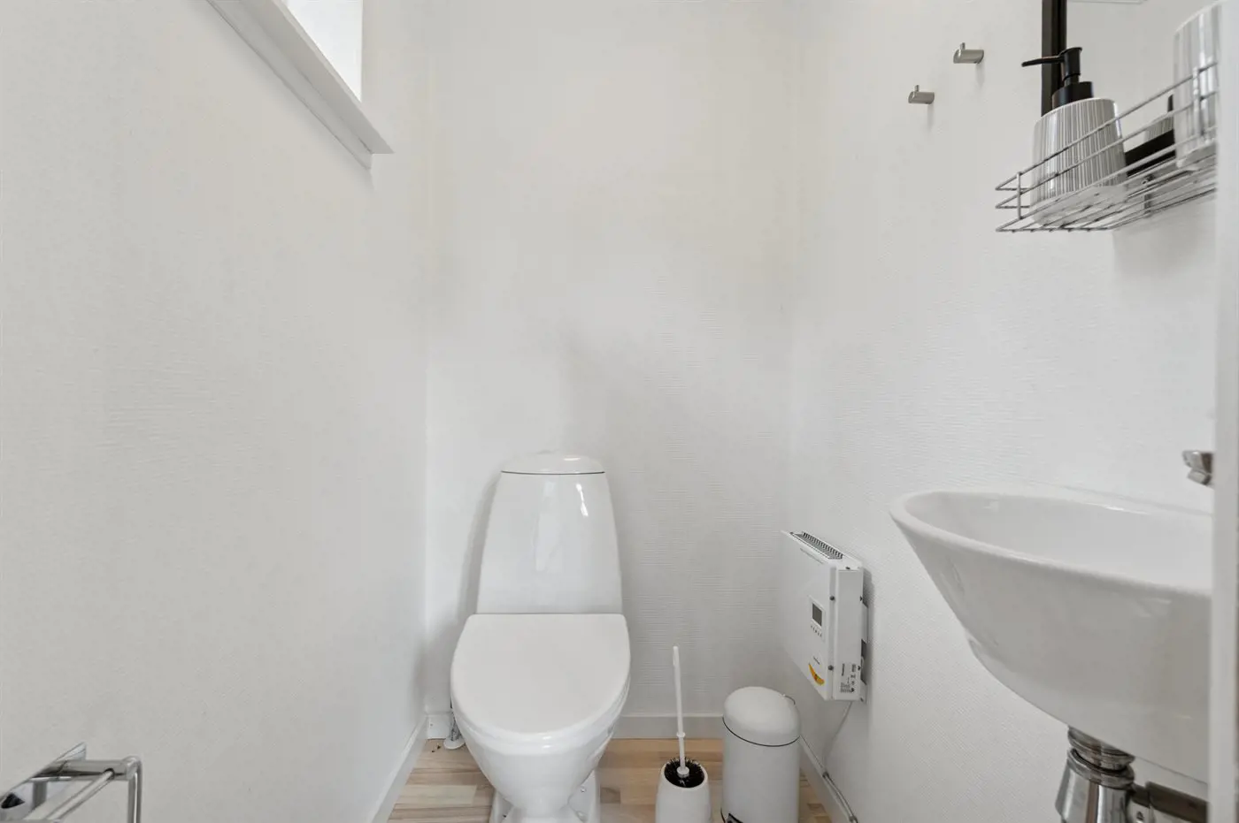 Es gibt 1 Badezimmer mit Duschnische und 2 Toiletten, davon 1 Gästetoilette. Fußbodenheizung in 1 Badezimmer.