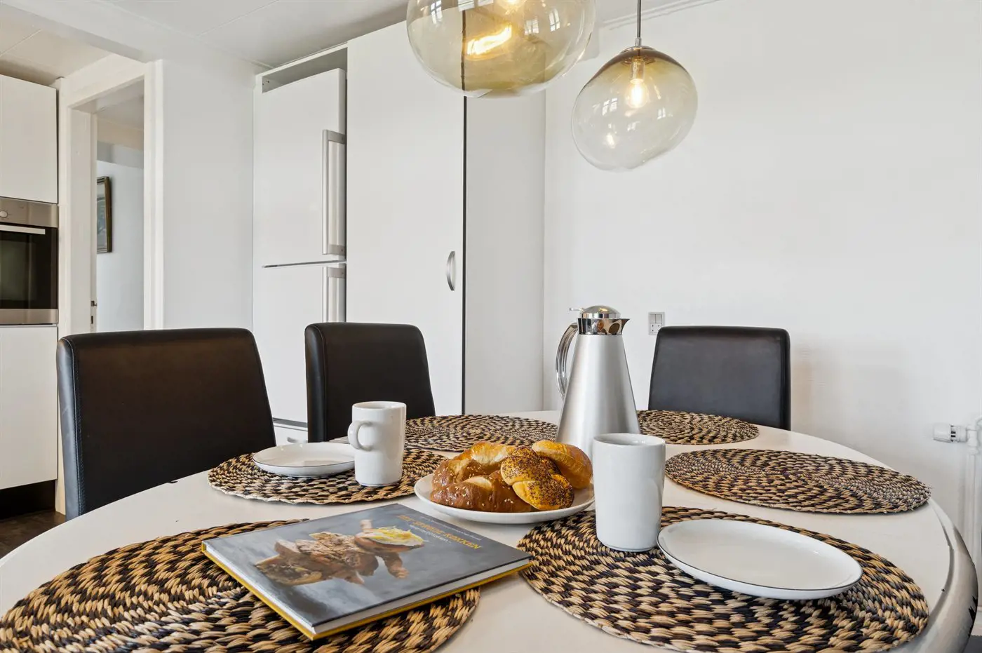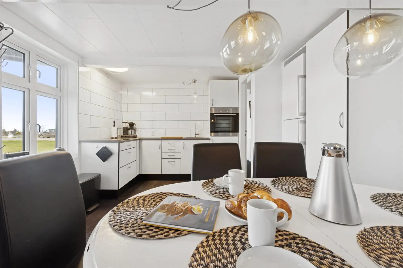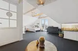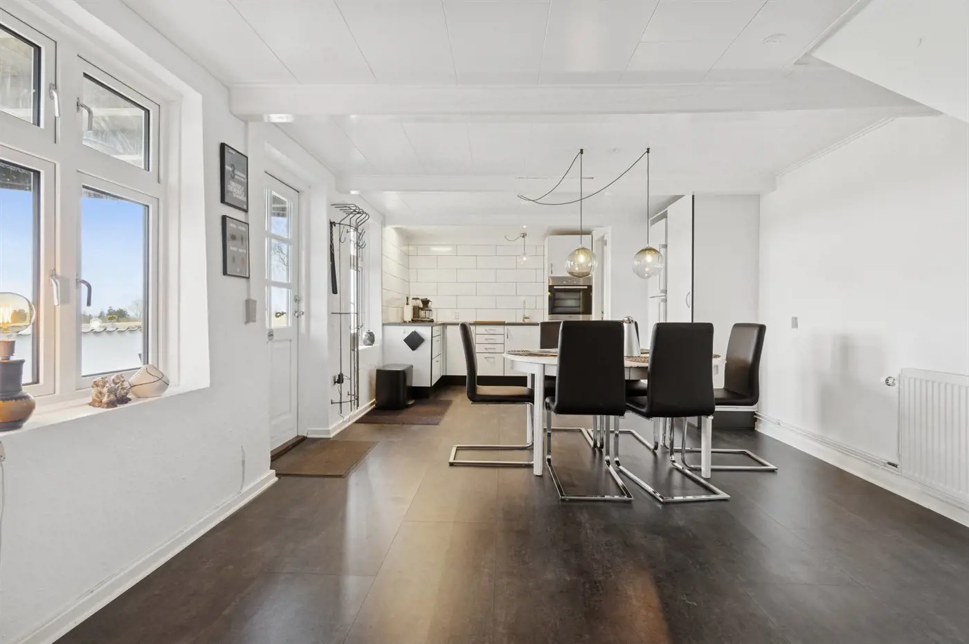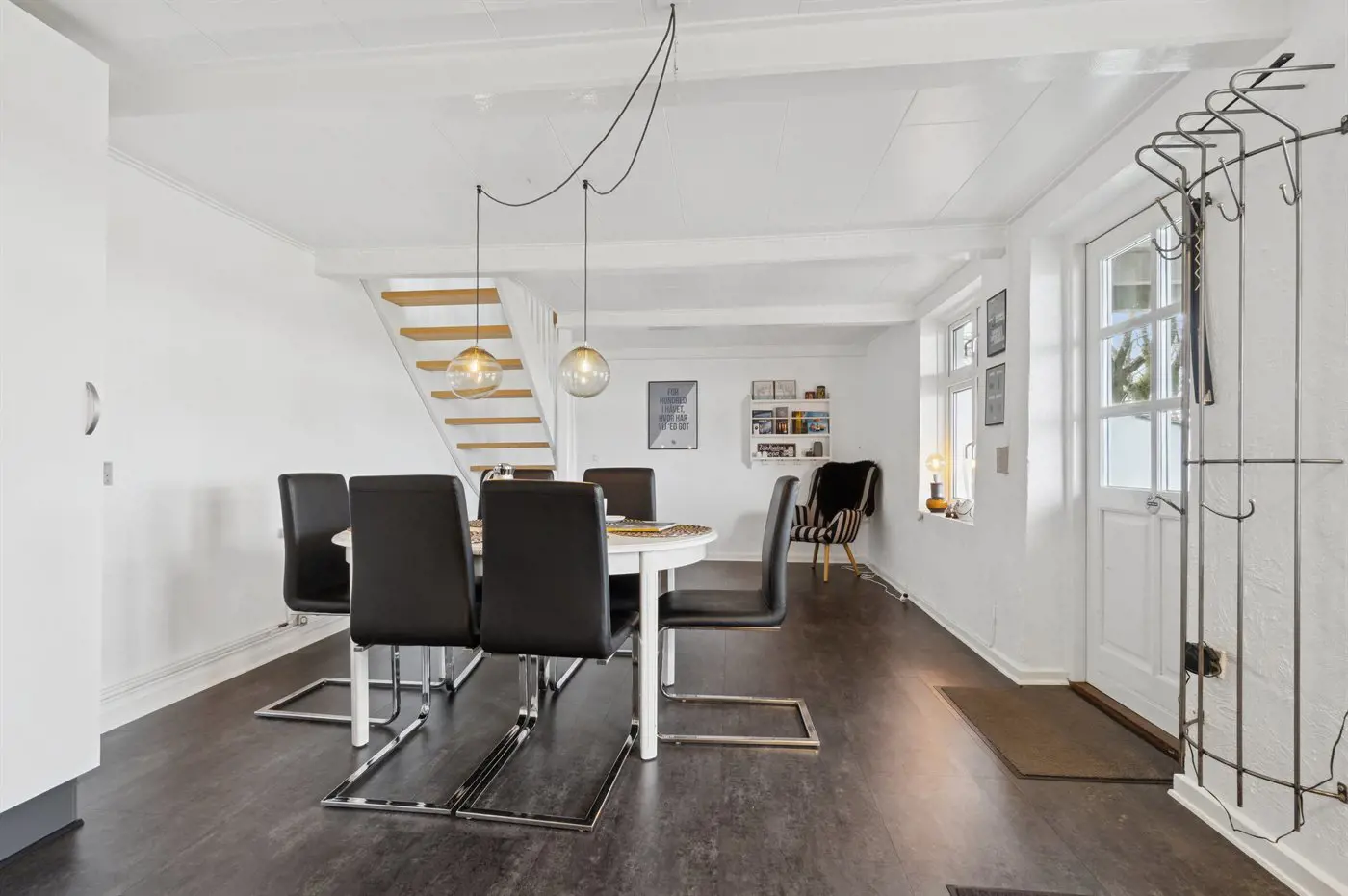 Die Einrichtung mit weißen Decken, hellen Wänden und Böden schafft eine einladende Atmosphäre, und die sorgfältig ausgewählten Möbel und Materialien vermitteln ein Gefühl von Ruhe und Komfort.