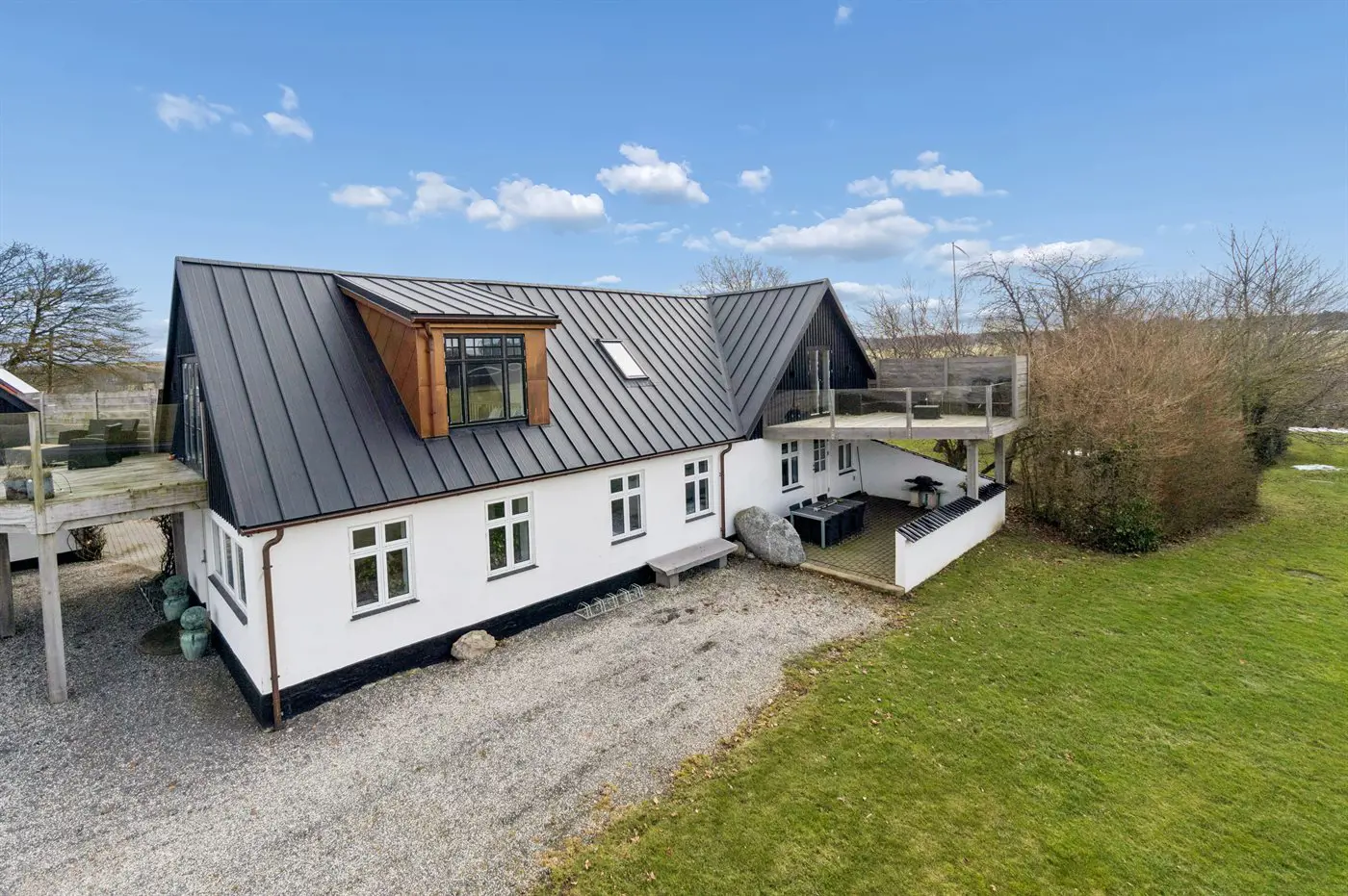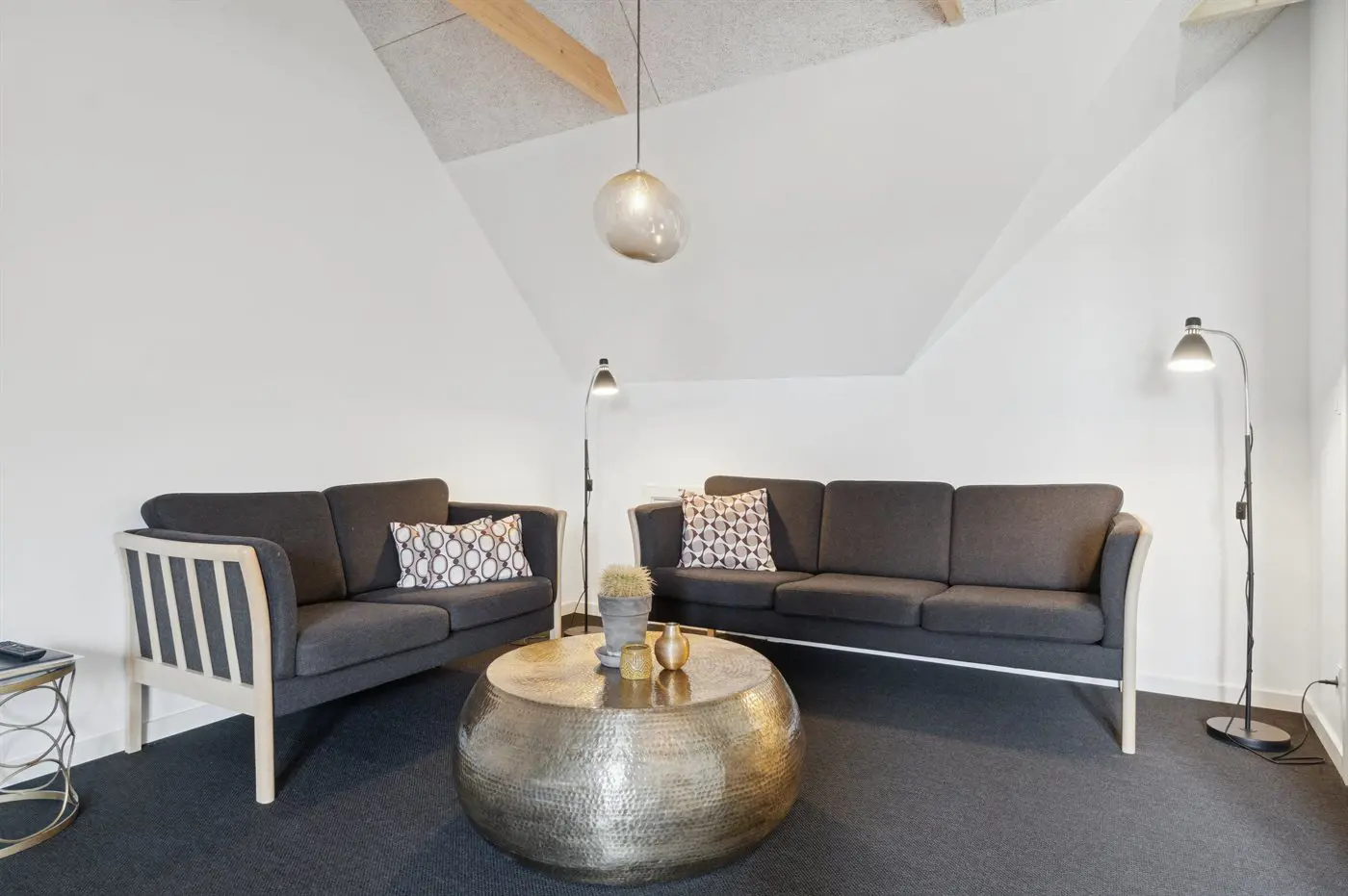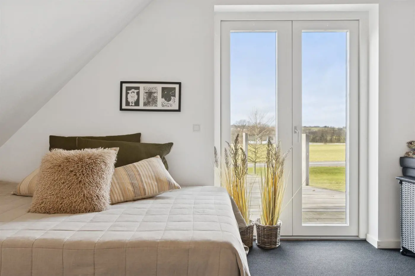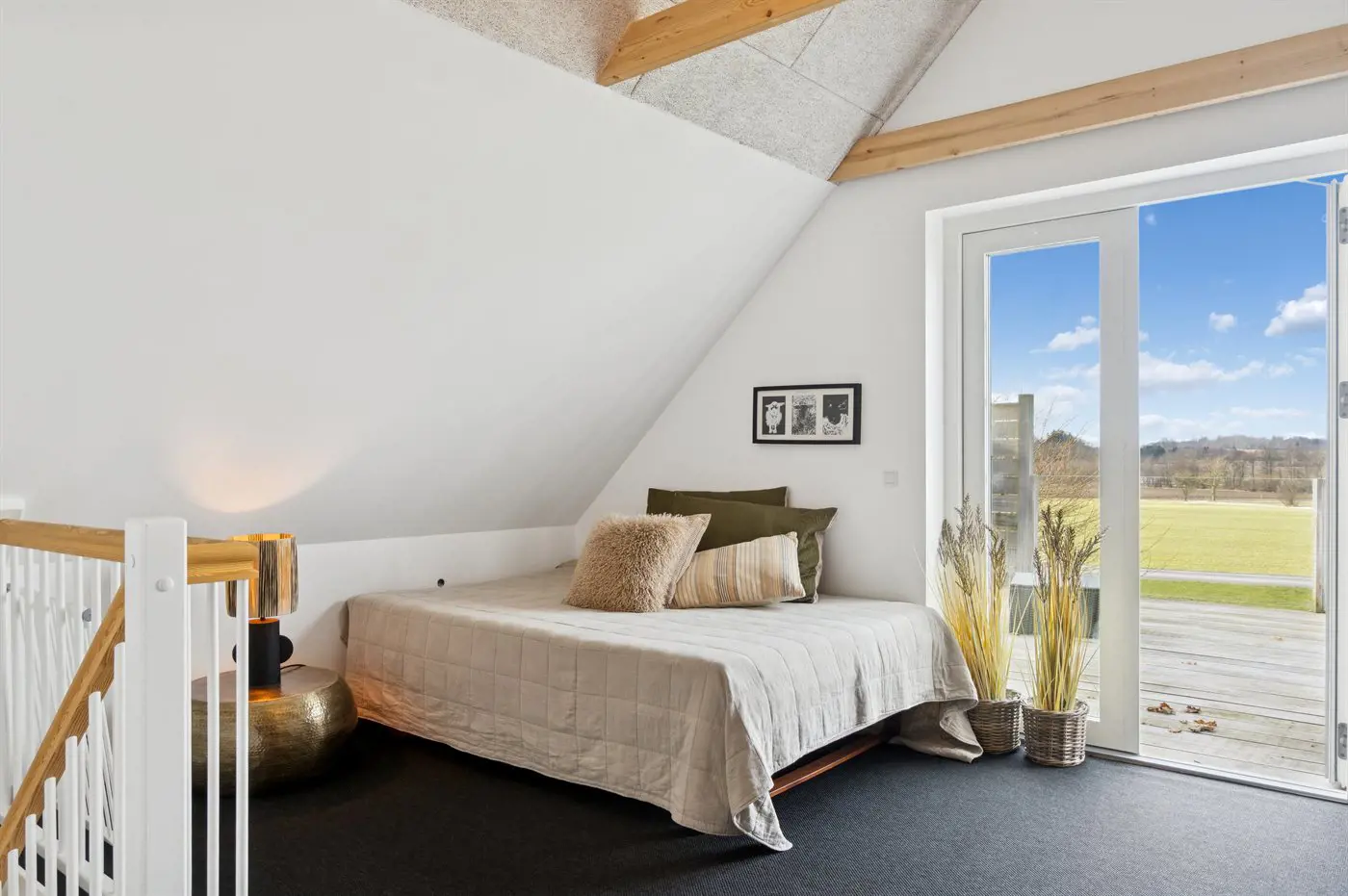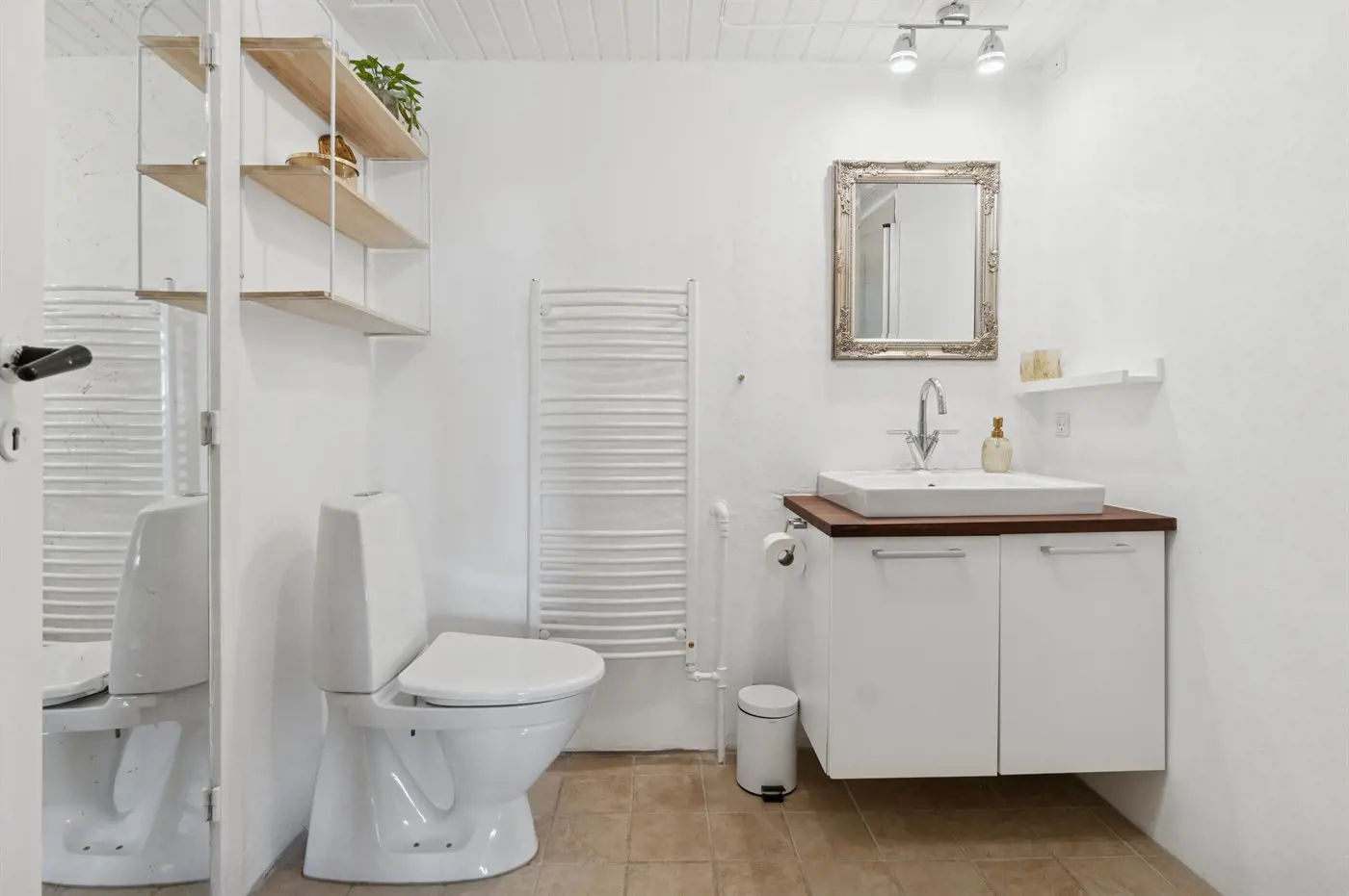 Die Einrichtung mit weißen Decken, hellen Wänden und Böden schafft eine einladende Atmosphäre, und die sorgfältig ausgewählten Möbel und Materialien vermitteln ein Gefühl von Ruhe und Komfort.