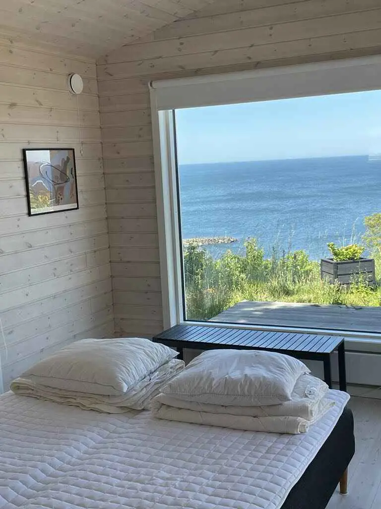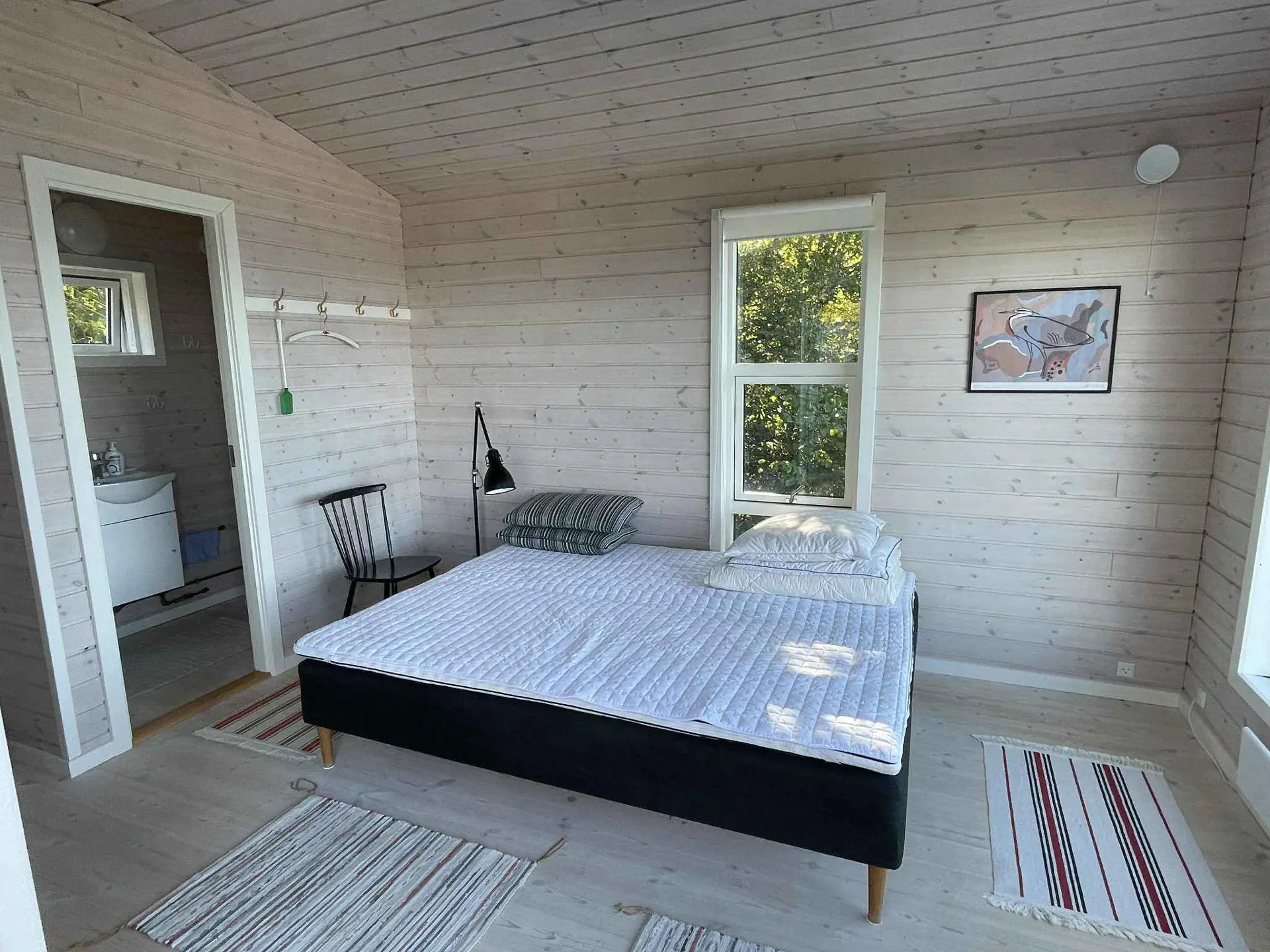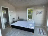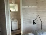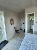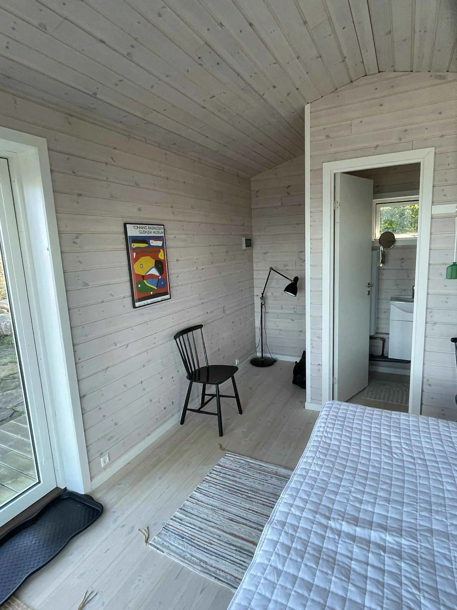 Das Haus verfügt über ein Schlafzimmer mit Doppelbett, ein Zimmer mit Etagenbetten, ein Wohnzimmer, eine Küche sowie eine Toilette mit Waschbecken. Die Küche ist eine klassische Ferienhausküche mit Patina und allem Notwendigen zum Kochen – ohne überflüssigen Schnickschnack.