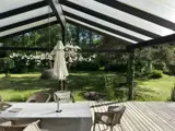 Der Außenbereich lädt zum Verweilen ein. Die große überdachte Terrasse dient als zusätzlicher Wohnraum, und die Außenküche macht lange Sommerabende im Freien besonders angenehm. Der Garten bietet Ruhe und Entspannung. Haustiere sind nicht erlaubt, was zu einer sauberen und ruhigen Umgebung beiträgt.