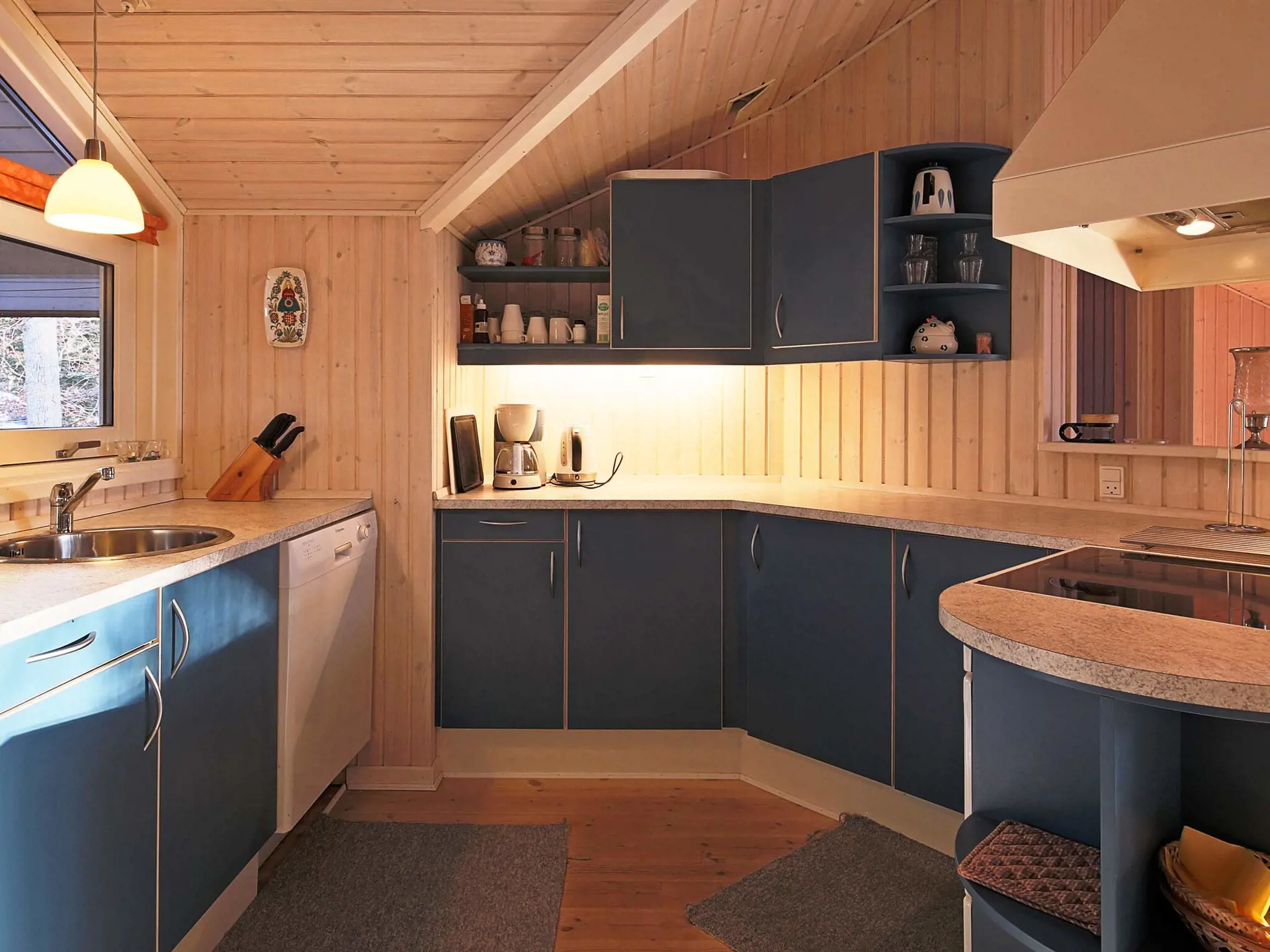 Ferienhaus in attraktiver Umgebung bei Asserbo. Innen schöne Wohnküche mit Zugang zur teilweise überdachten Terrasse und weiter zum Grundstück mit viel Platz zum Entspannen und Spielen.