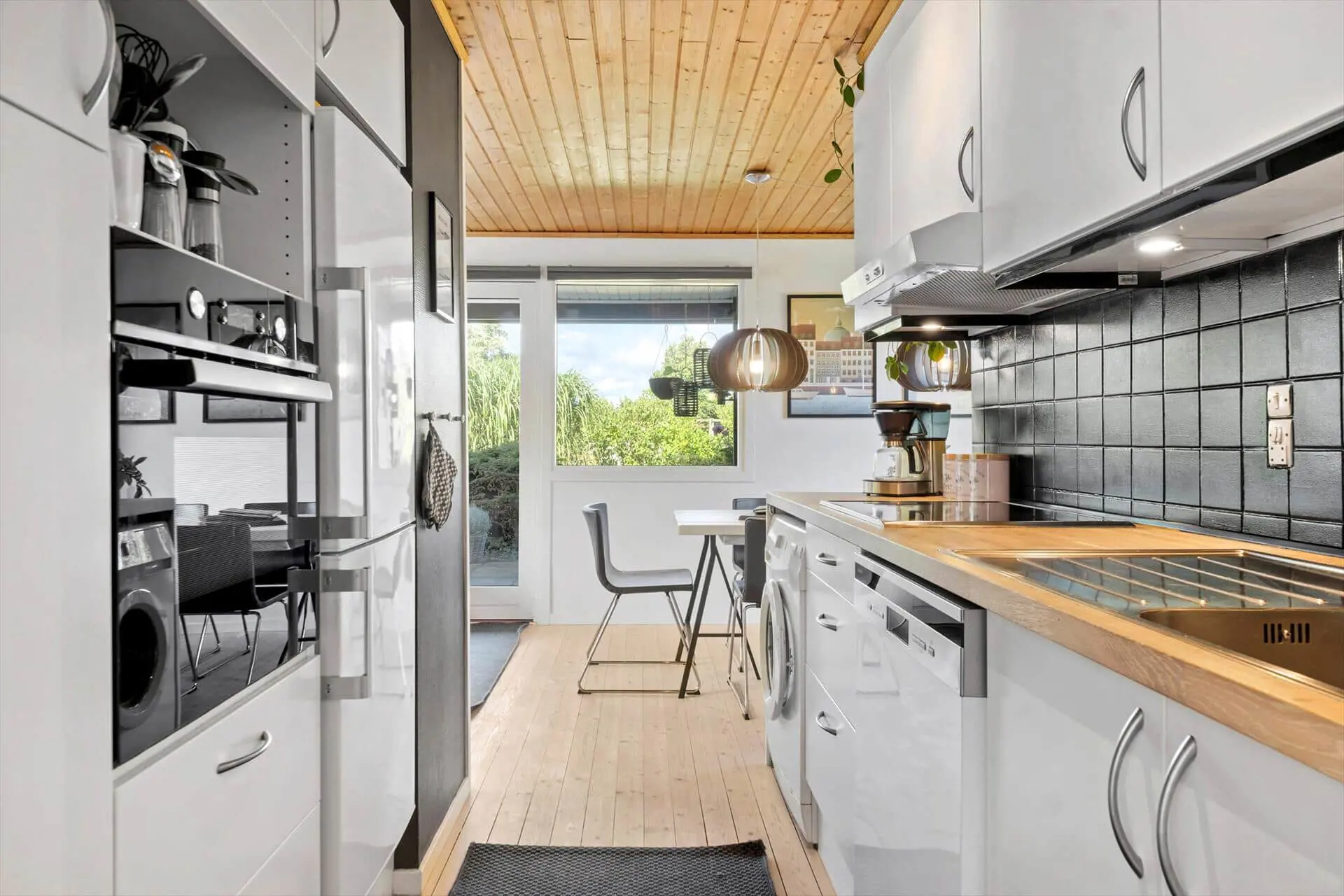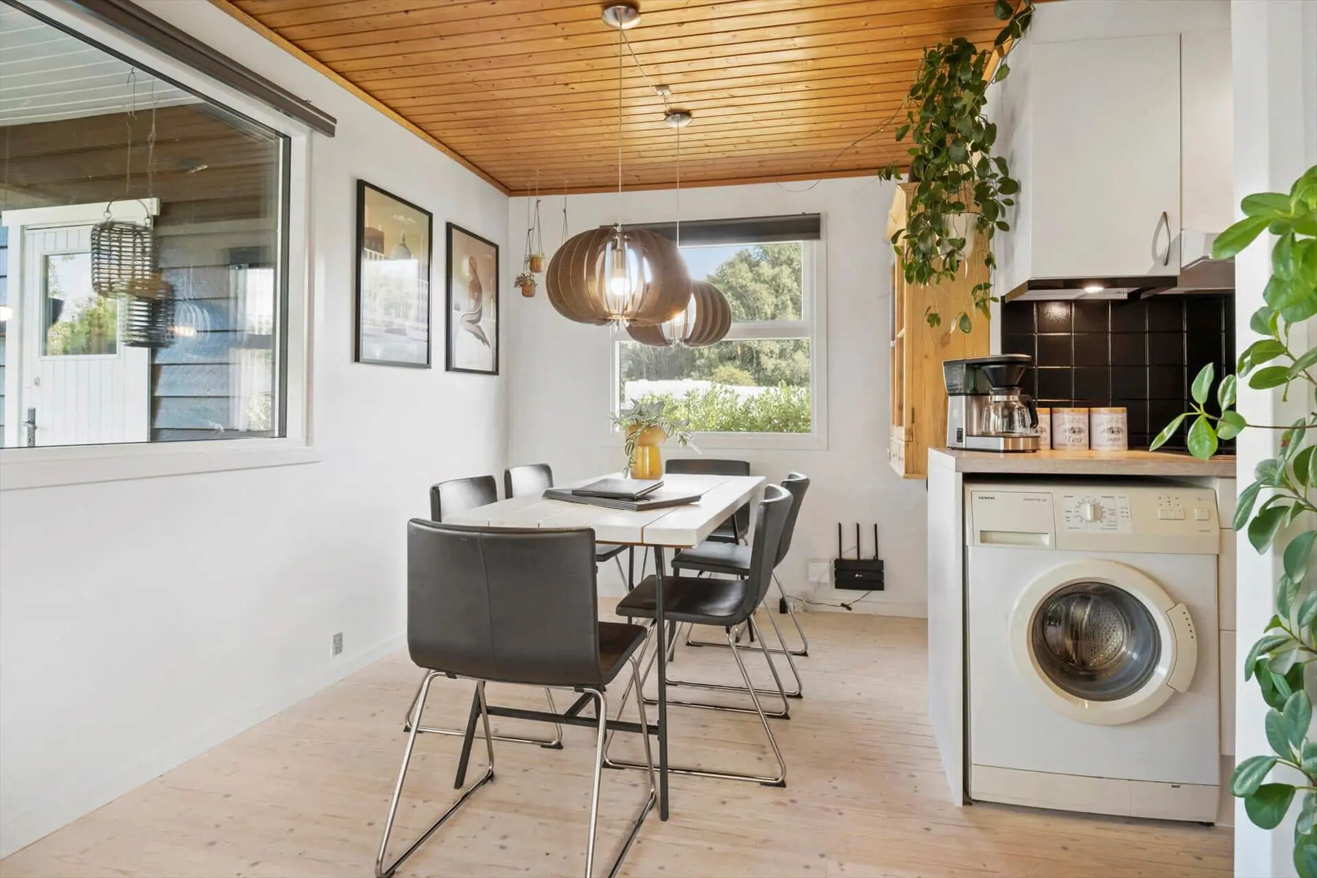 Schönes, helles Ferienhaus, in dem sich alle Aktivitäten im offenen Wohnzimmer-Küchen-Essbereich mit fantastischem Blick auf den ungestörten Garten abspielen. Im Wohnzimmer gibt es eine gemütliche Ecke mit Sofagarnitur und großem Fernseher.