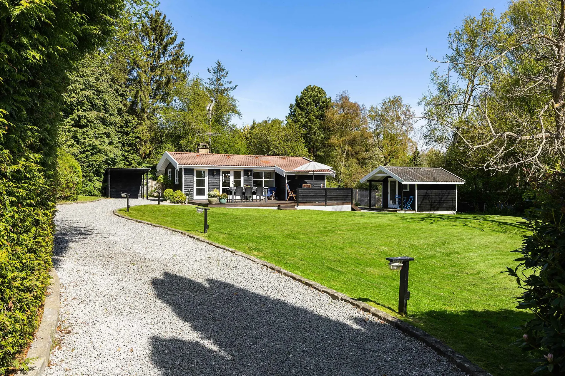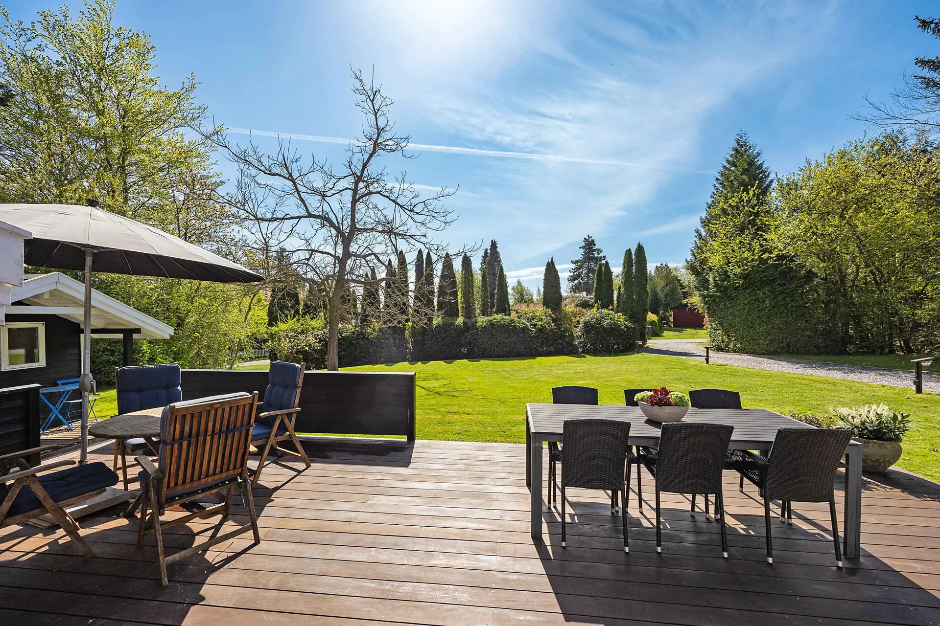 Draußen stehen eine große Holzterrasse mit Essbereich und Liegestühlen sowie eine weitläufige Rasenfläche zur Verfügung – viel Platz zum Spielen und Entspannen.