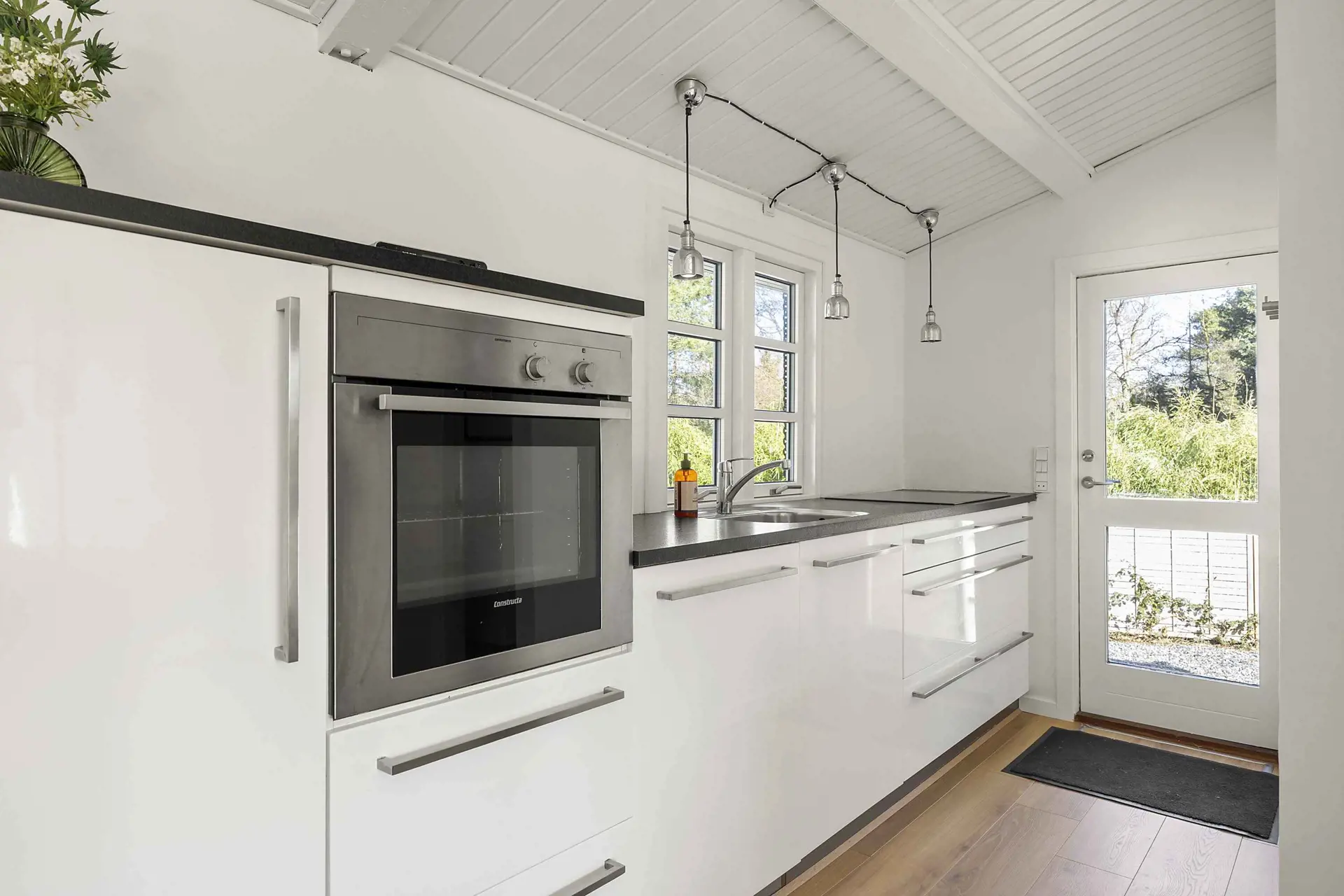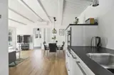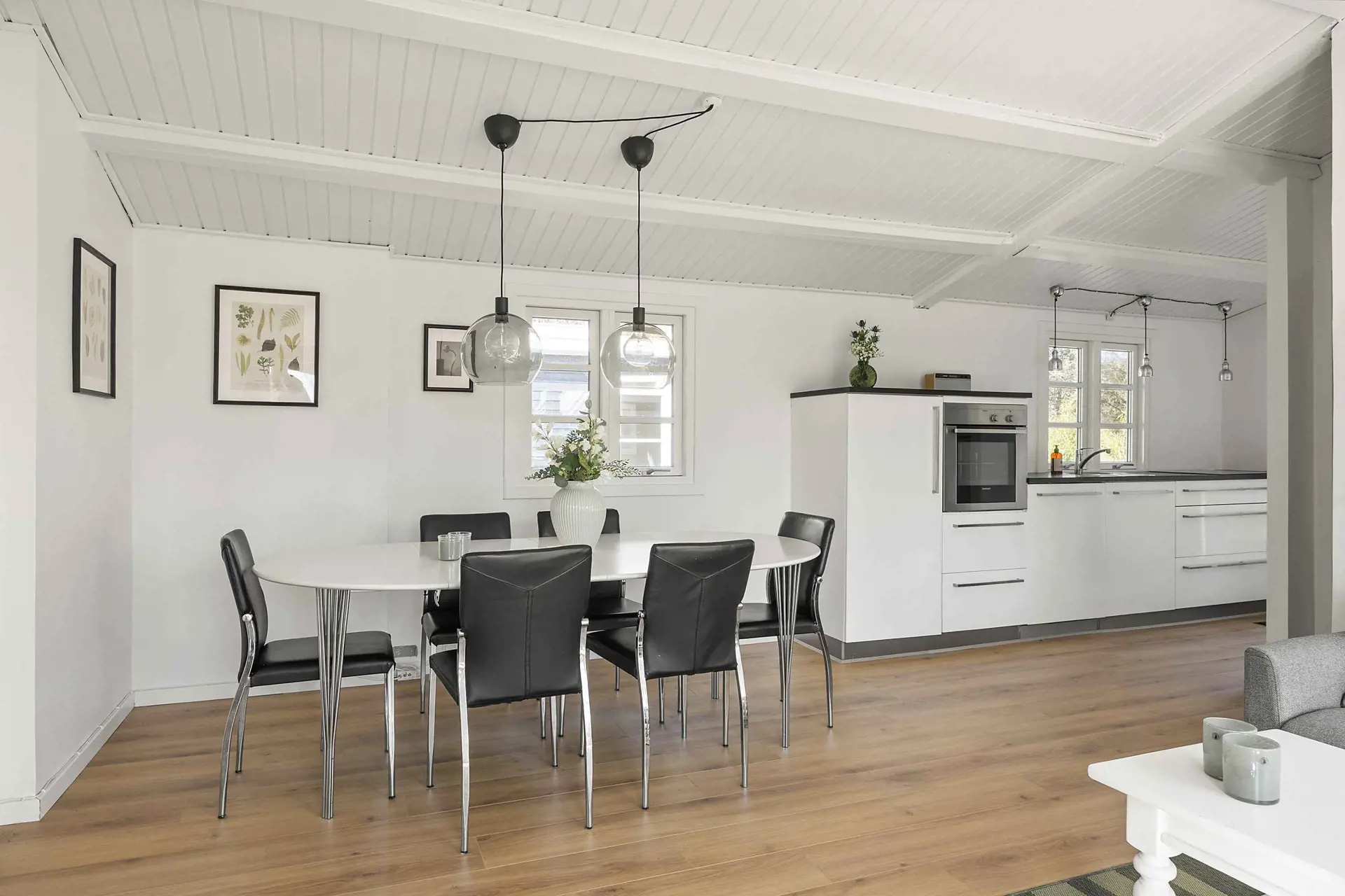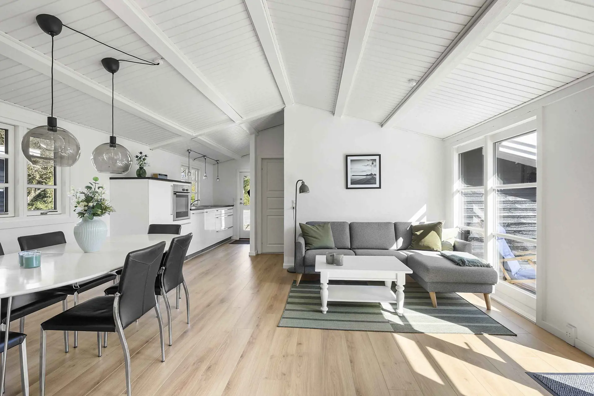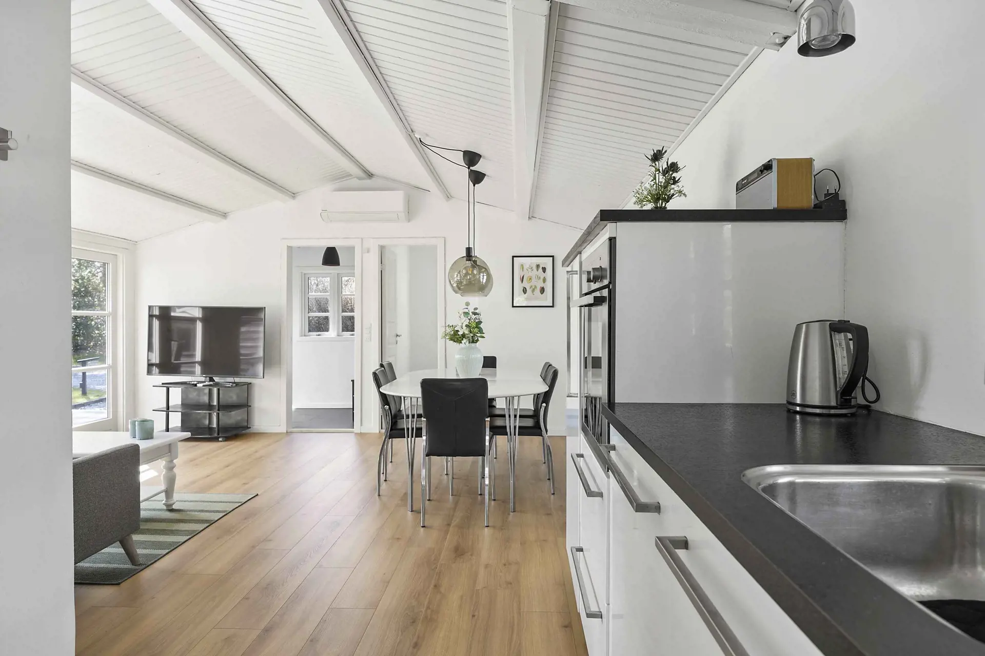 Das Haupthaus bietet eine helle und funktionale Einrichtung mit geräumigem Wohnzimmer und offener Küche, in der große Fenster den Blick in den Garten freigeben. Ideal für gemeinsame Mahlzeiten und entspannte Stunden.