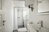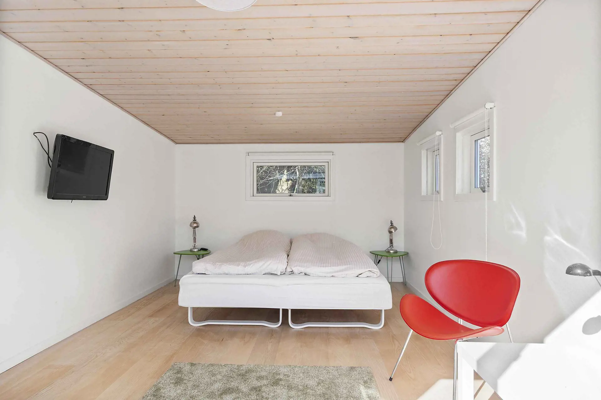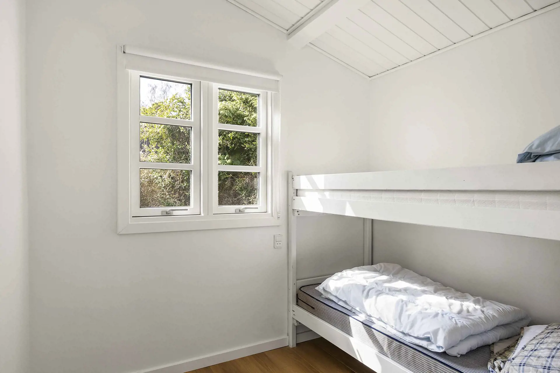 Es gibt zwei Schlafzimmer: ein Kinderzimmer mit Etagenbett (190 cm) und ein Schlafzimmer mit Doppelbett sowie ein helles Badezimmer im klassischen nordischen Stil.