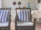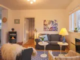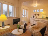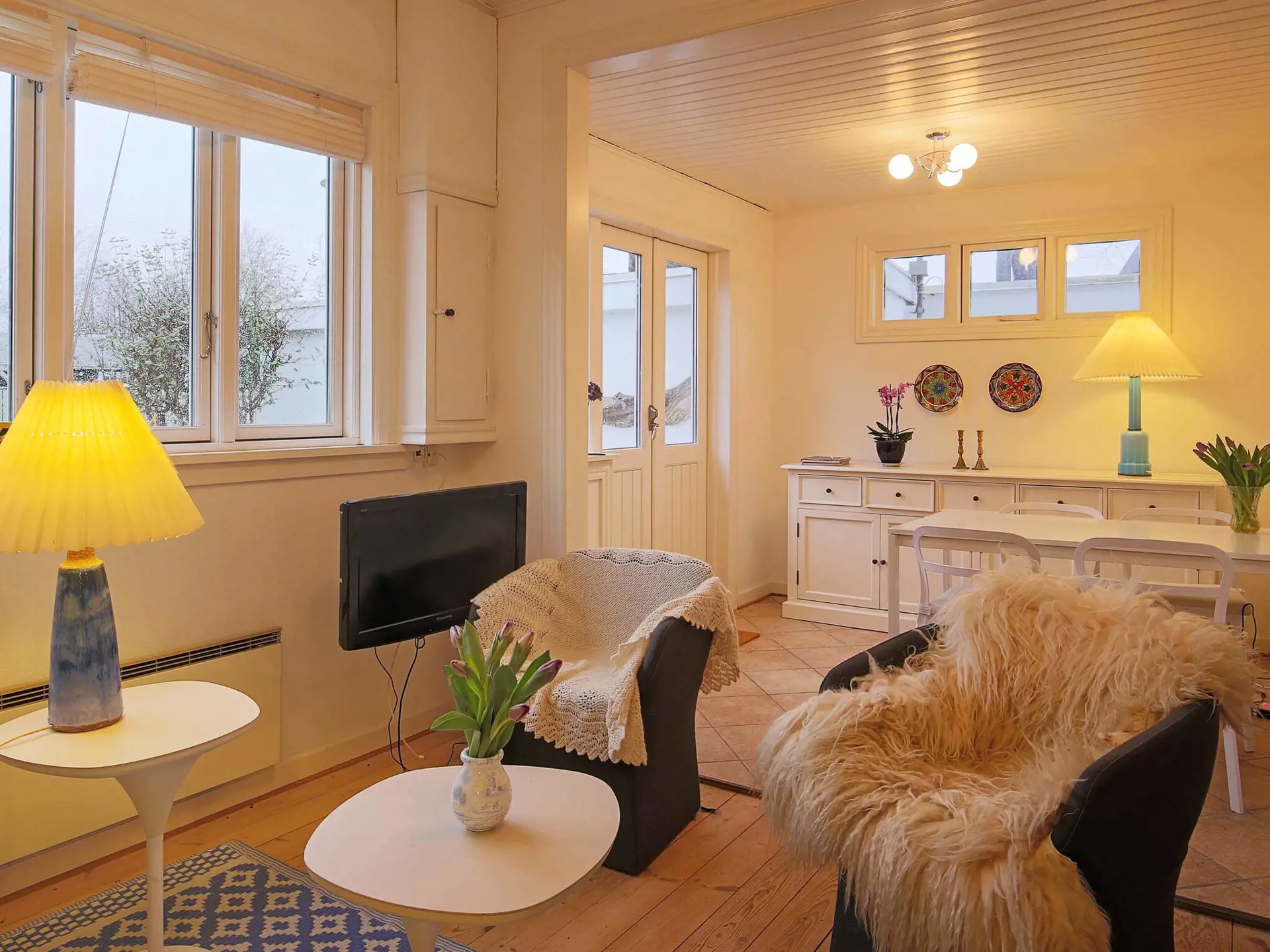 Innen gemütliches Wohn-/Esszimmer mit WLAN und Fernseher ohne Senderempfang, dafür mit Chromecast zum Streamen eigener TV-Anbieter. Für kühlere Tage stehen ein Holzofen sowie eine energieeffiziente Luft-Luft-Wärmepumpe zur Verfügung. Separate Küche mit Cerankochfeld, Dunstabzugshaube, Kühl-/Gefrierschrank, Kaffeemaschine und Geschirrspüler. Außerdem zwei Schlafzimmer im Haus, beide mit jeweils einem Doppelbett. Badezimmer mit Dusche/WC und angenehmer Fußbodenheizung. Waschmaschine im praktischen Hauswirtschaftsraum mit Zugang von außen.