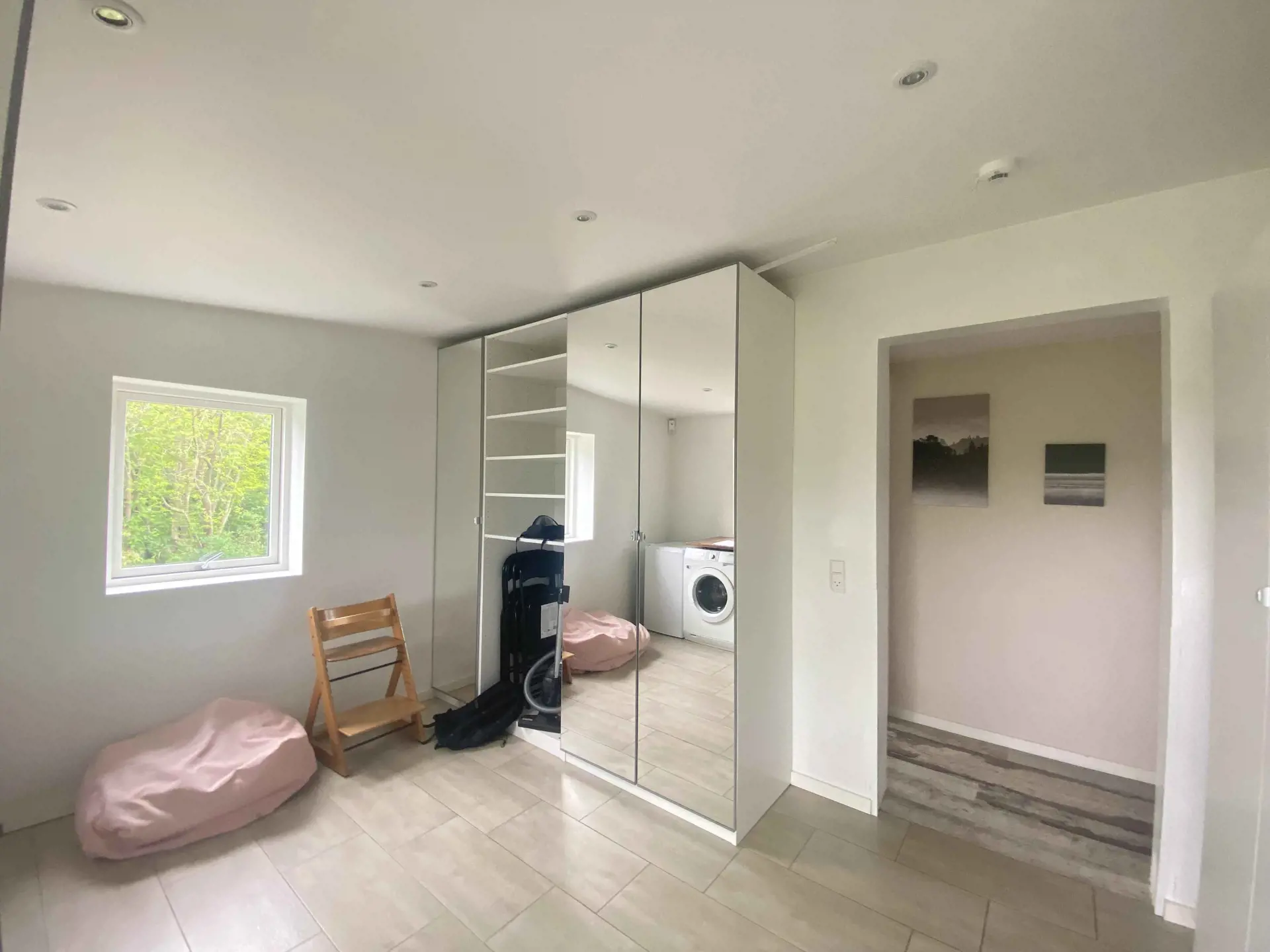 Badezimmer mit Schränken, Dusche, WC und Fußbodenheizung. Es gibt eine Waschmaschine und einen Trockner im Haus.