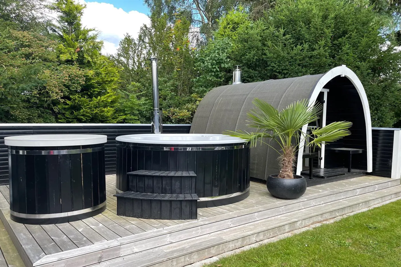 Draußen erwartet dich ein schöner Garten mit mehreren Terrassen, auf denen du die Sonne von morgens bis abends in ruhiger, grüner Umgebung genießen kannst. Als besonderes Highlight verfügt das Haus über einen eigenen privaten Spa-Bereich mit holzbefeuerter Sauna, Hot Tub (Wildnisbad), Kaltwasserbecken und Außendusche – die perfekte Art, nach einem Tag am Meer zu entspannen.