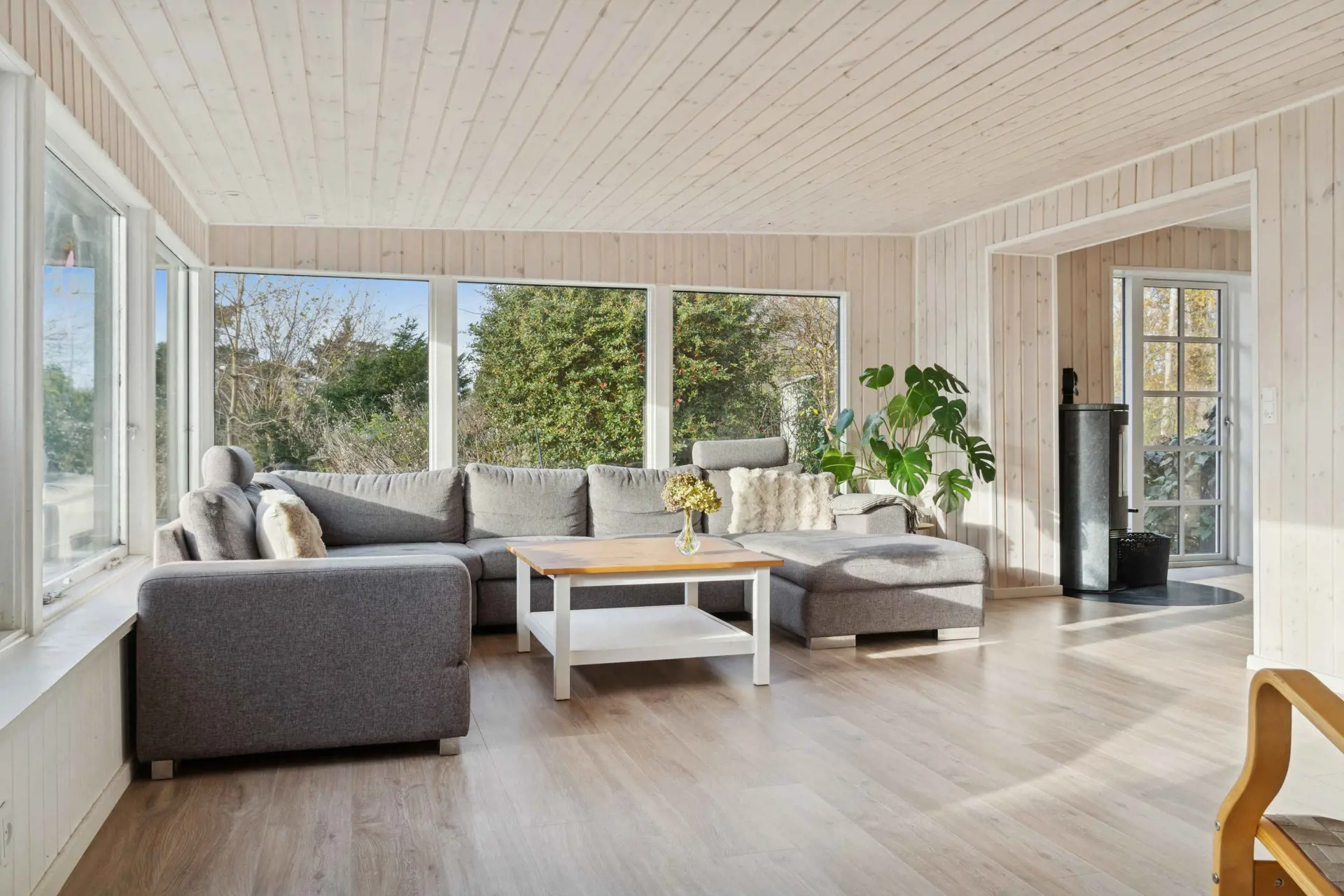 Das Wohnzimmer verfügt über ein großes Sofa, auf dem alle maximal entspannen können. Die vielen Fenster sorgen für schönes Licht und eine offene Atmosphäre, bei der die Natur stets präsent bleibt.